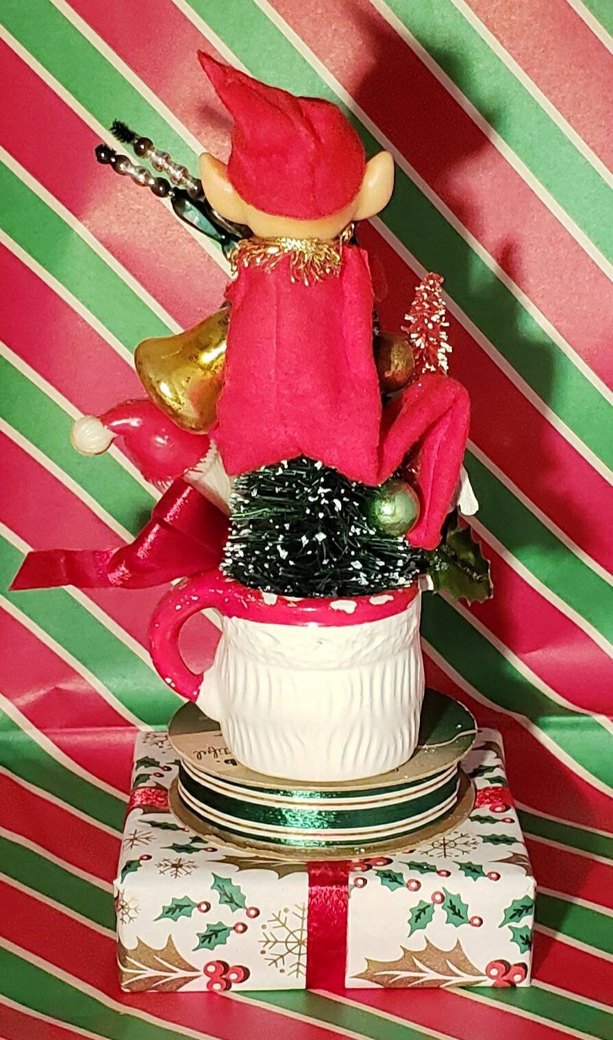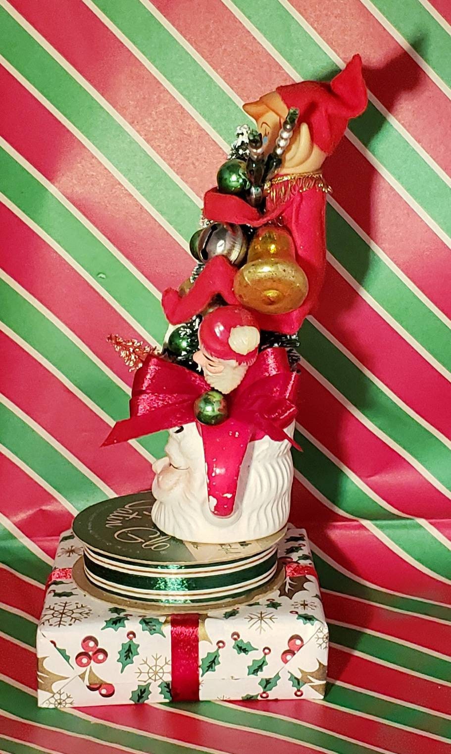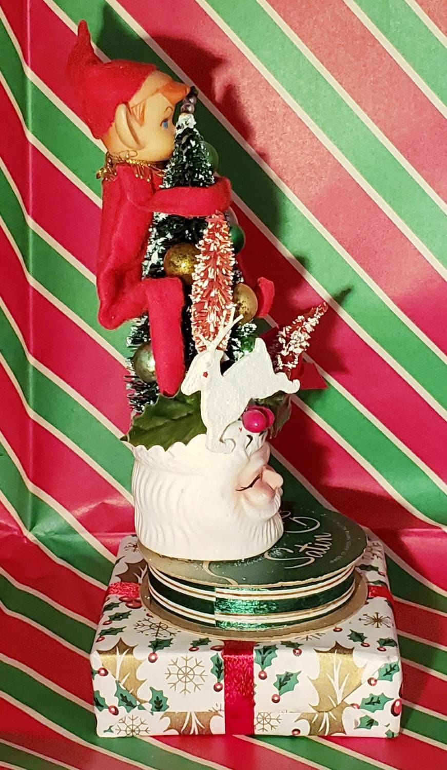 This small vintage Santa mug is filled with a little bottle brush tree a vintage felt elf and trimmed with antique and vintage bits and pieces. All sprinkled with old mica flakes. The base is a vintage ribbon spool .