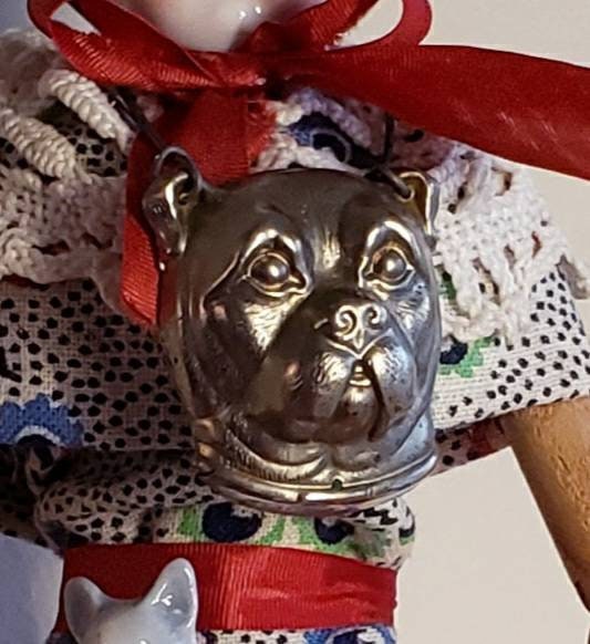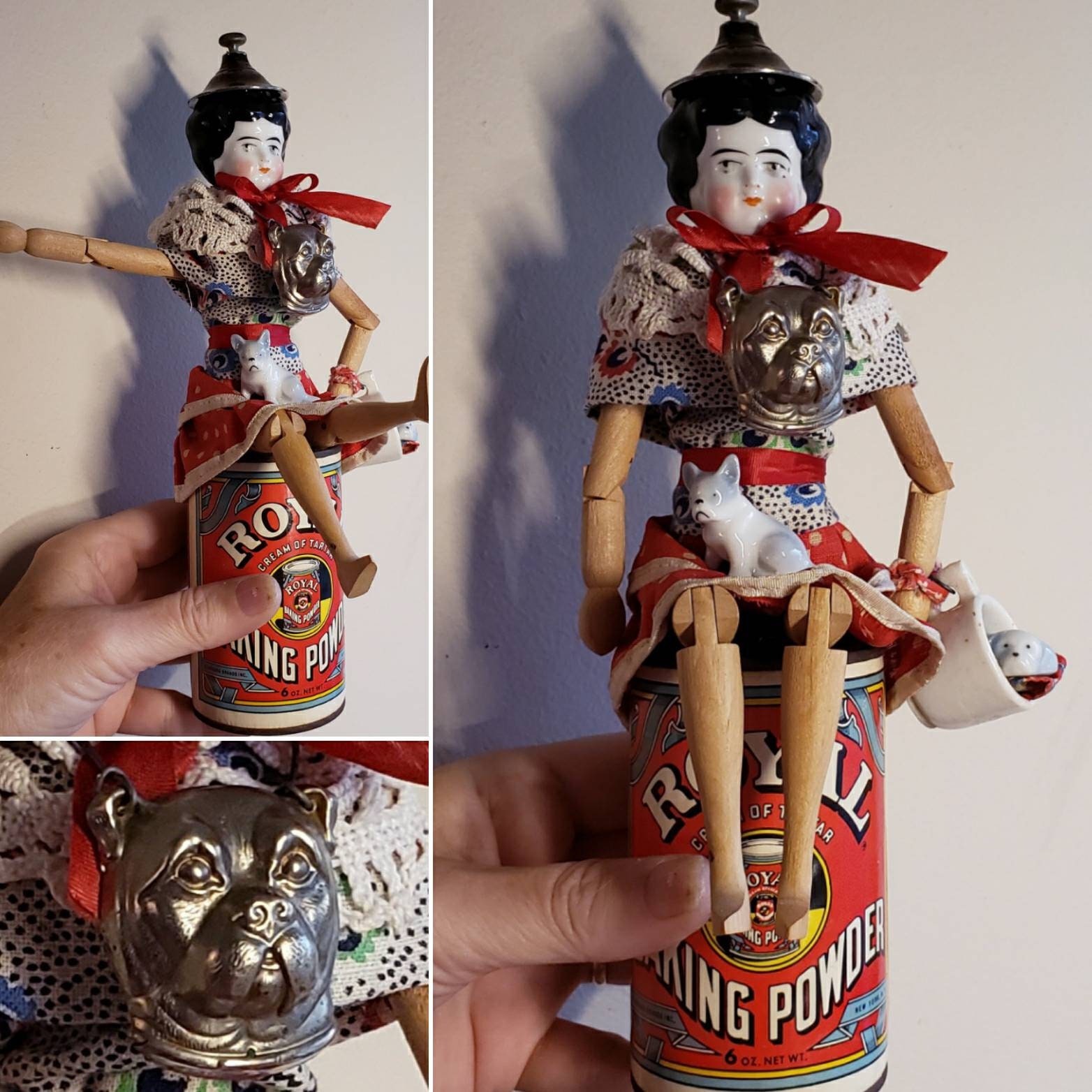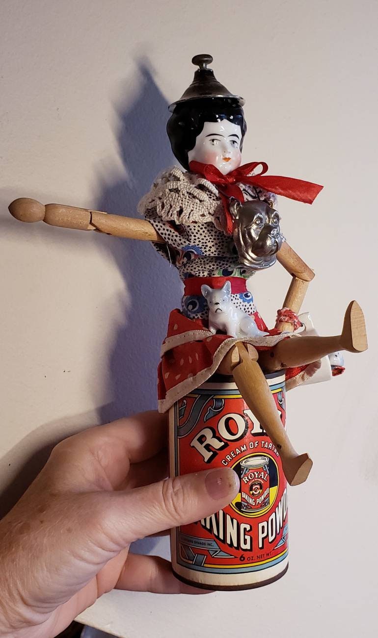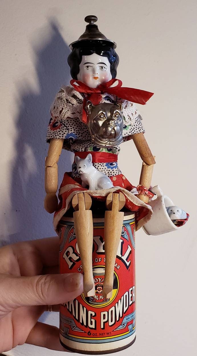 This is a very fun doll that I created using a wooden articulated doll body. Her clothing I fashioned from other vintage doll clothes, trims,and bits and pieces. The metal dog face is actually part of a latch to an old antique box that I turned into a mask for her. Her hat is a lid from a vintage silver plate pitcher. She has two little ceramic dog friends. She sits at top a Royal baking powder tin.10" tall , signed .