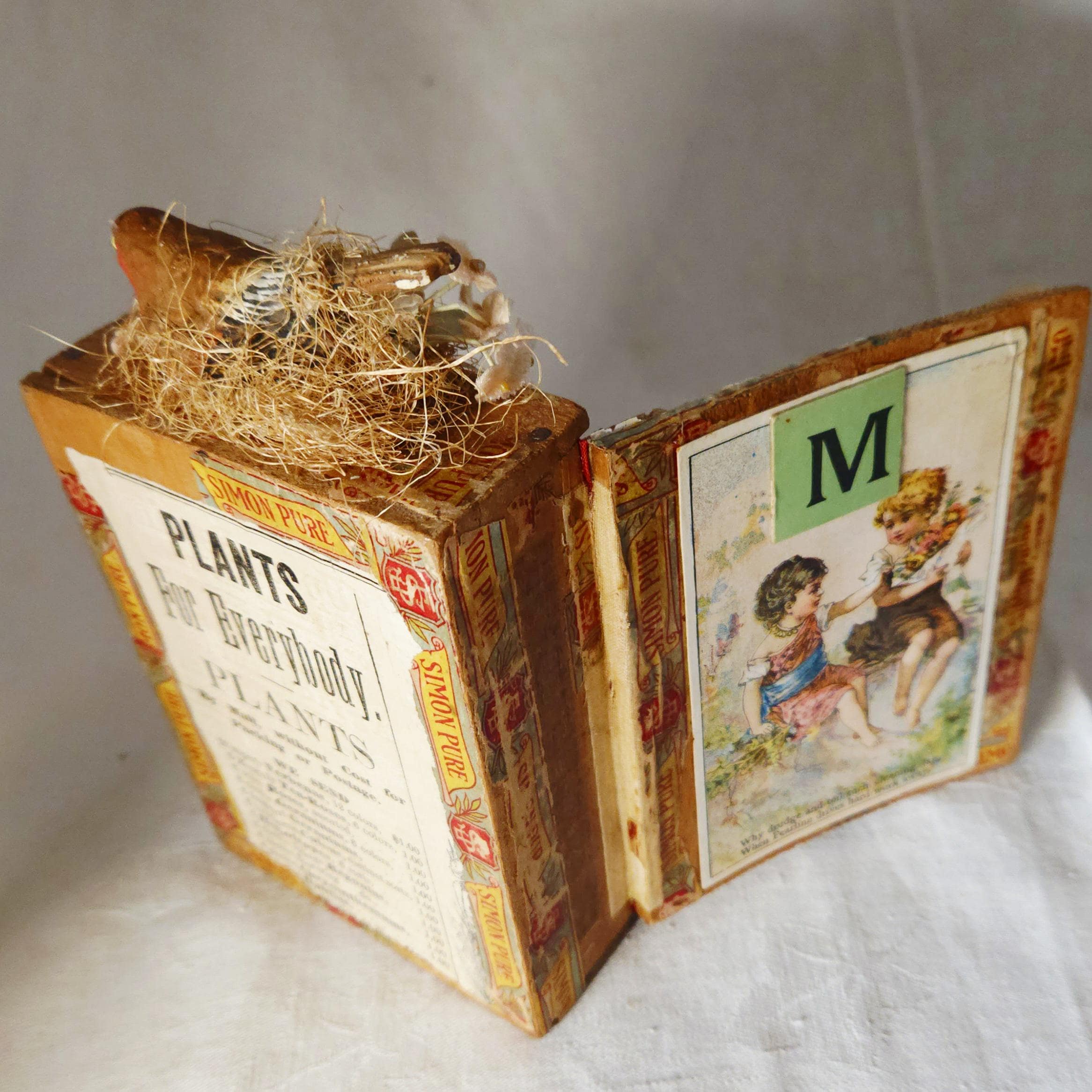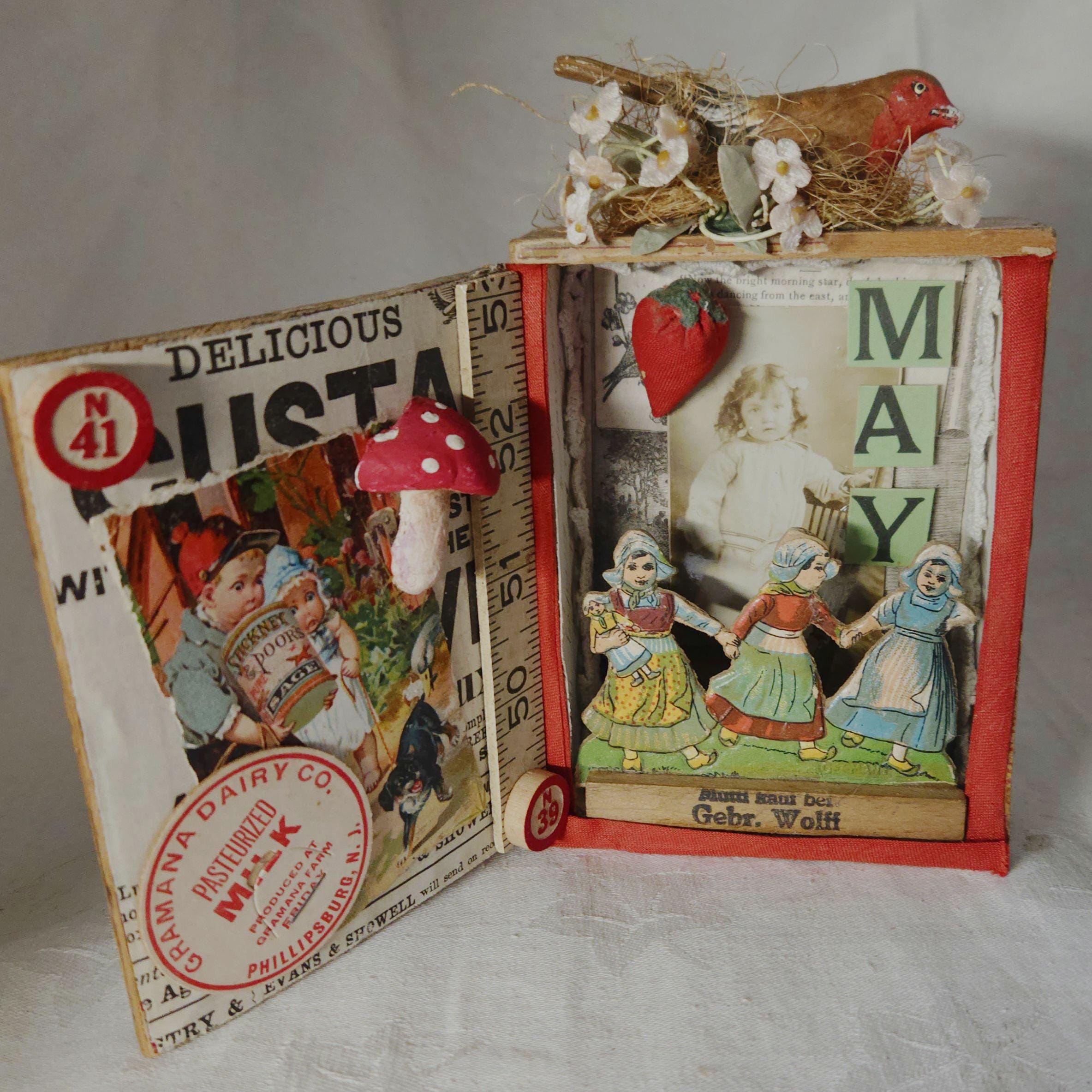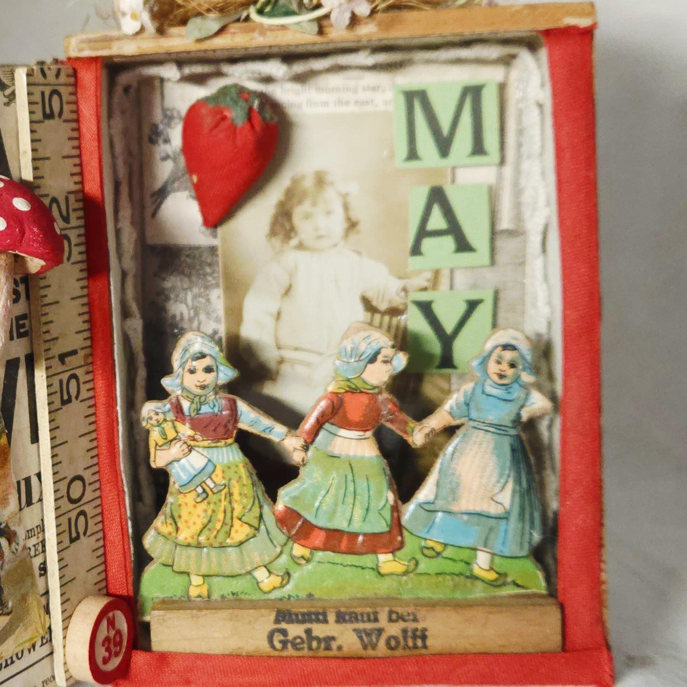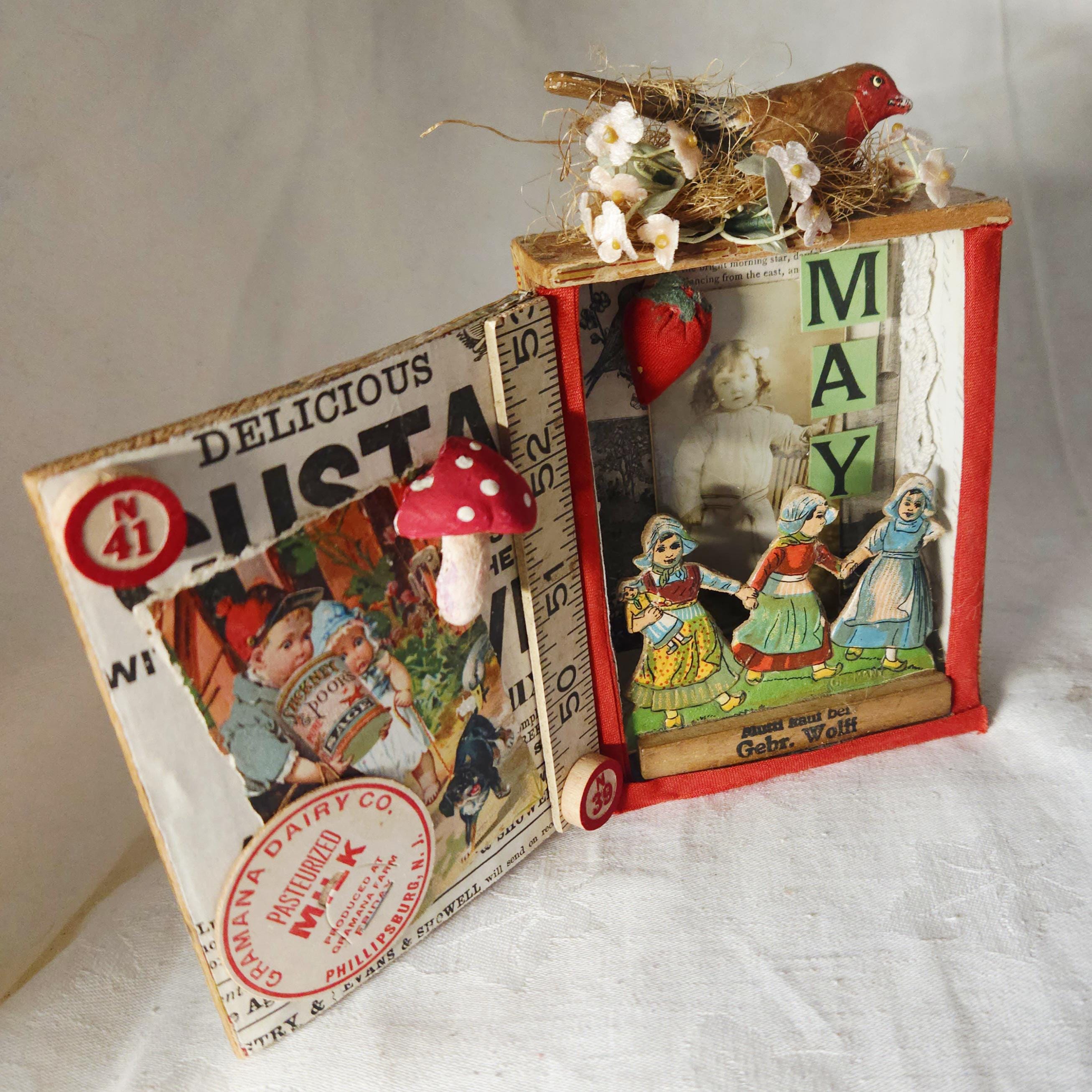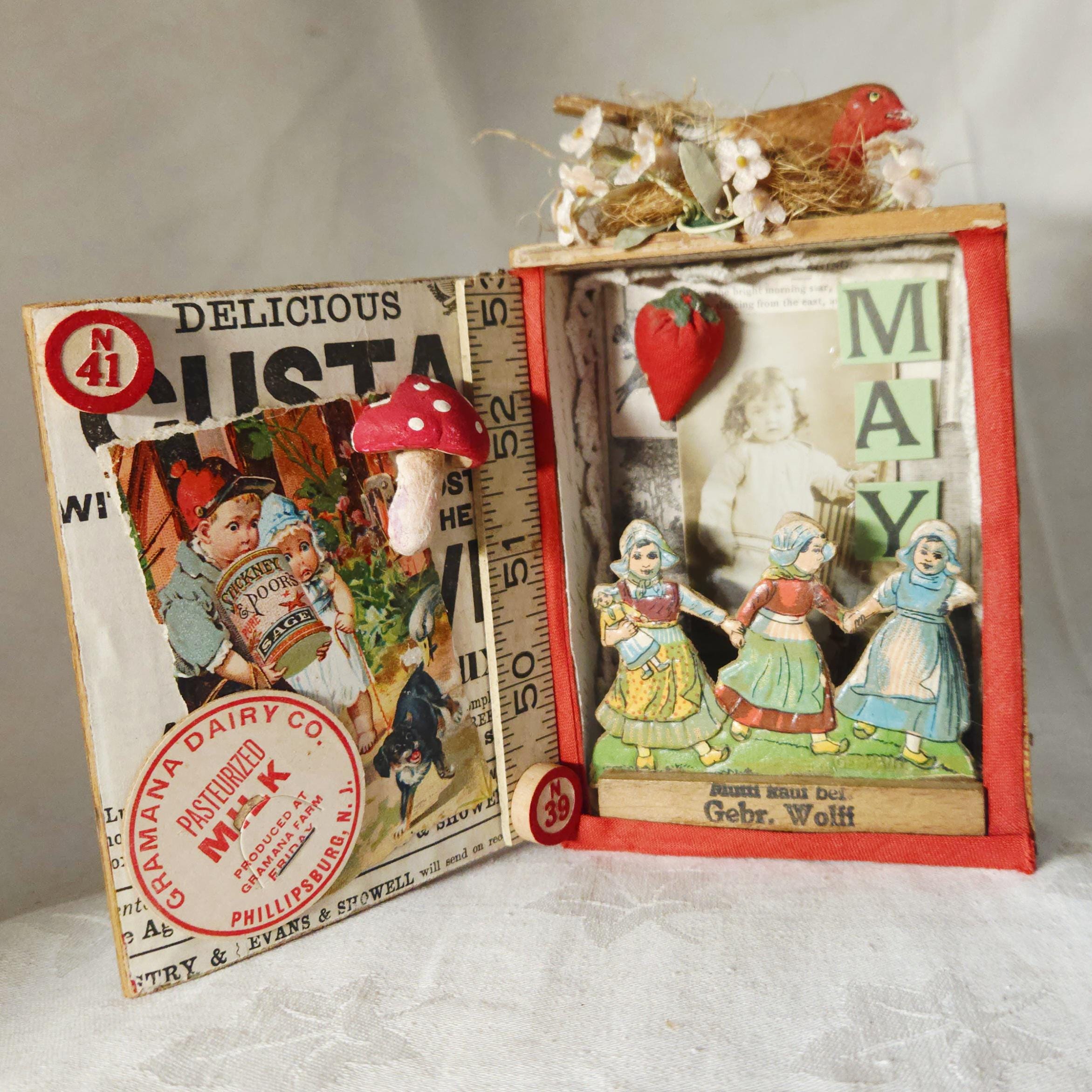 Introducing "MAY DAY" , one of my newest assemblages, a charming handcrafted piece created inside a vintage small cigar box. This unique art object features carefully selected antique ephemera, vintage diecuts, advertising clippings, and a sweet antique photograph of a young girl. The original finish of the cigar box has been thoughtfully preserved to enhance its authentic, rustic appeal. The assemblage is further embellished with soft velvet strawberries, delicate millenary flowers, and a handcrafted clay mushroom, crowned by a whimsical composition bird perched on top.