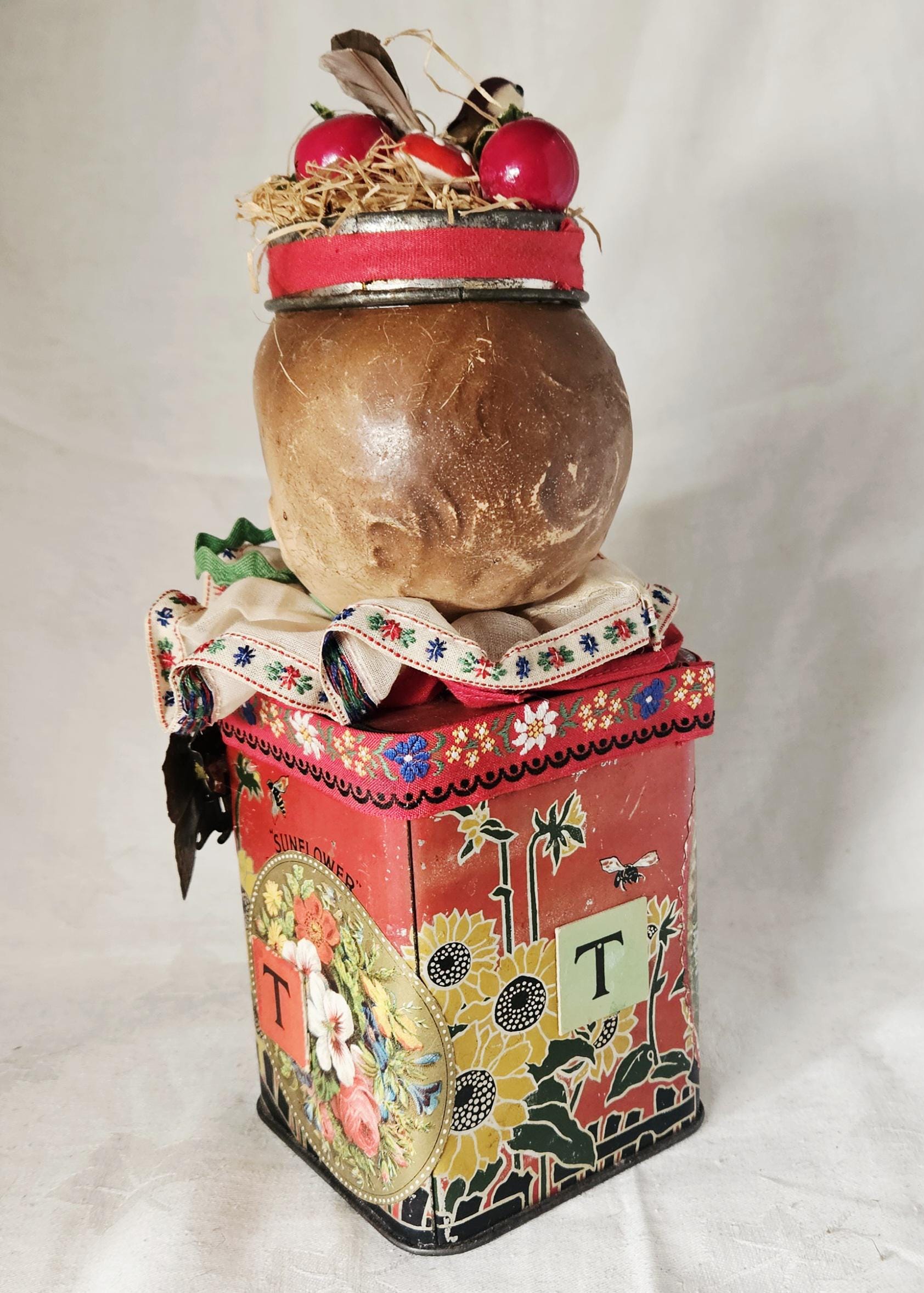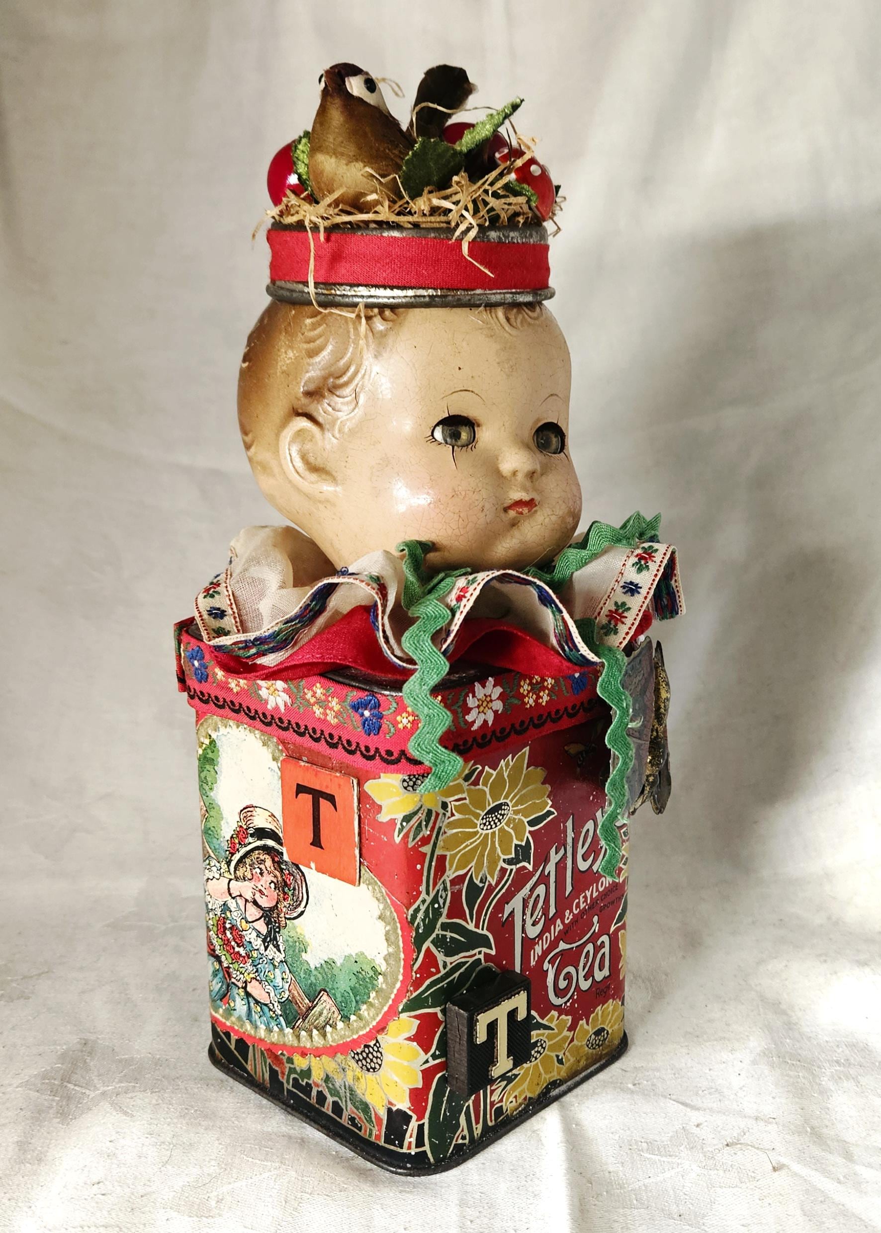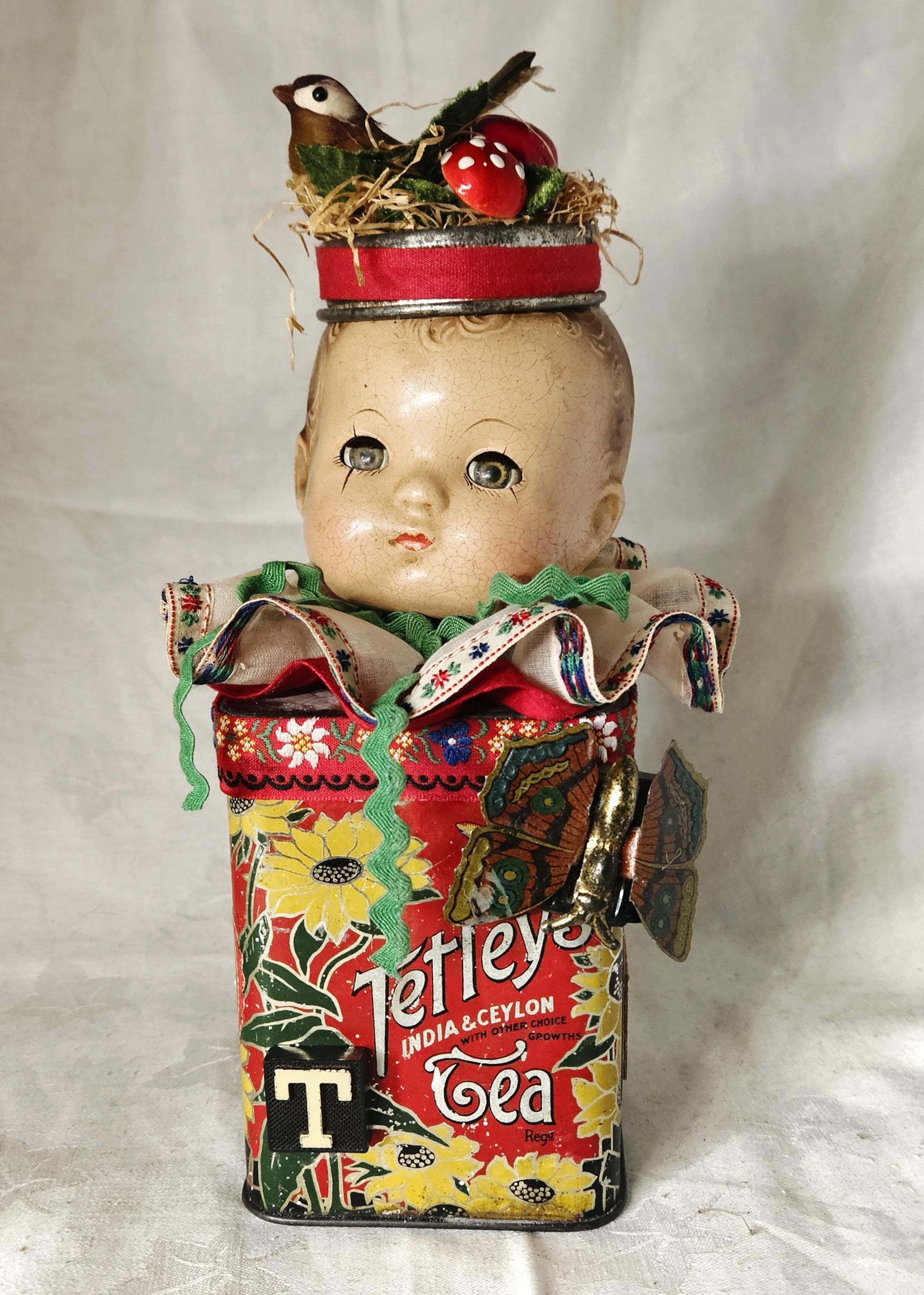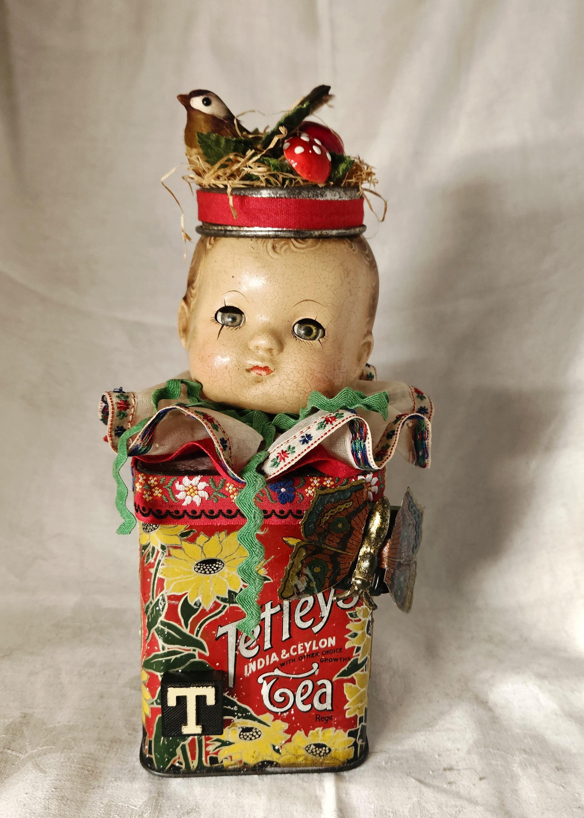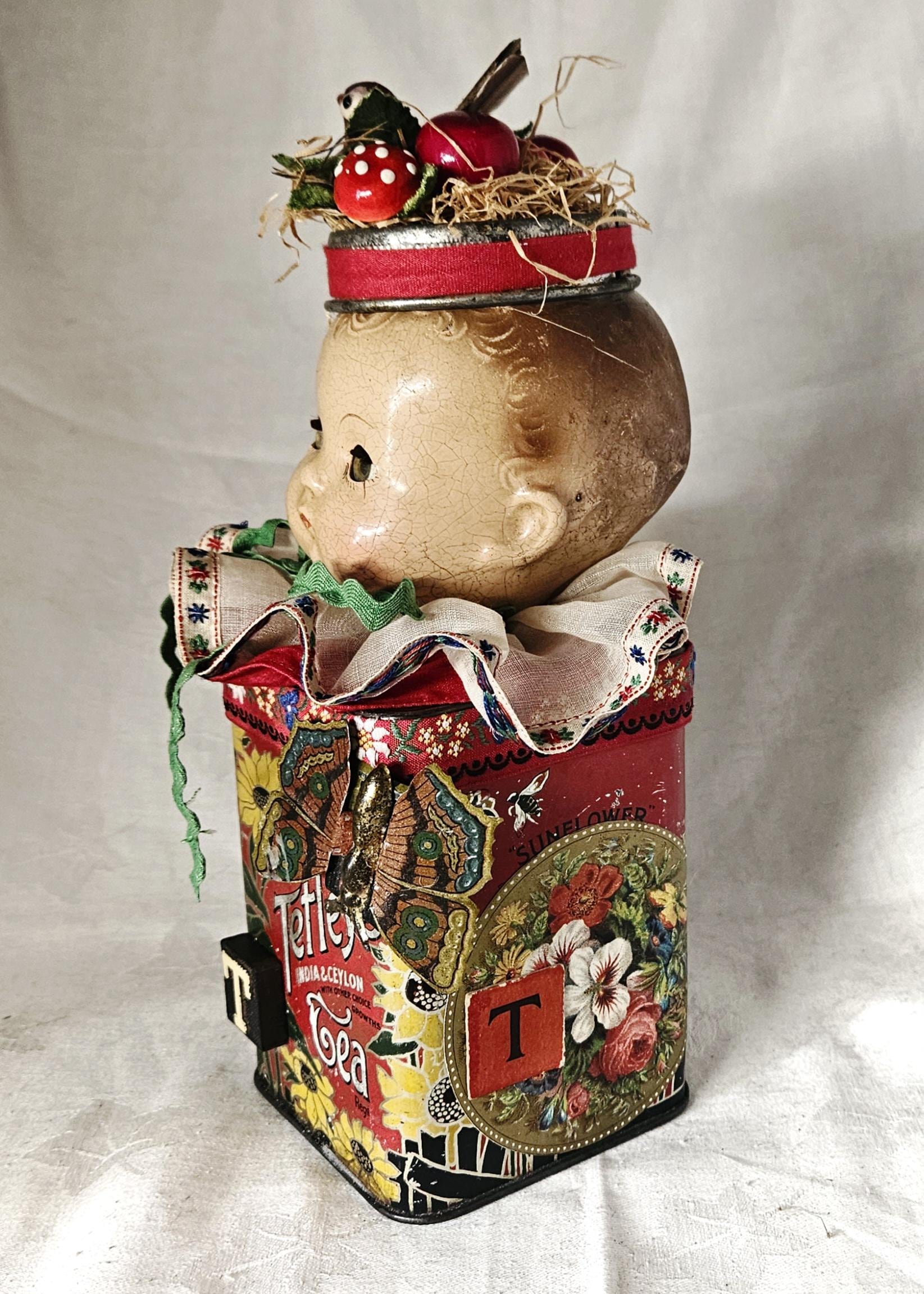 Isn't she sweet ? I love the colors of the vintage Tetley tea tin and I coordinated Victorian scrap and fabrics to accent .The doll head was a flea market find of course. A tin butterfly from an antique friction toy adorns the corner .12" tall