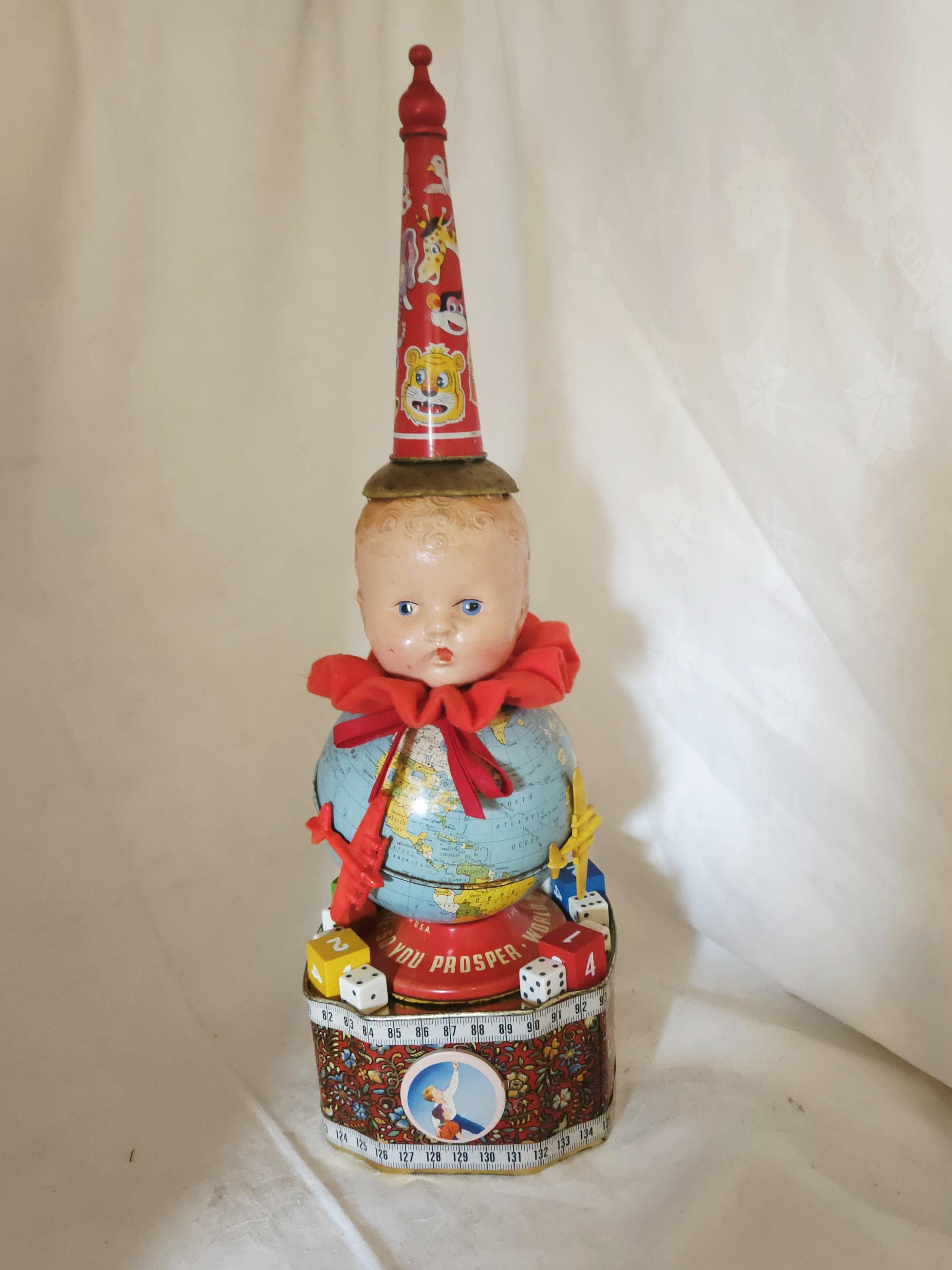 Step right up to this extraordinary piece of whimsy and wonder! This charming assemblage sculpture brings together the magic of vintage toys, global adventure, and circus delight in one captivating conversation piece.