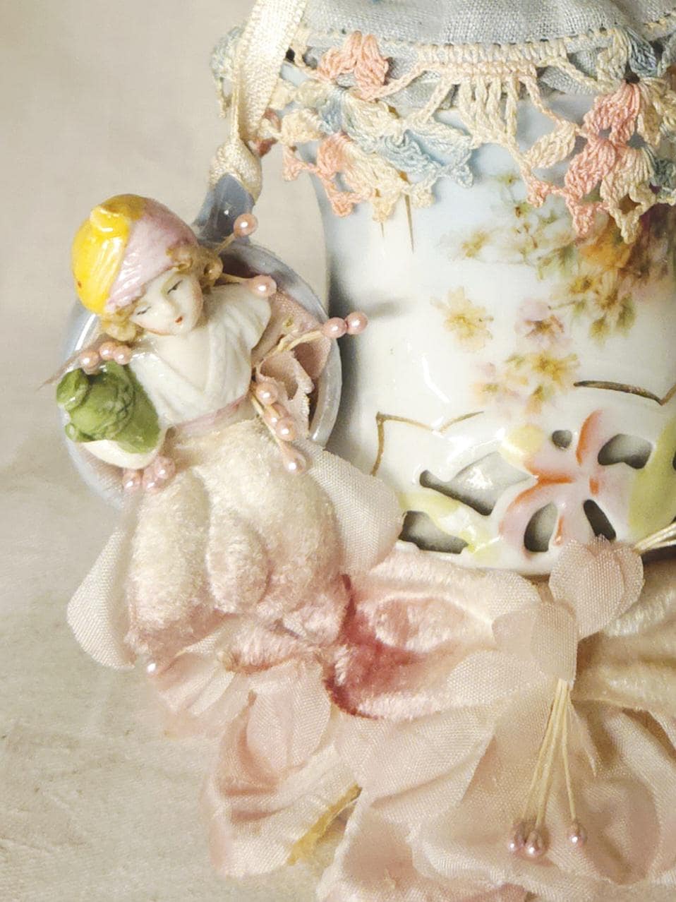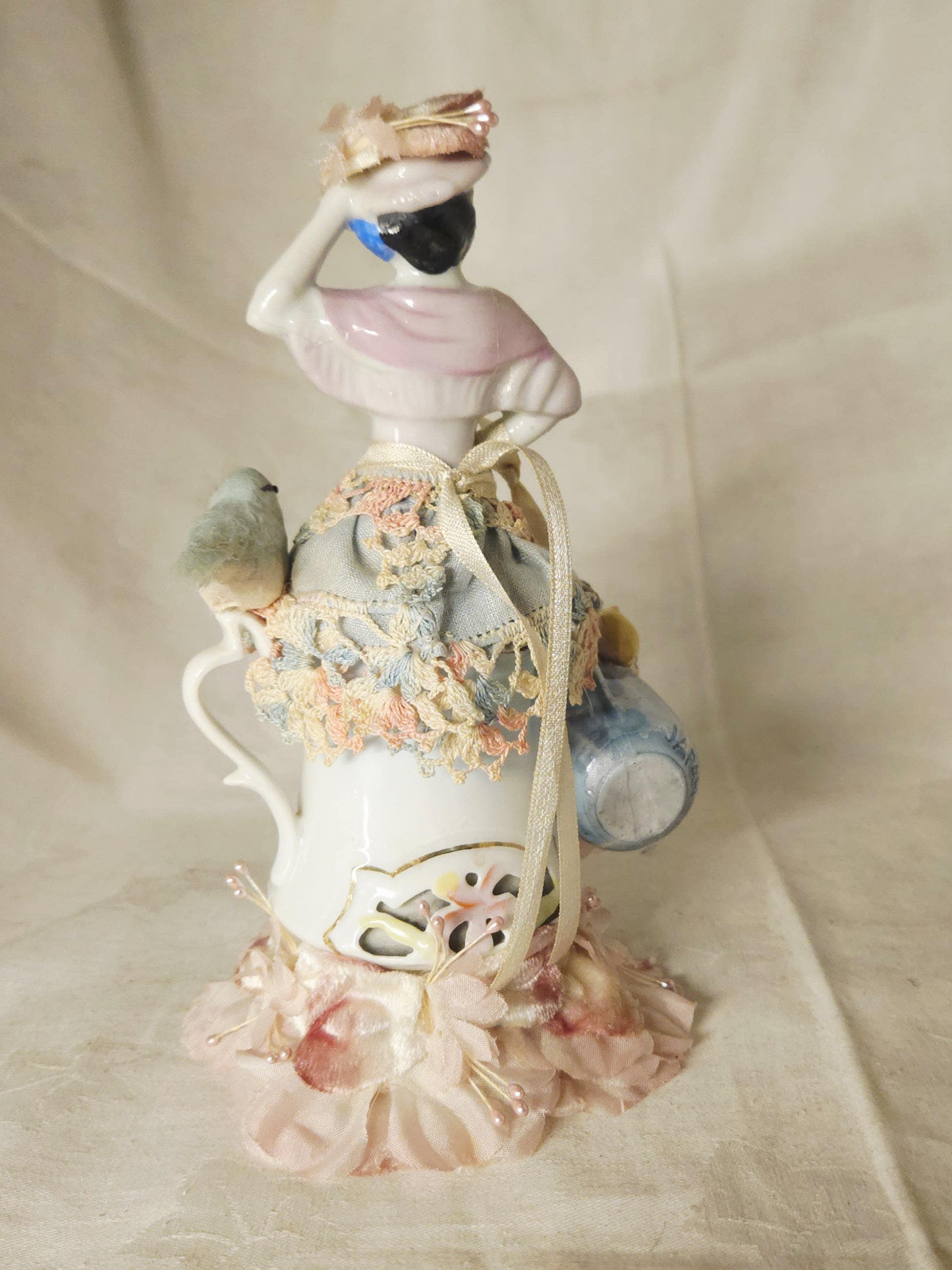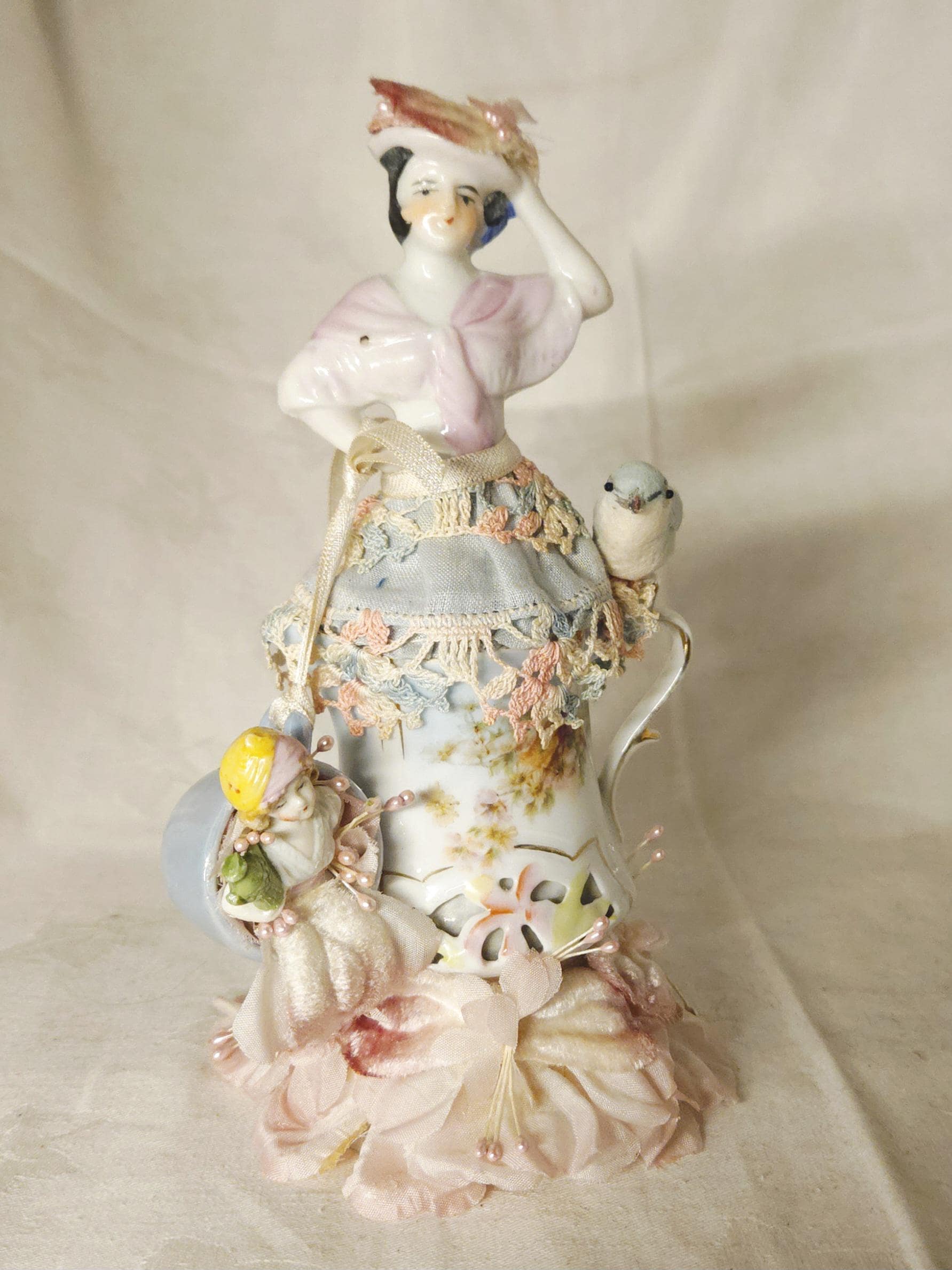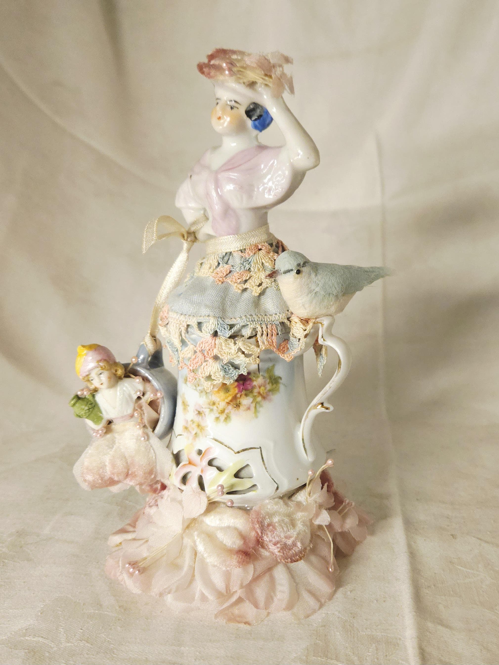 TEA FOR TWO ~ Here is a very dainty ,romantic assemblage I created with a vintage half doll atop a teacup .She is holding a small doll teacup with a small half doll ! I used a trimmed hankie scrap for her skirt.Adorned with lots of salvaged hat flowers. A vintage cotton bird sits on her arm.