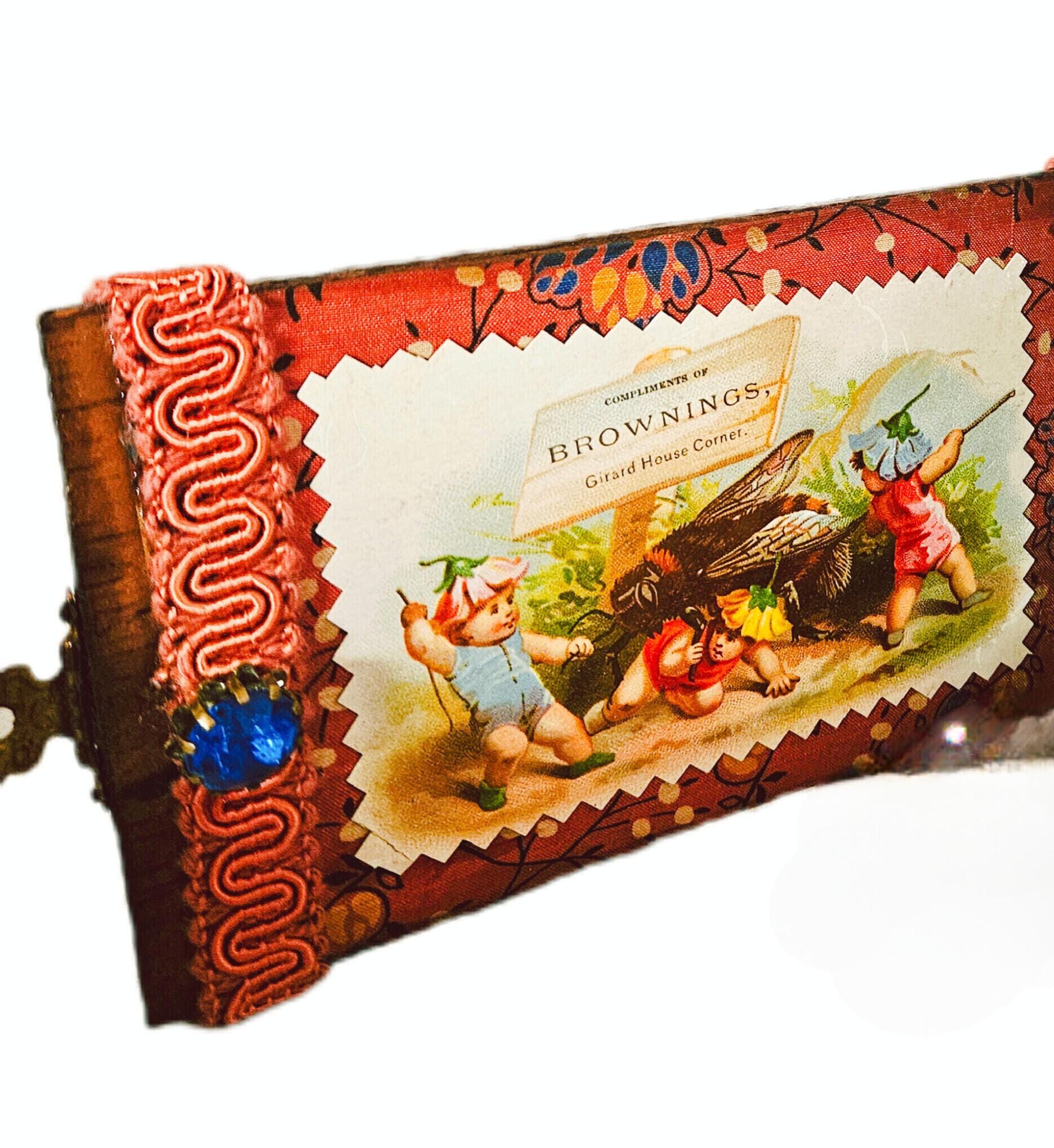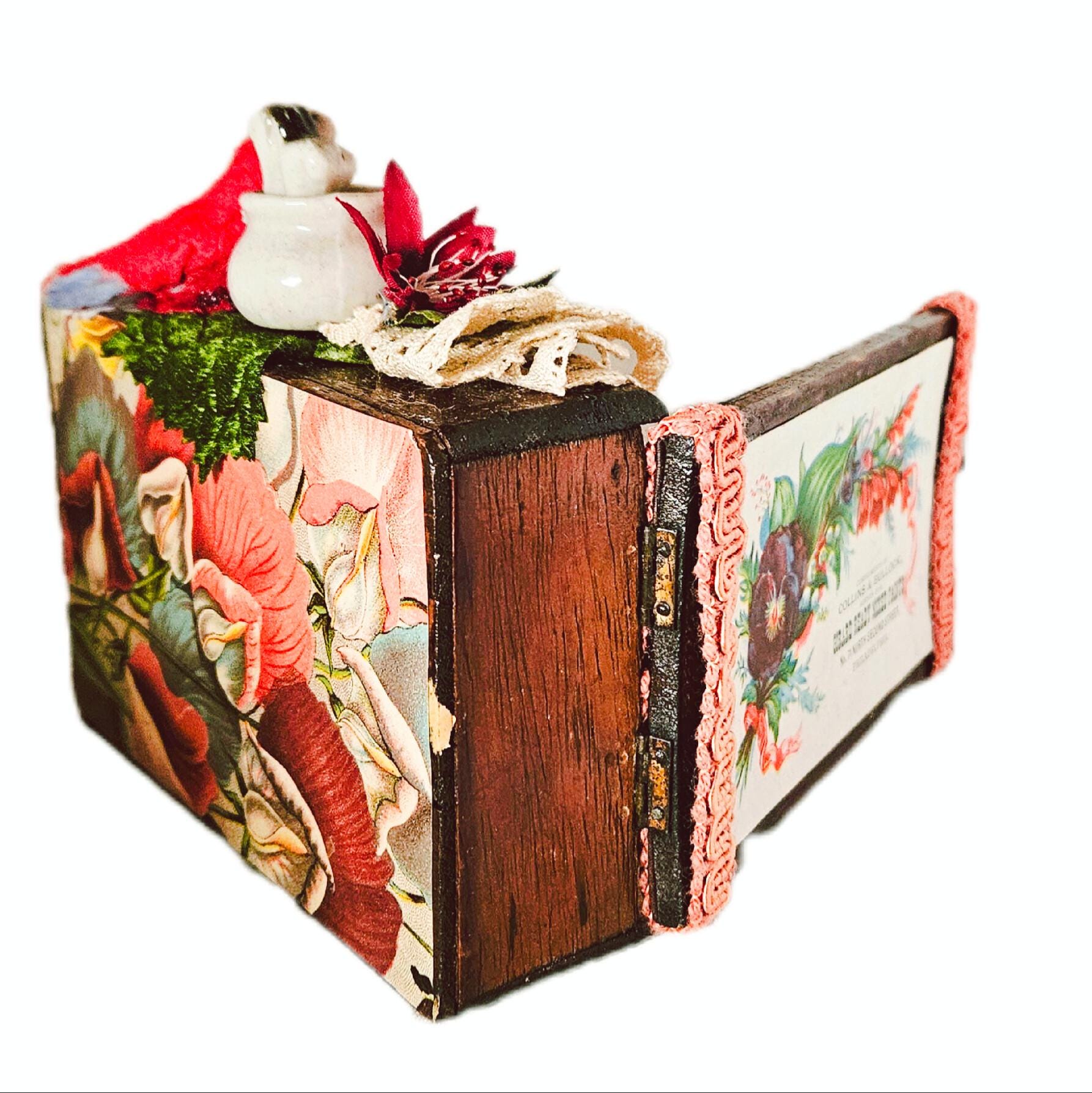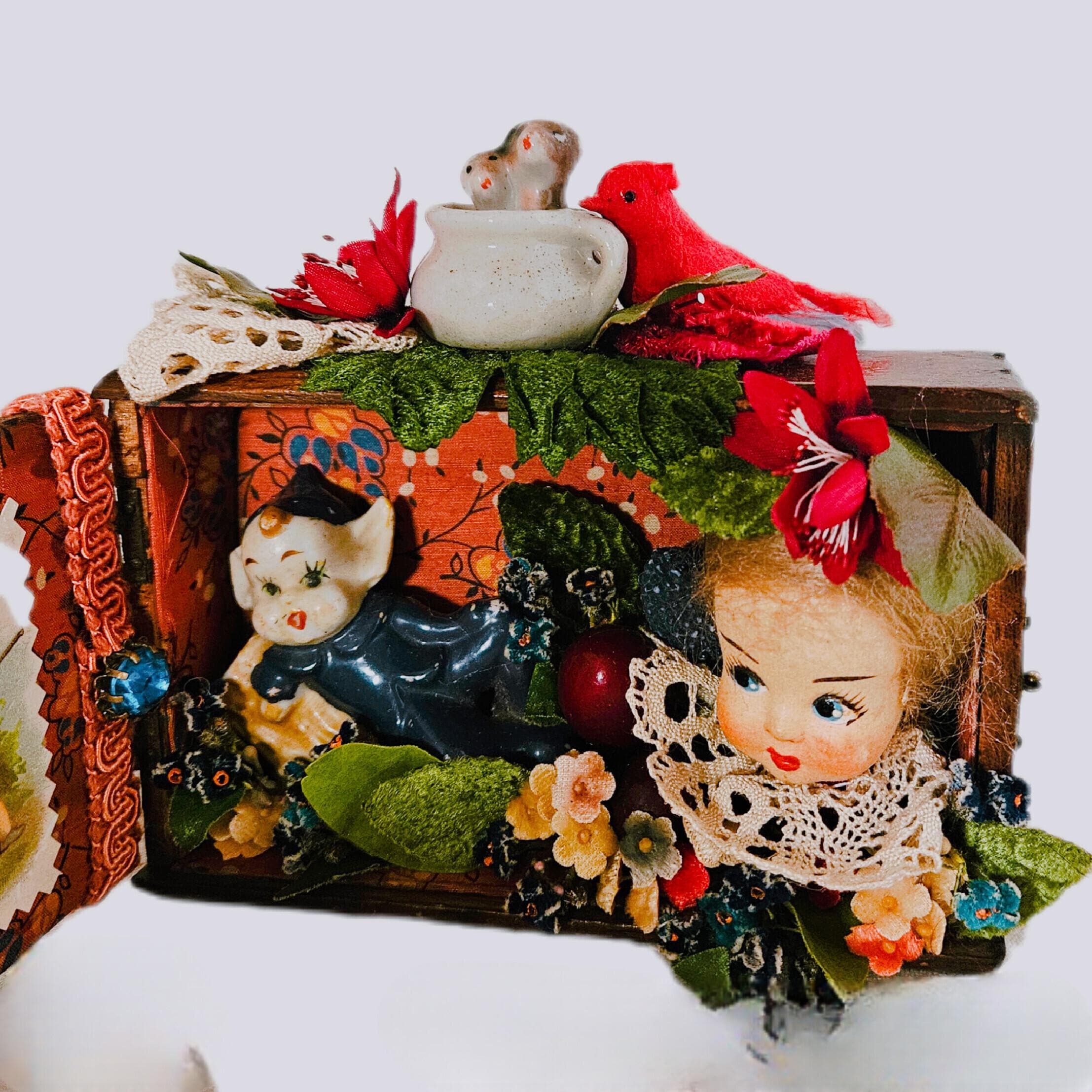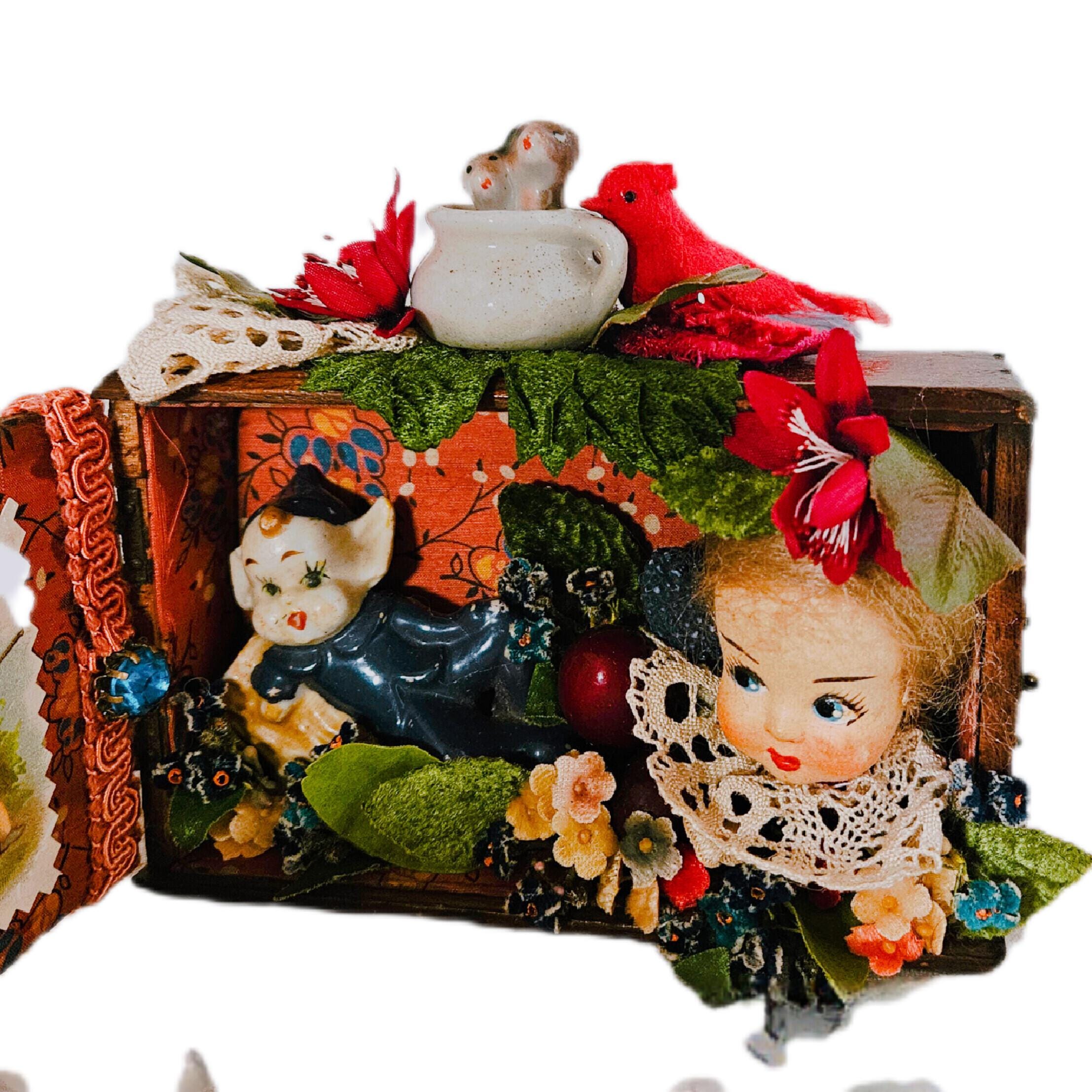 BROWNINGS GARDEN PARTY is a sweet ,small shadowbox assemblage.It started with a fun vintage pixie figurine and took off from there. The old wooden box was transformed with antique ephemera, vintage millenary fruits ,flowers,trims and a doll head ! A vintage cotton bird is perched on top along with a fun little ceramic cup with dogs inside. APPROXIMATELY 10" wide opened . 5" TALL .