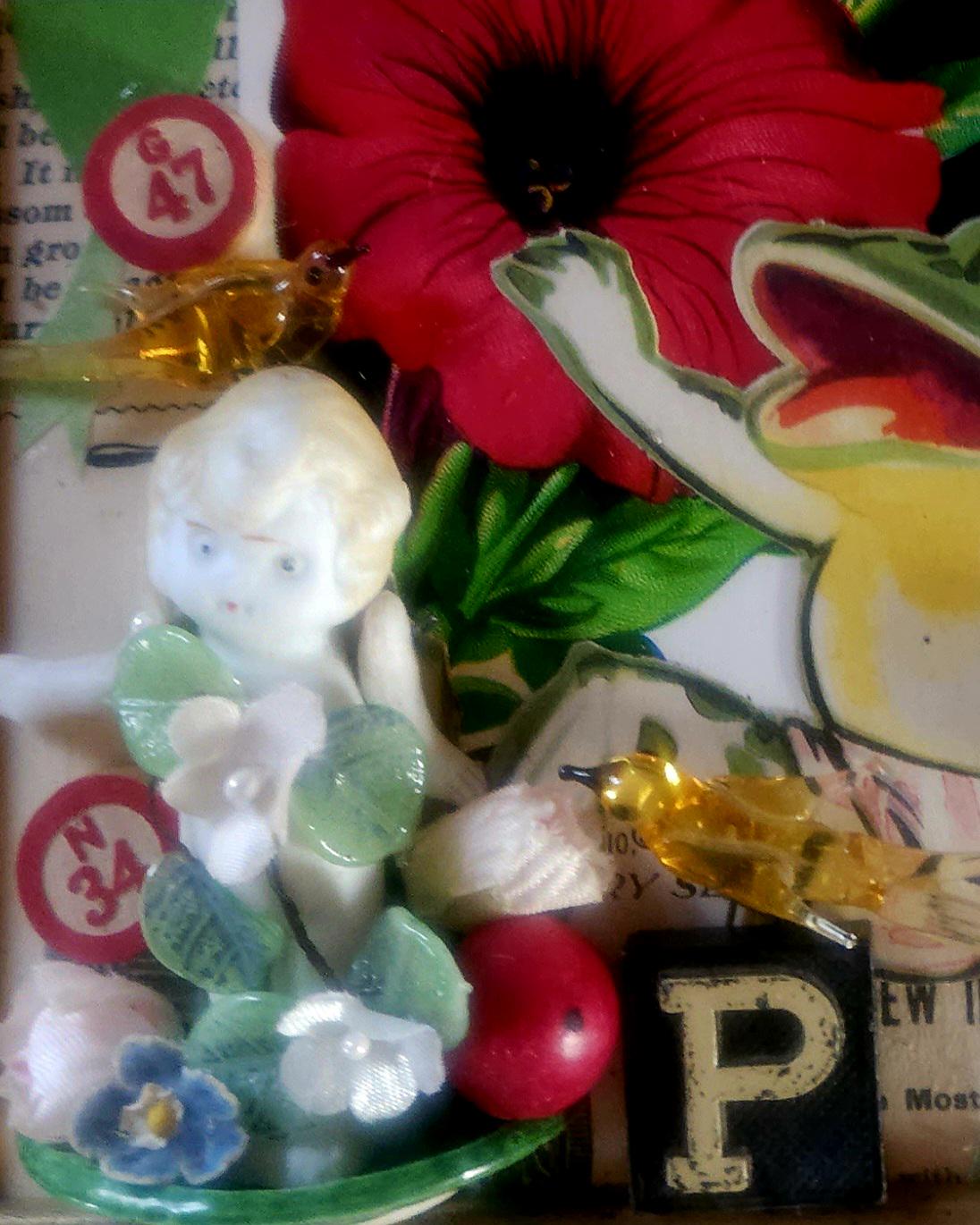The doll is antique bisque Embellished with vintage millenary flowers, cotton bird, game pieces and more. It can hang or of course lean on a shelf.