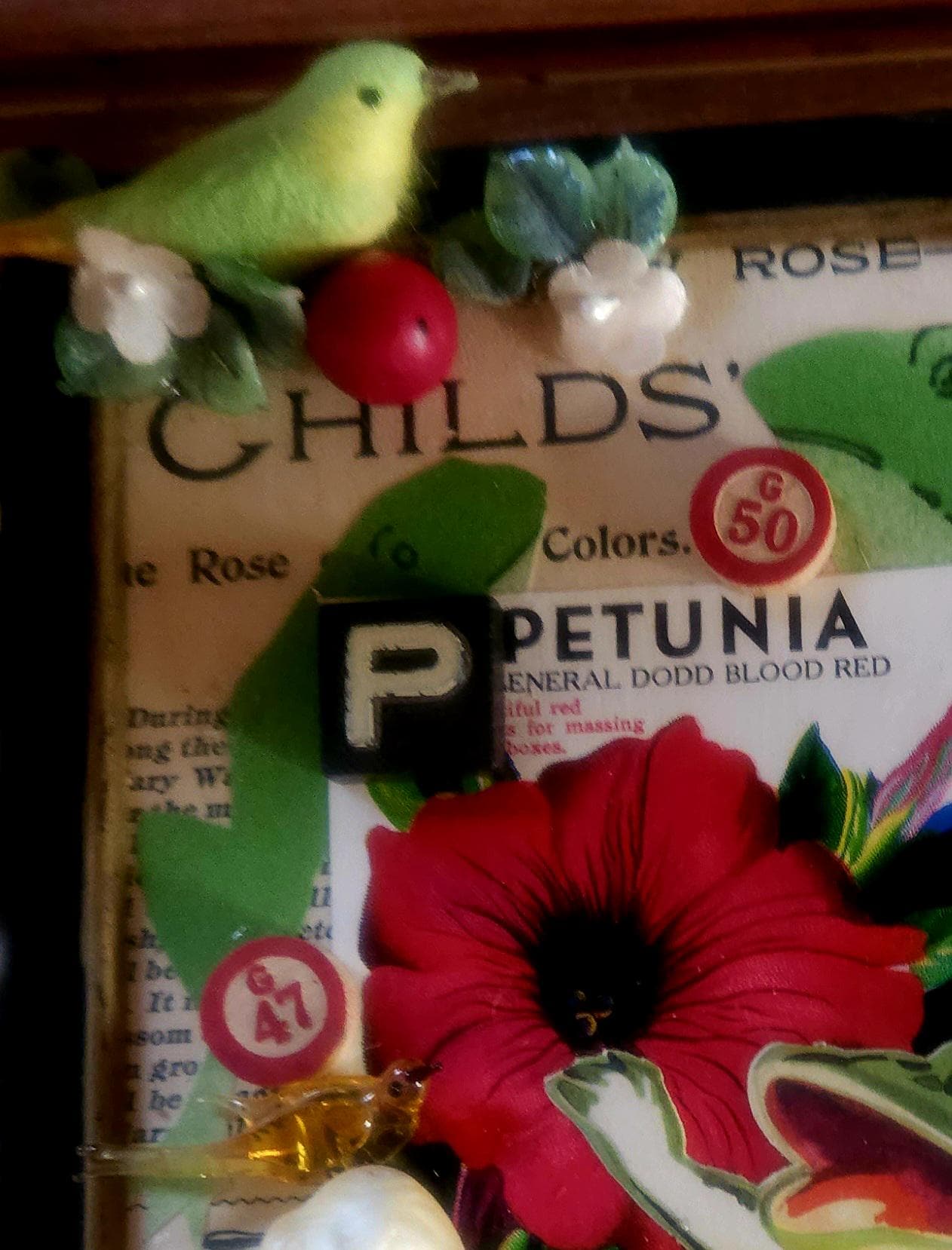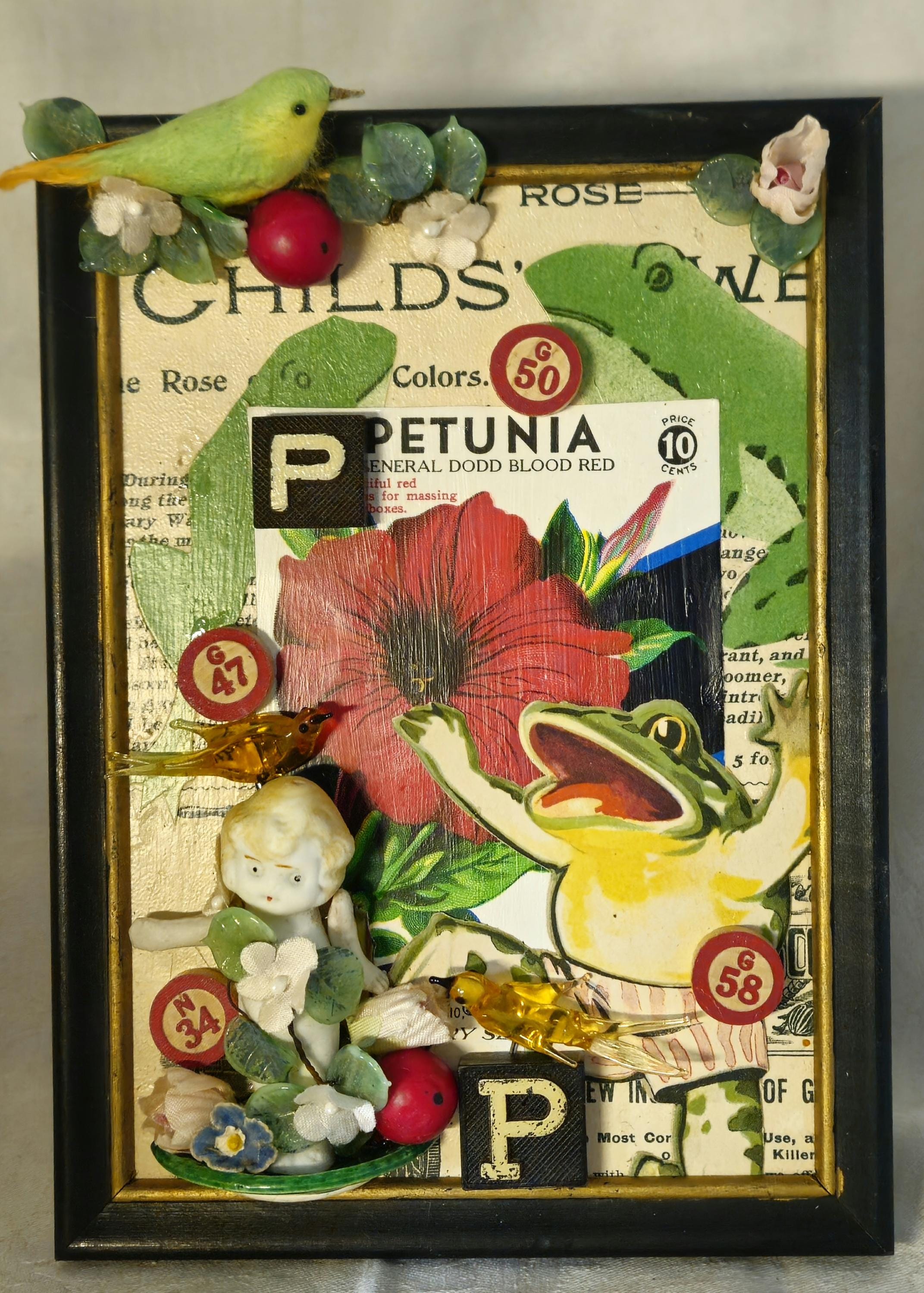 PETUNIA is a fun,colorful,and whimsical art piece.All original papers used from vintage children's books illustrations and seed packet .