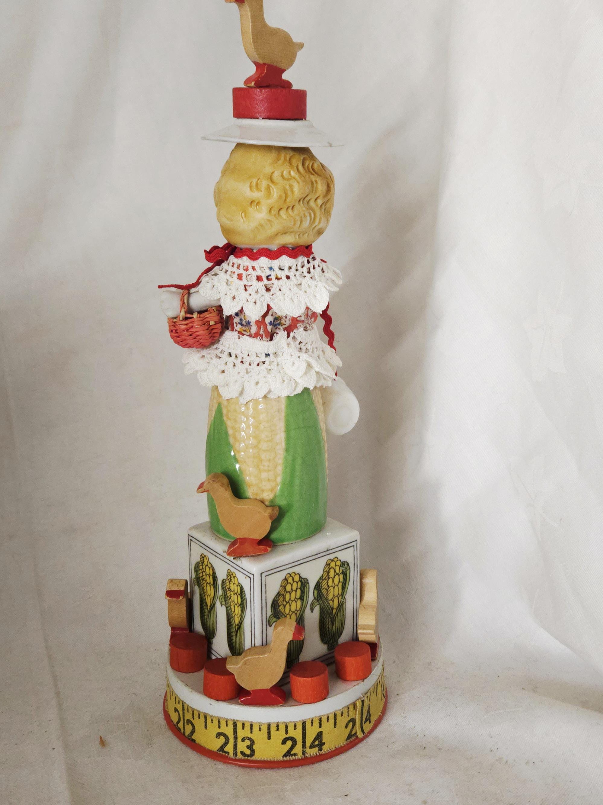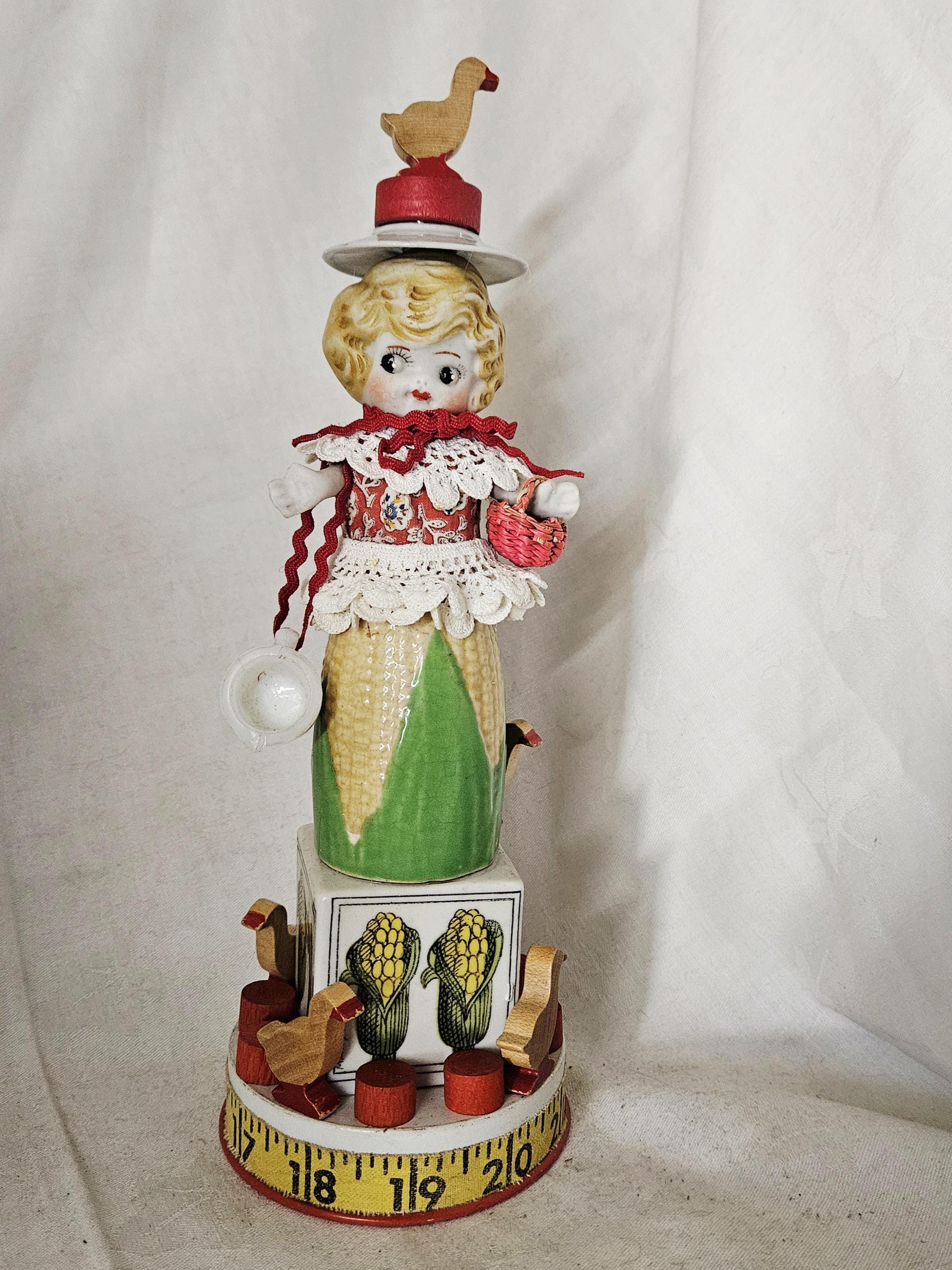 Meetb CORALINE , a fun corn girl from two vintage s&p shakers ,a broken bisque doll, a tin from a play set,and gaggle of little wooden geese❤️