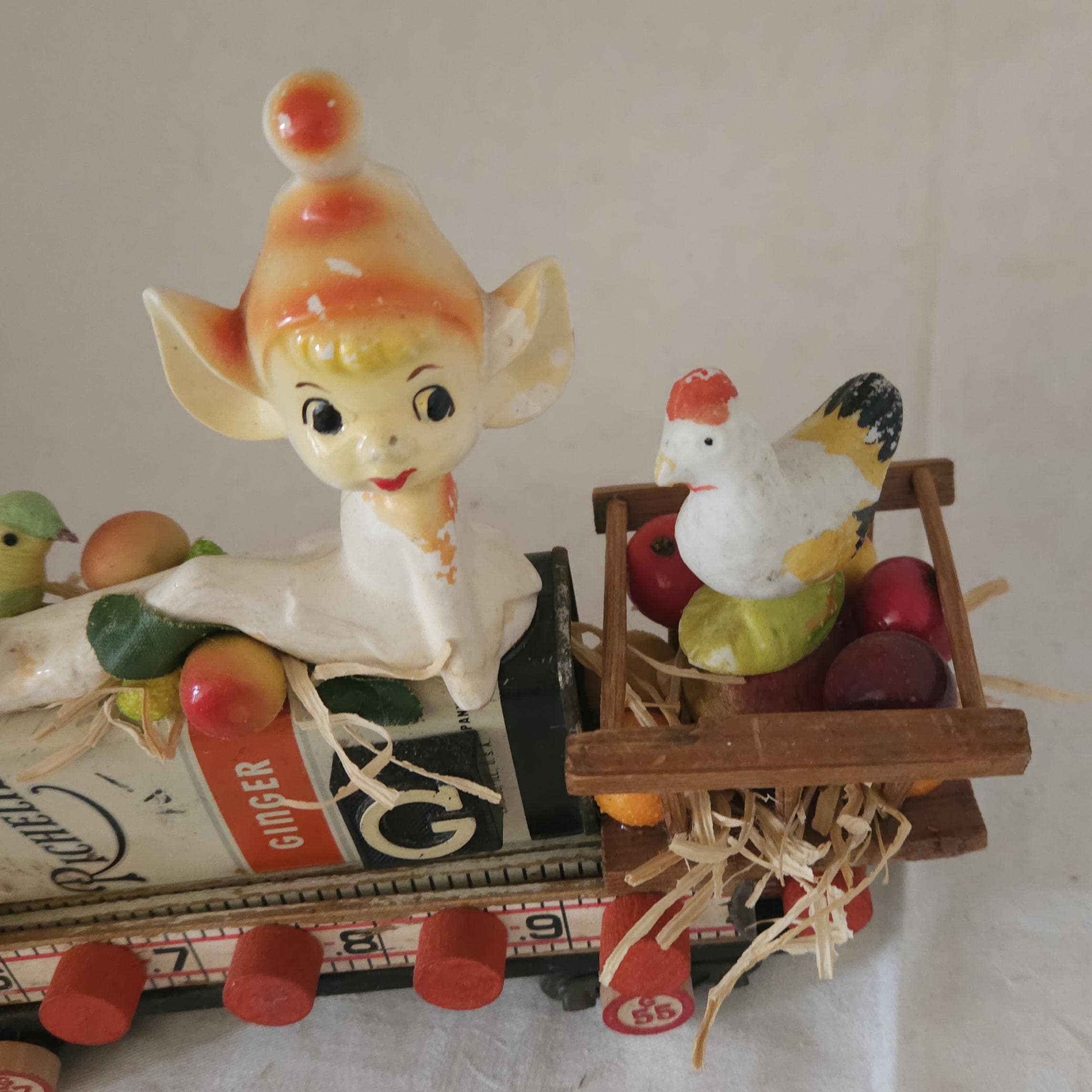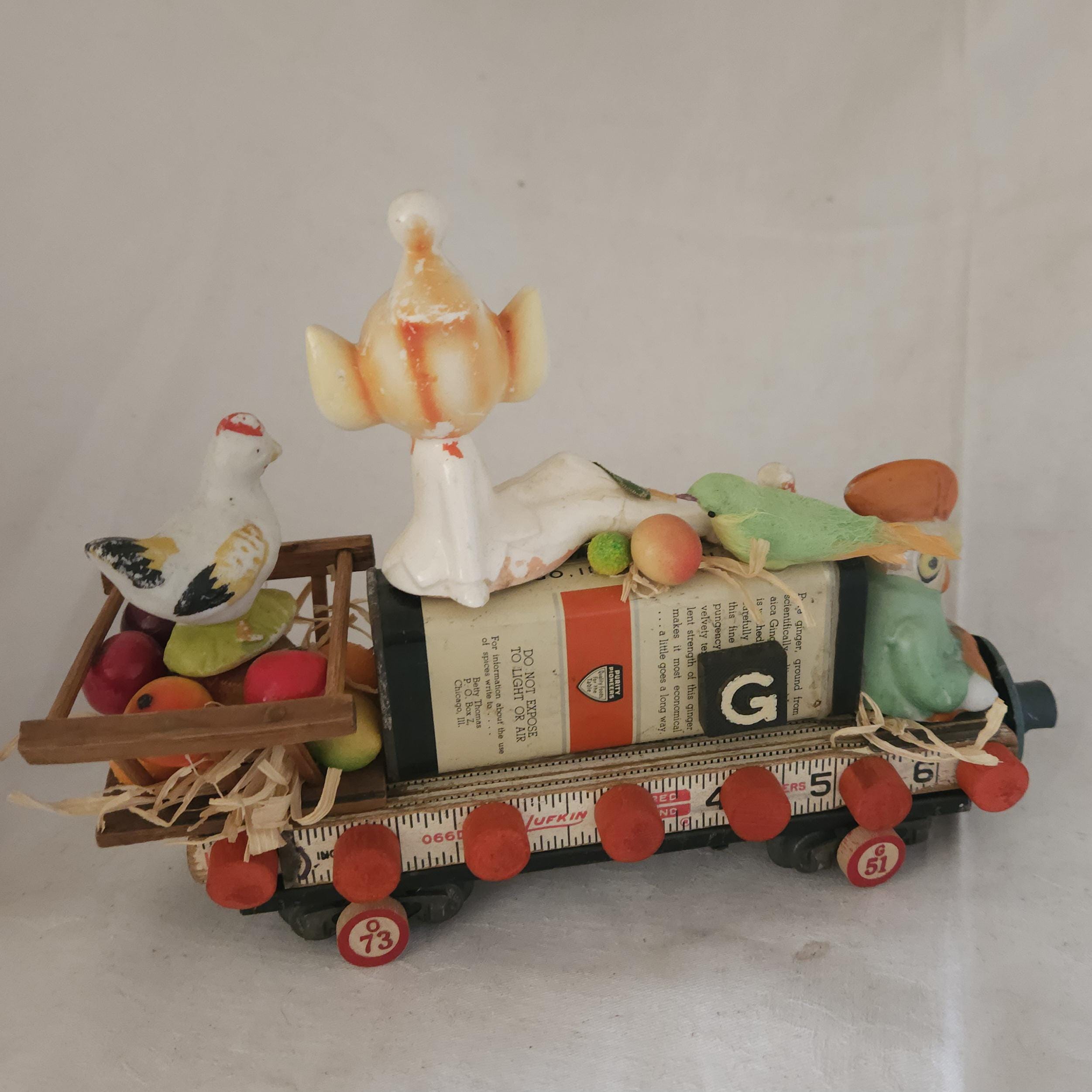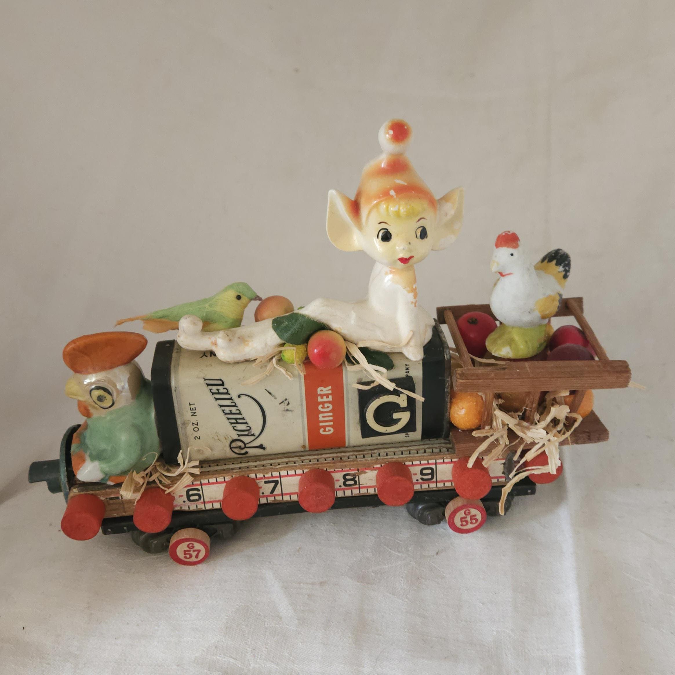 GINGER is a delightful and whimsical assemblage that I hope will bring a smile to your face. I have repurposed a vintage spice tin, a pixie figurine, train parts, and various other elements to craft this unique piece. I exclusively utilize vintage and salvaged components, which I carefully source from flea markets and estate sales. The search for these treasures is an integral and enjoyable part of my creative process.creative process 😊