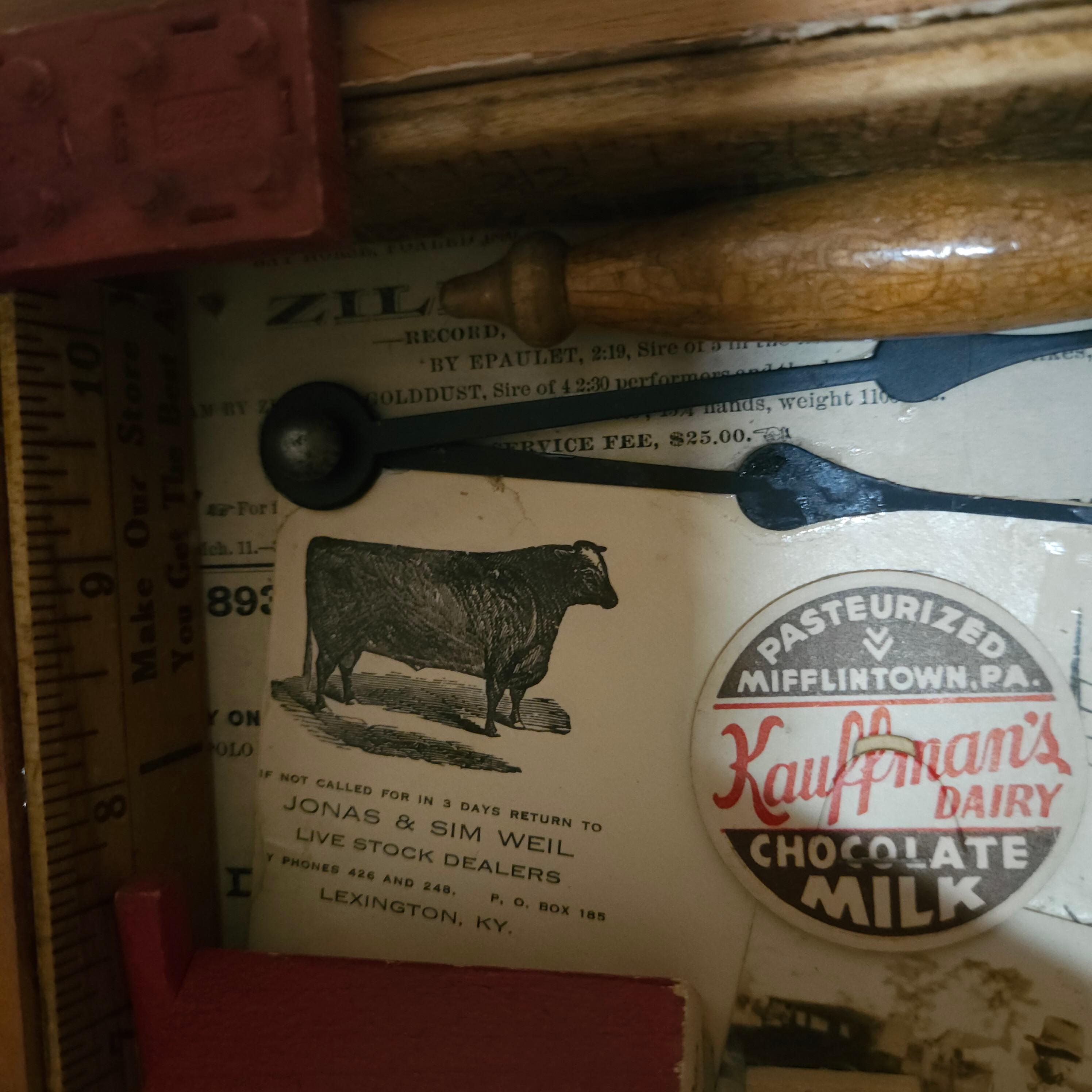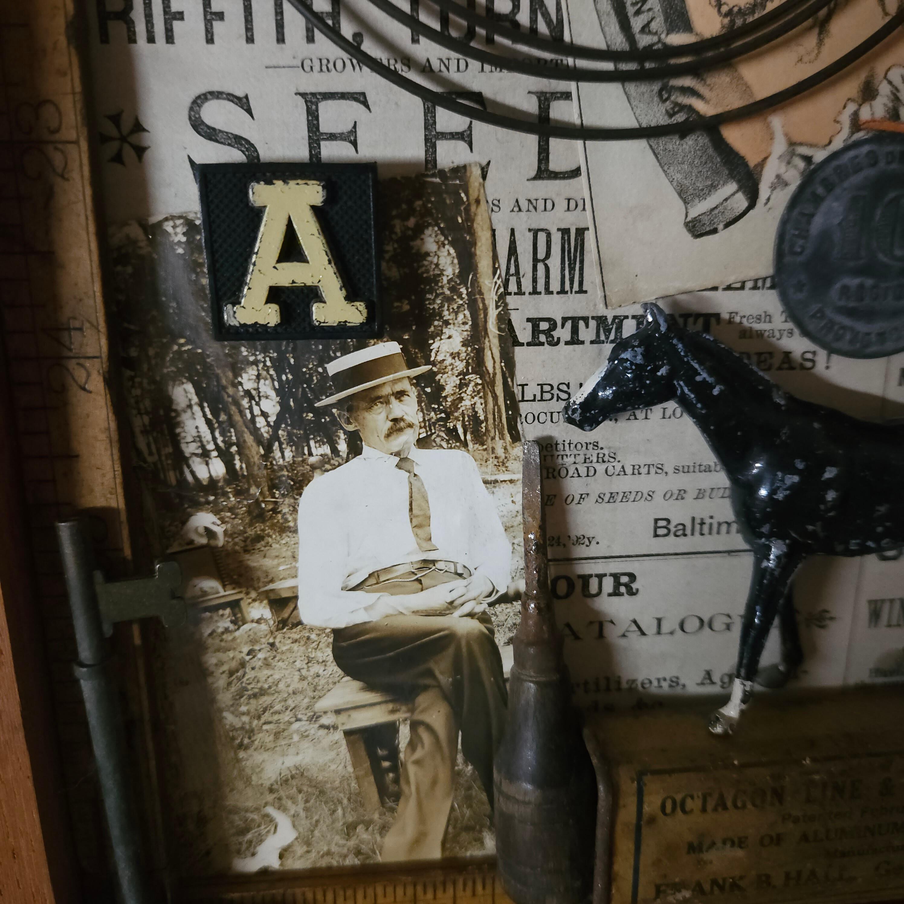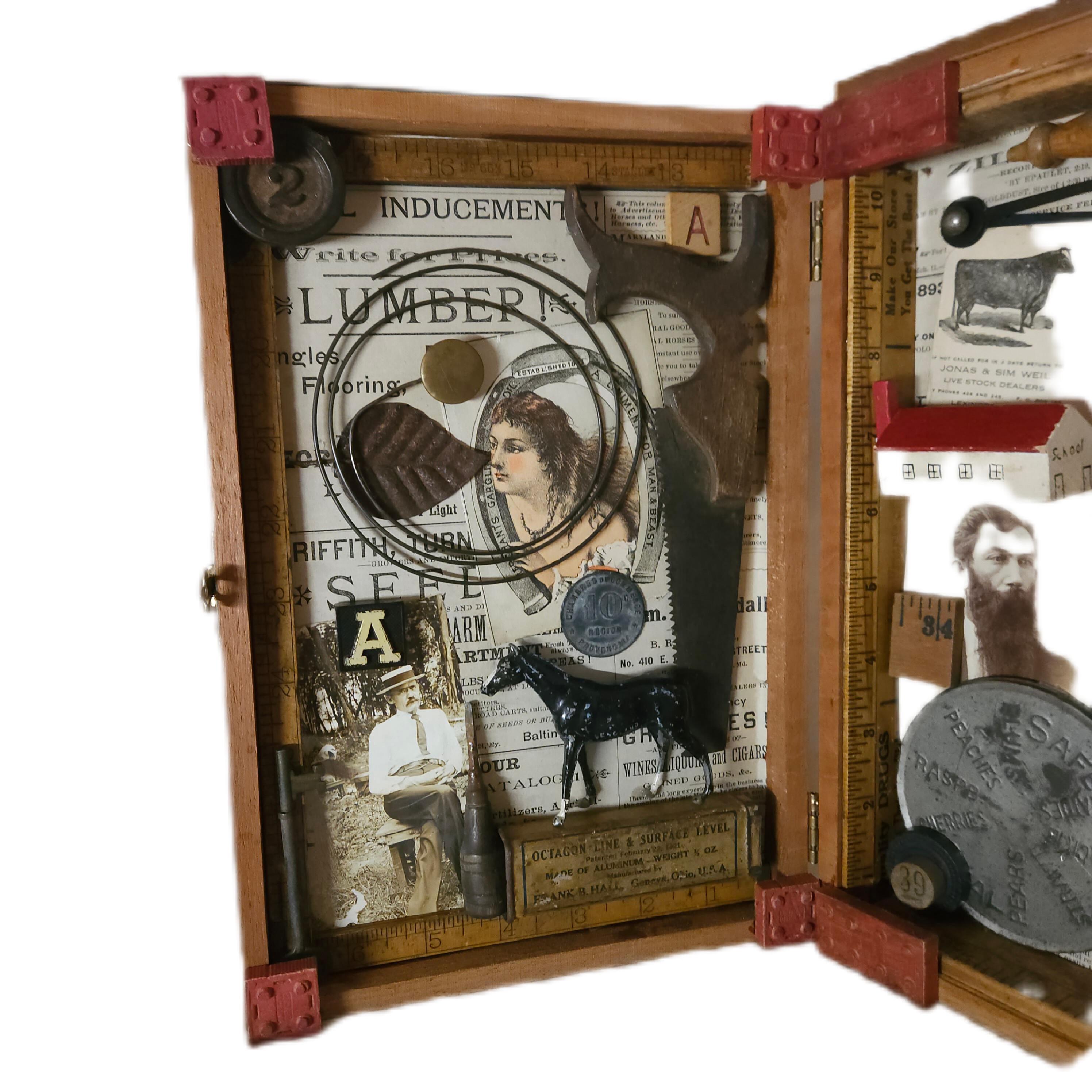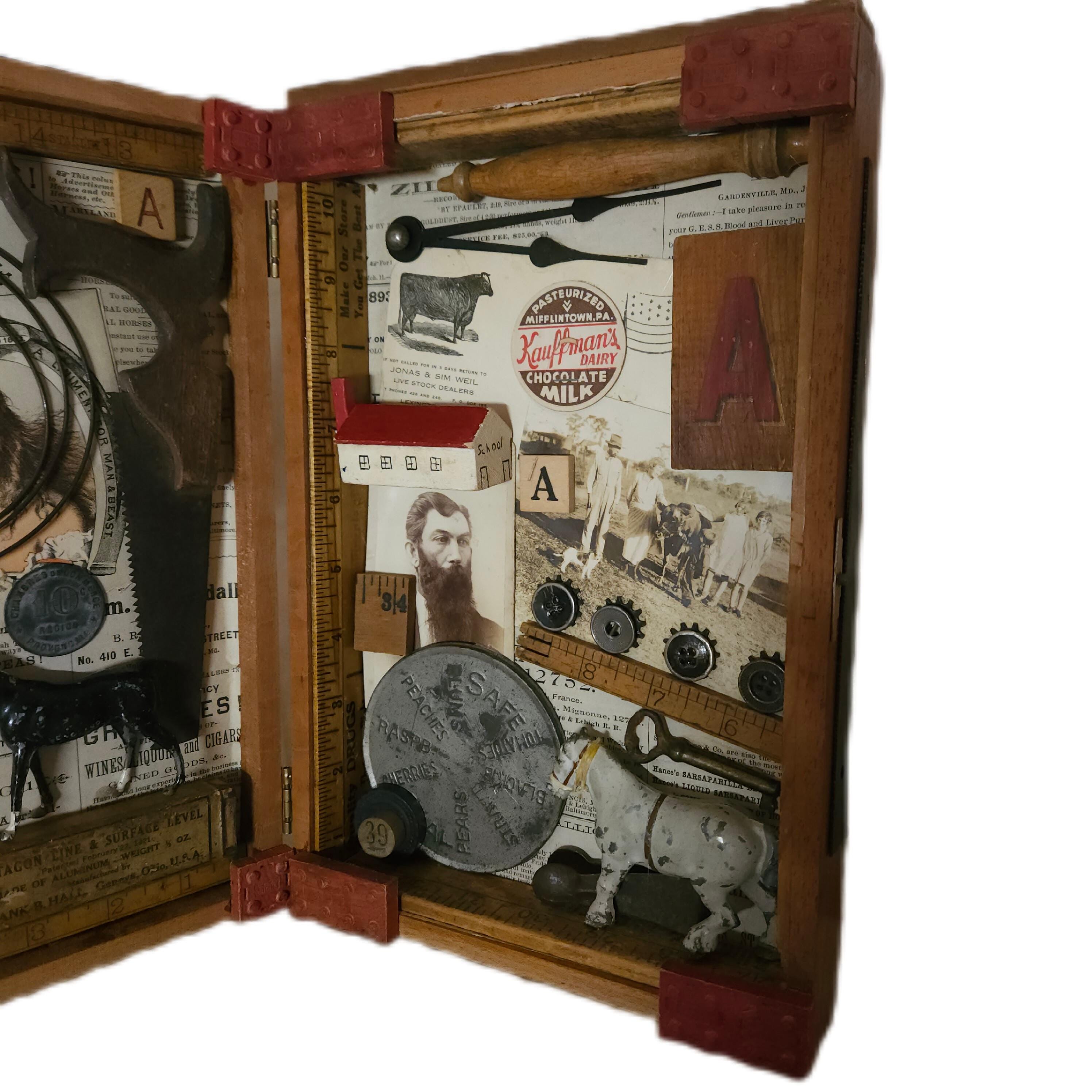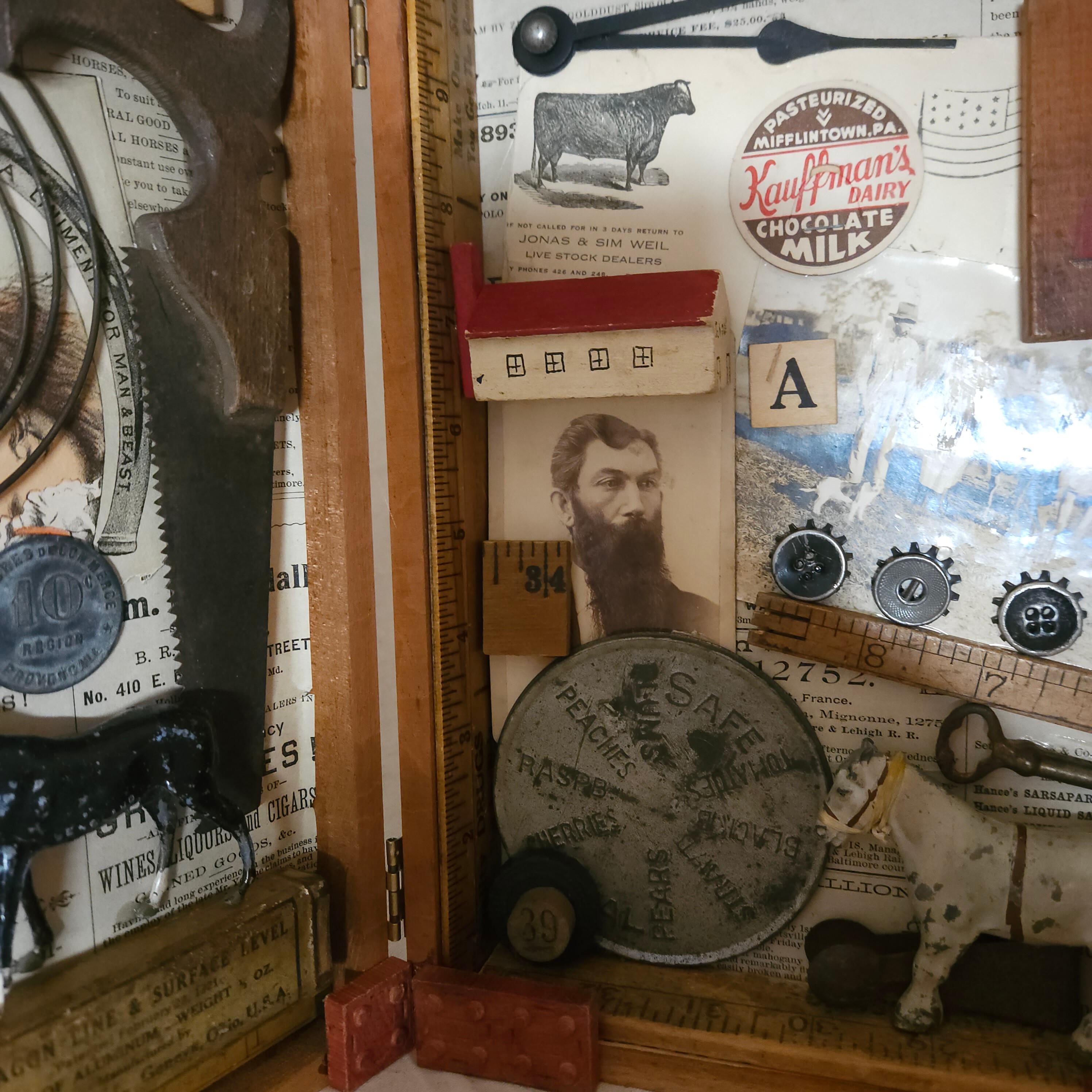 The overall effect evokes rural American life from the late 1800s to early 1900s, celebrating craftsmanship, commerce, and everyday life through a carefully curated arrangement of historical fragments. This piece would appeal to collectors of Americana, assemblage art, or those drawn to the aesthetic of memory boxes and curiosity cabinets.
