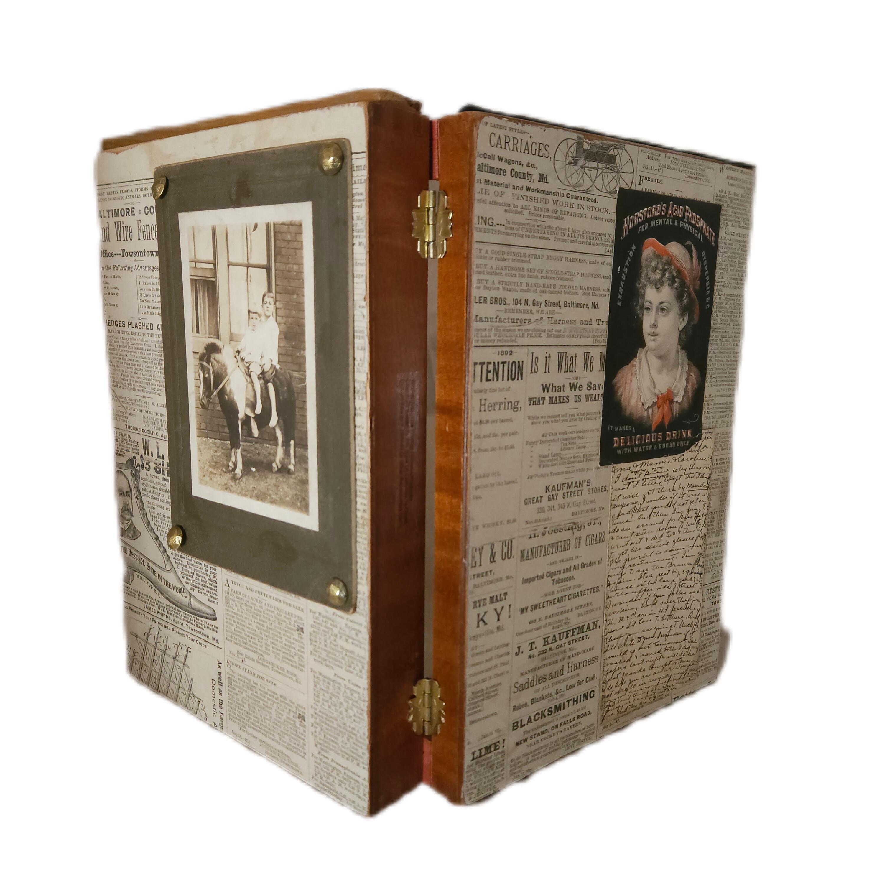 The composition features a layer of newspaper c1895 Baltimore with advertisements, with prominent text fragments. A sepia-toned portrait of a Victorian-era woman serves as a focal point on the left panel, encircled by clock springs that add dimensional interest.