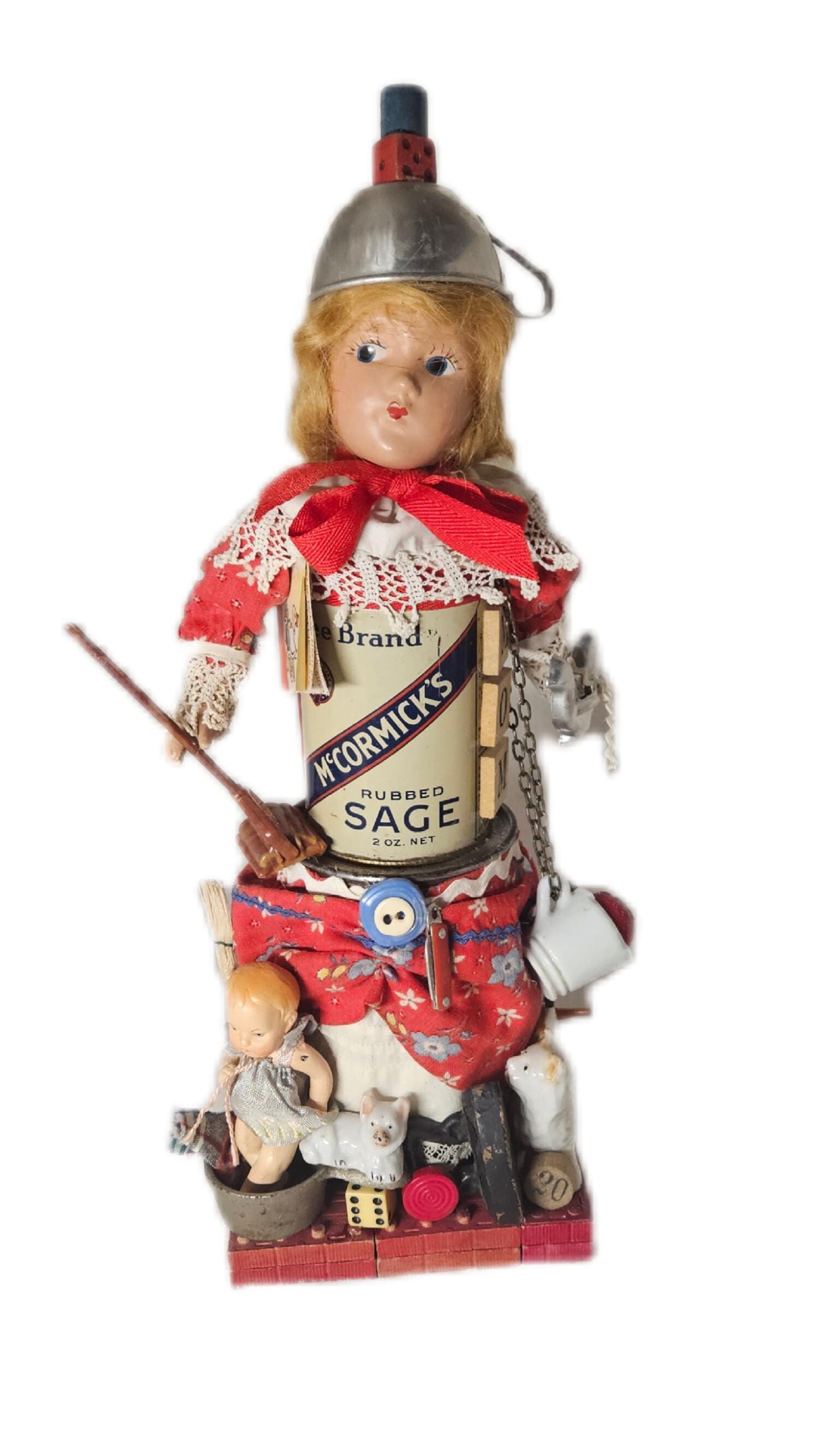 This charming piece features a vintage composition doll part is dressed in red with delicate lace trim and a tin cup crown, embodying both warrior and nurturer. She's surrounded by an eclectic collection of found objects that tell the story of motherhood: a vintage McCormick's Rubbed Sage spice tin forms her body (because mothers add the perfect seasoning to life), miniature household items including a tiny broom and bucket, a small baby doll, and various other treasured vintage finds.