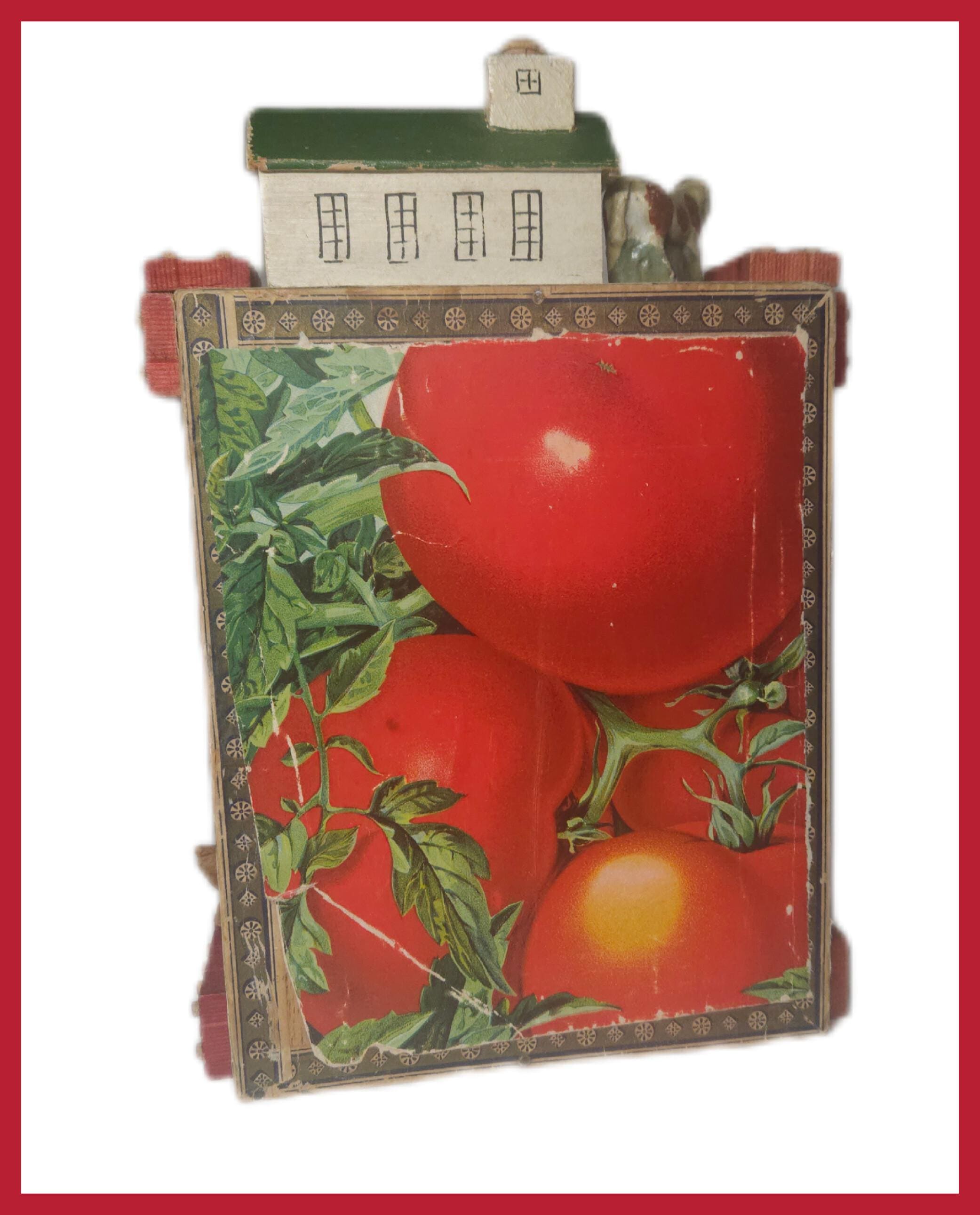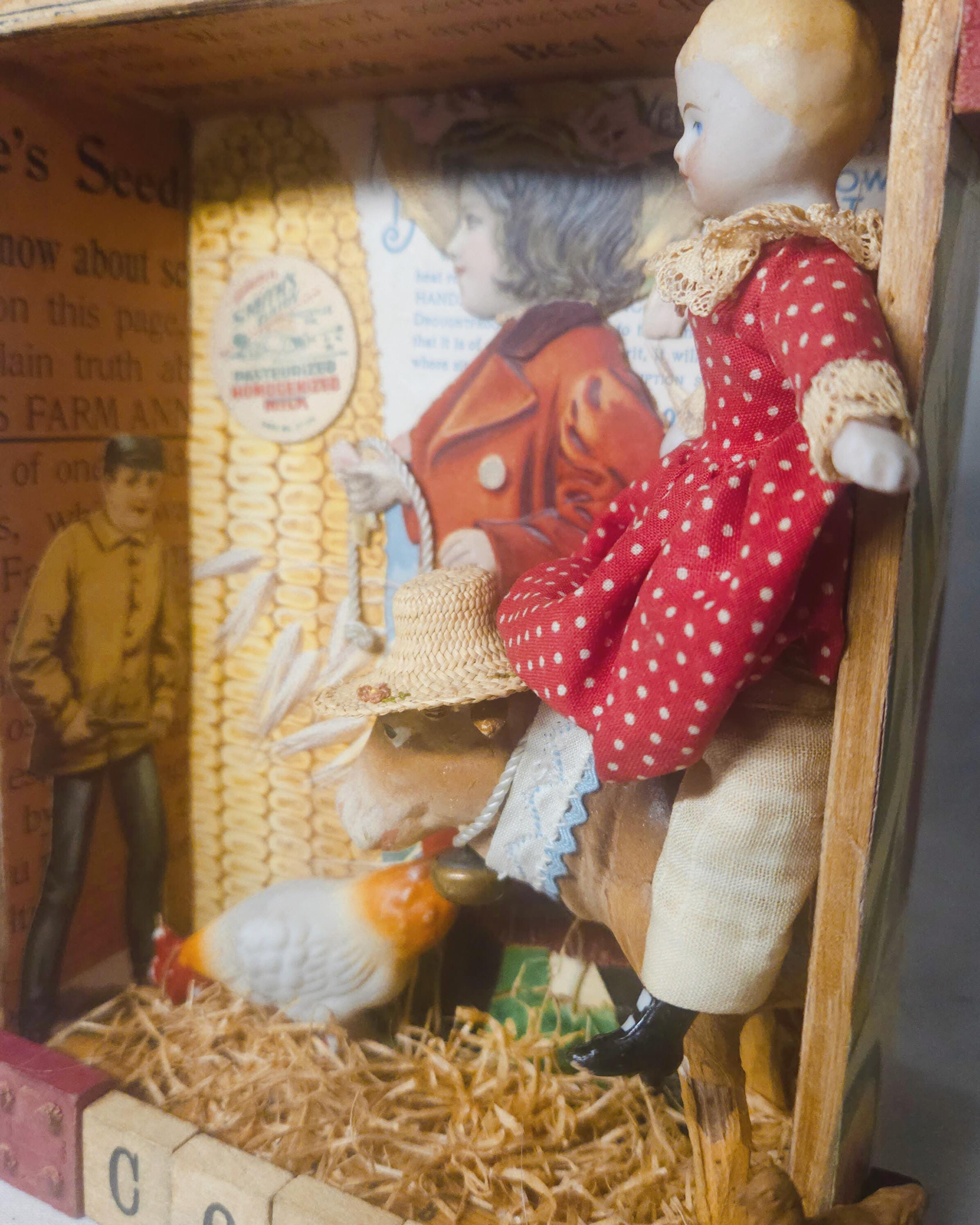 This shadow box is a delightful creation. I repurposed a beloved composition cow, integrating it into an assemblage. The foundation of this piece is an antique wooden cigar box, adorned with vintage illustrations from seed catalogs on its background and exterior. A charming vintage china head doll is perfectly positioned atop the cow. The straw element is, in fact, repurposed stuffing from a cloth doll, reflecting a commitment to sustainable practices. The piece is crowned with a vintage wooden house and an additional composition cow, further embellished with antique wooden building blocks. The dimensions of this piece are approximately 8" x 12".
