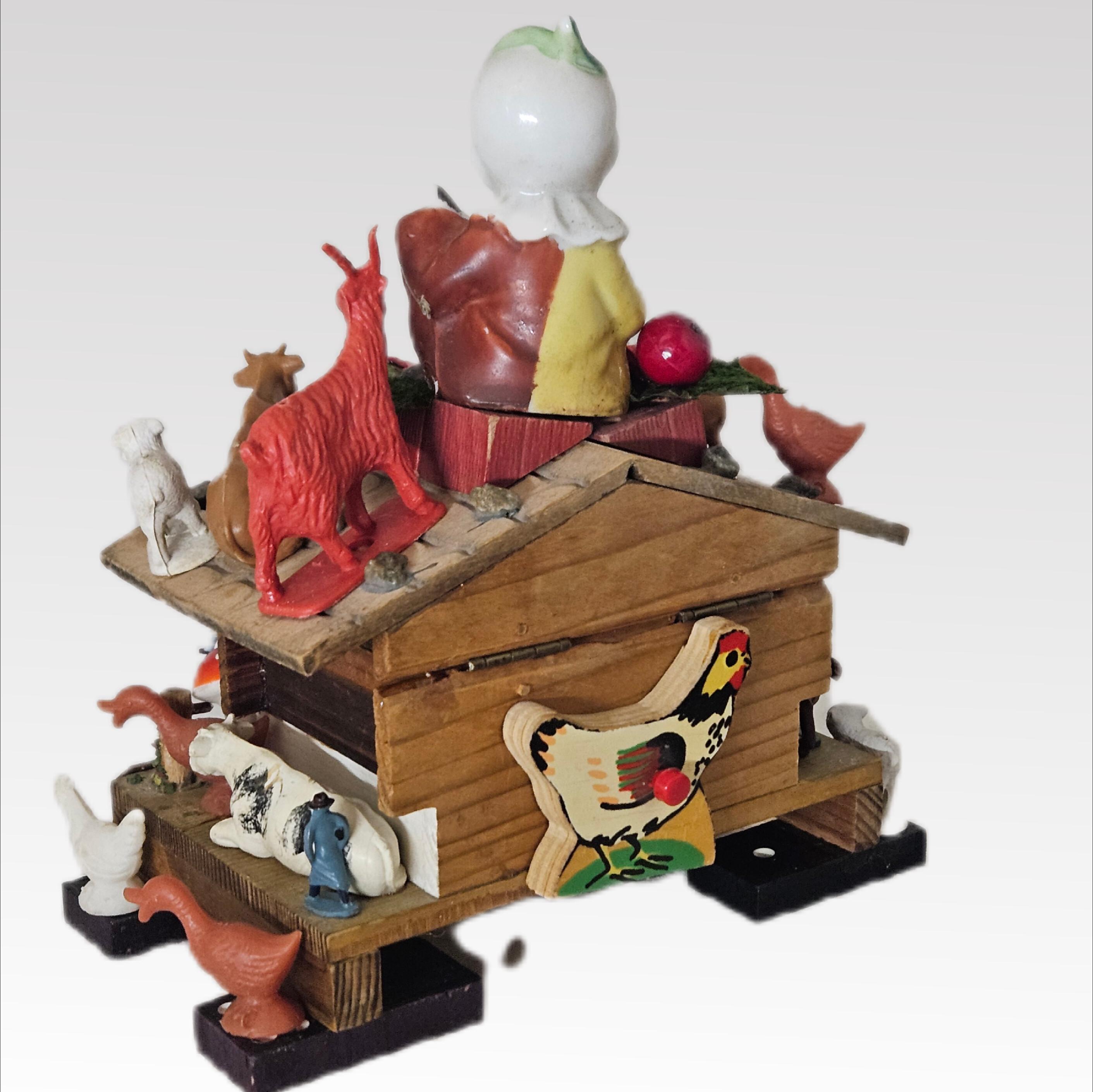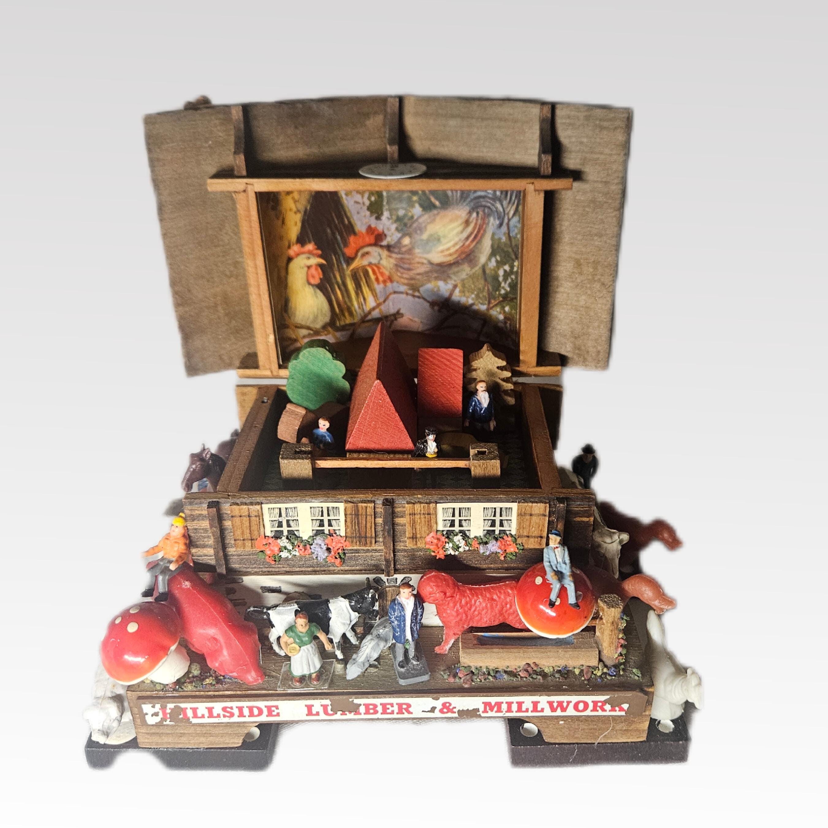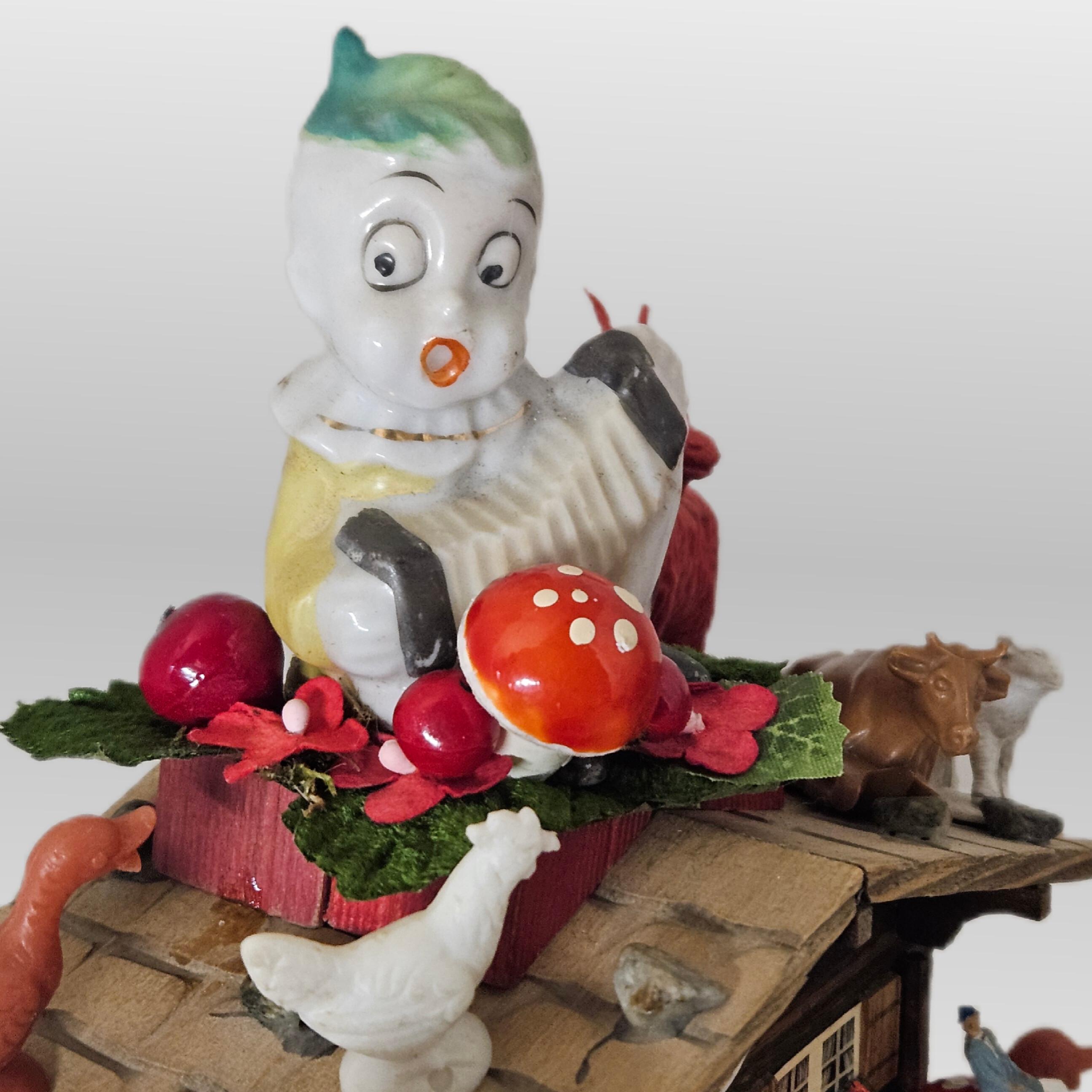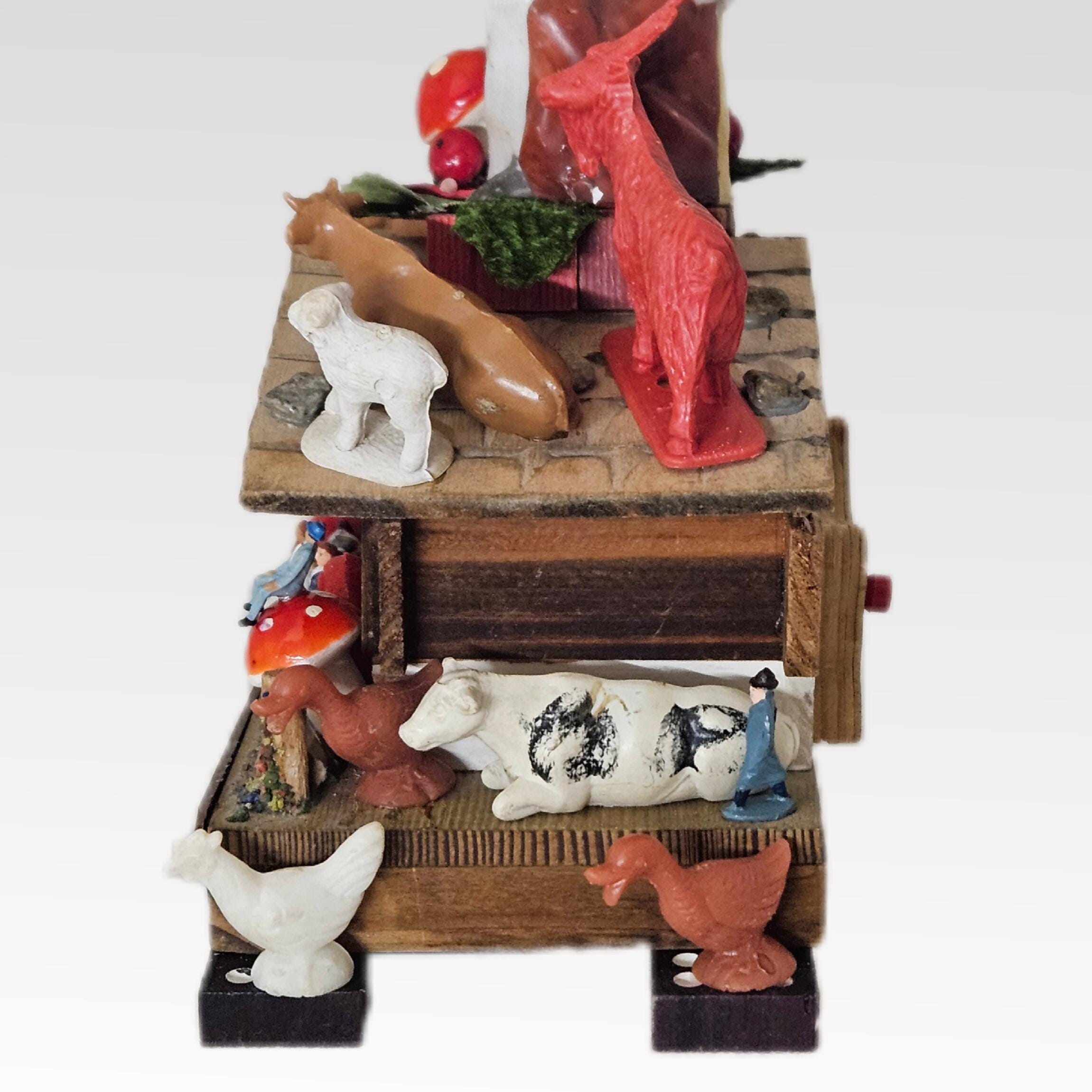 Check out this charming, whimsical assemblage made from a repurposed vintage German music box! Open up the roof and you'll find a surprise little farm inside! It's got old train layout miniatures, toy animals, spun cotton mushrooms, and the sweetest vintage ceramic pixie.