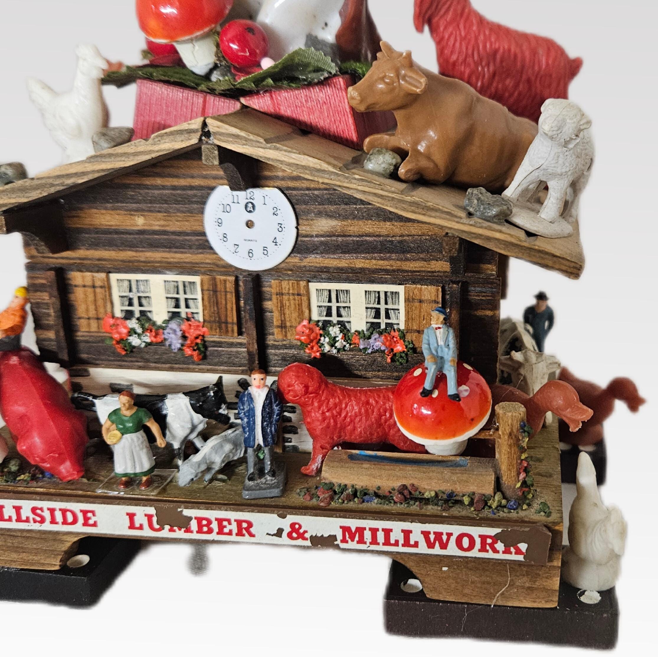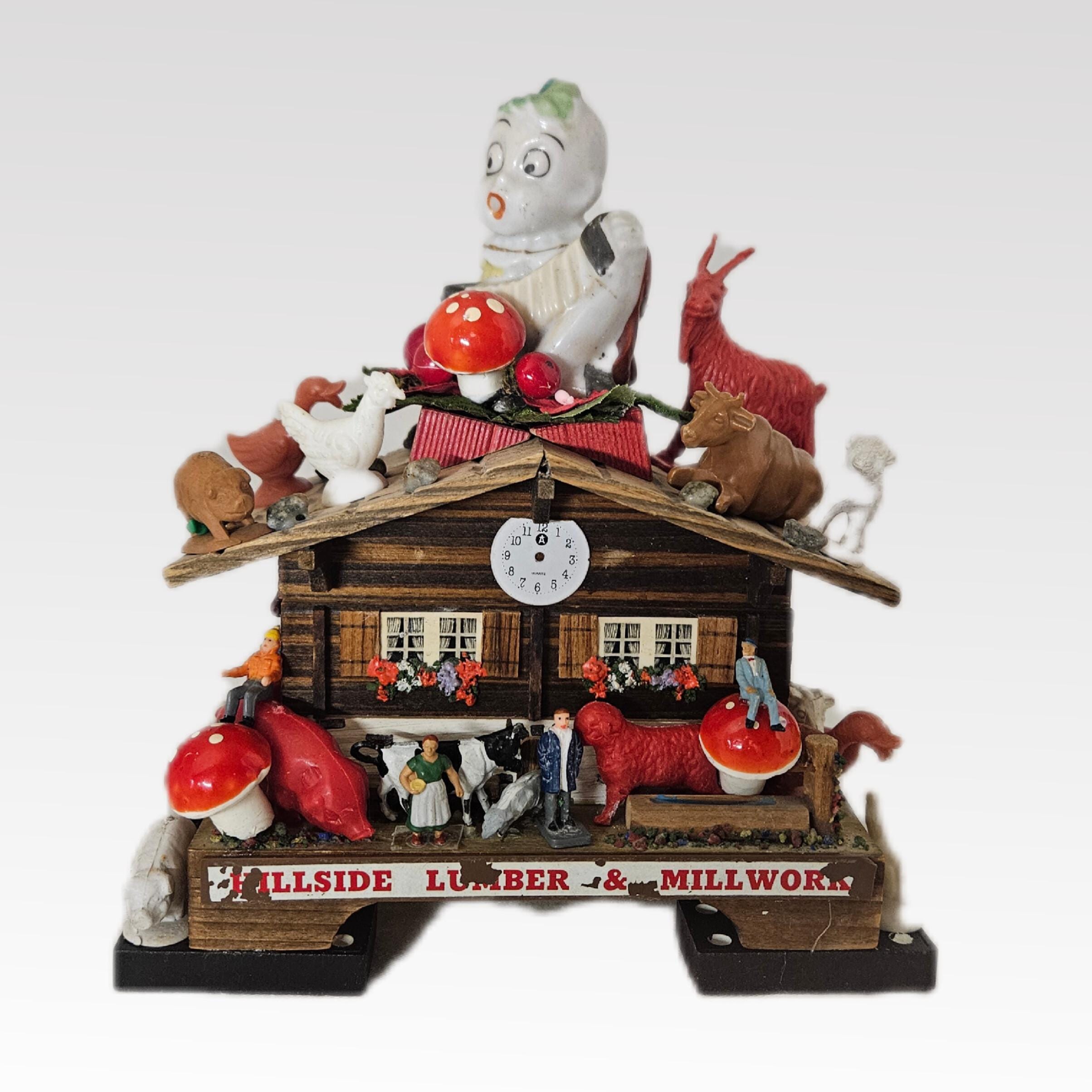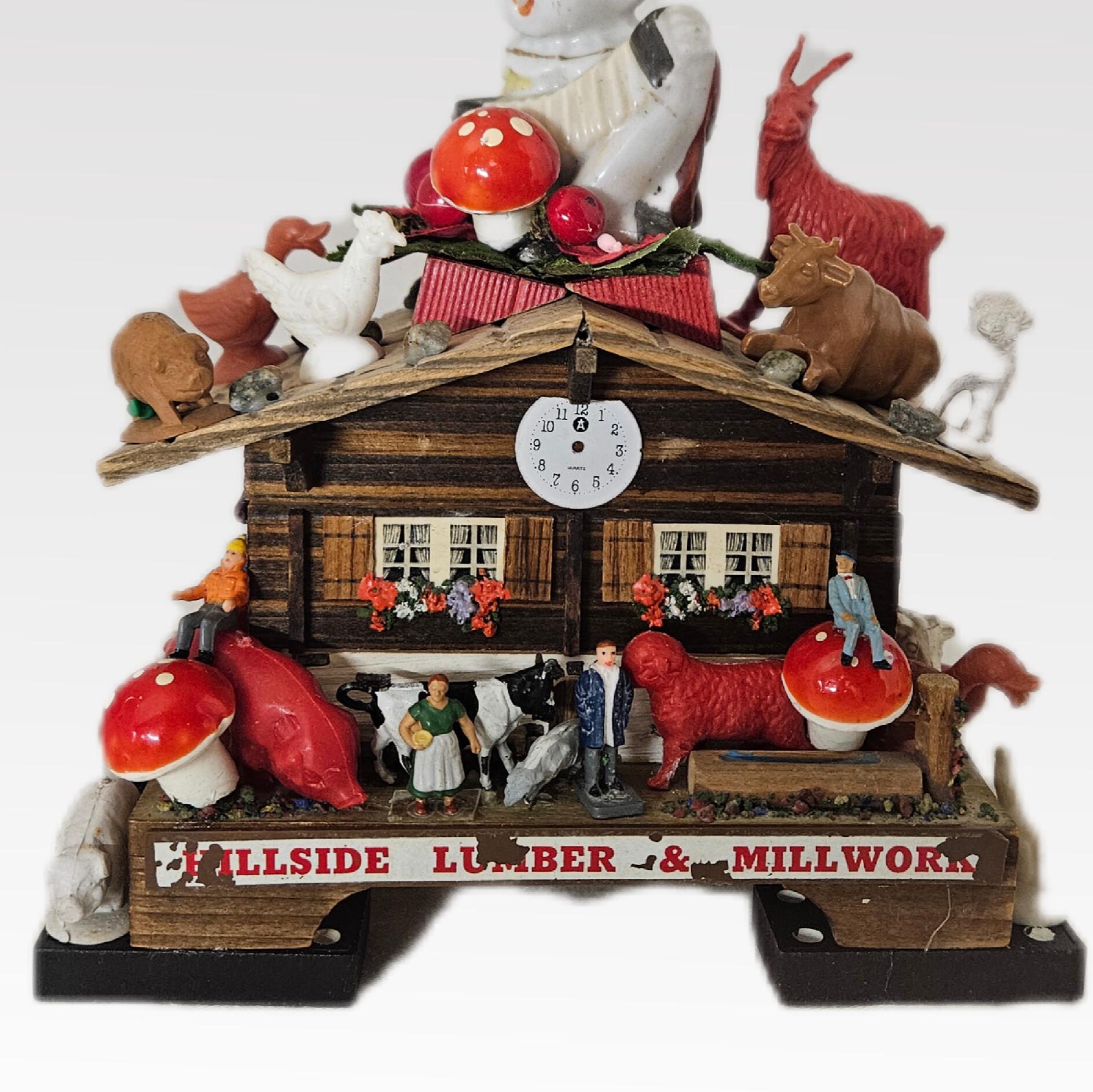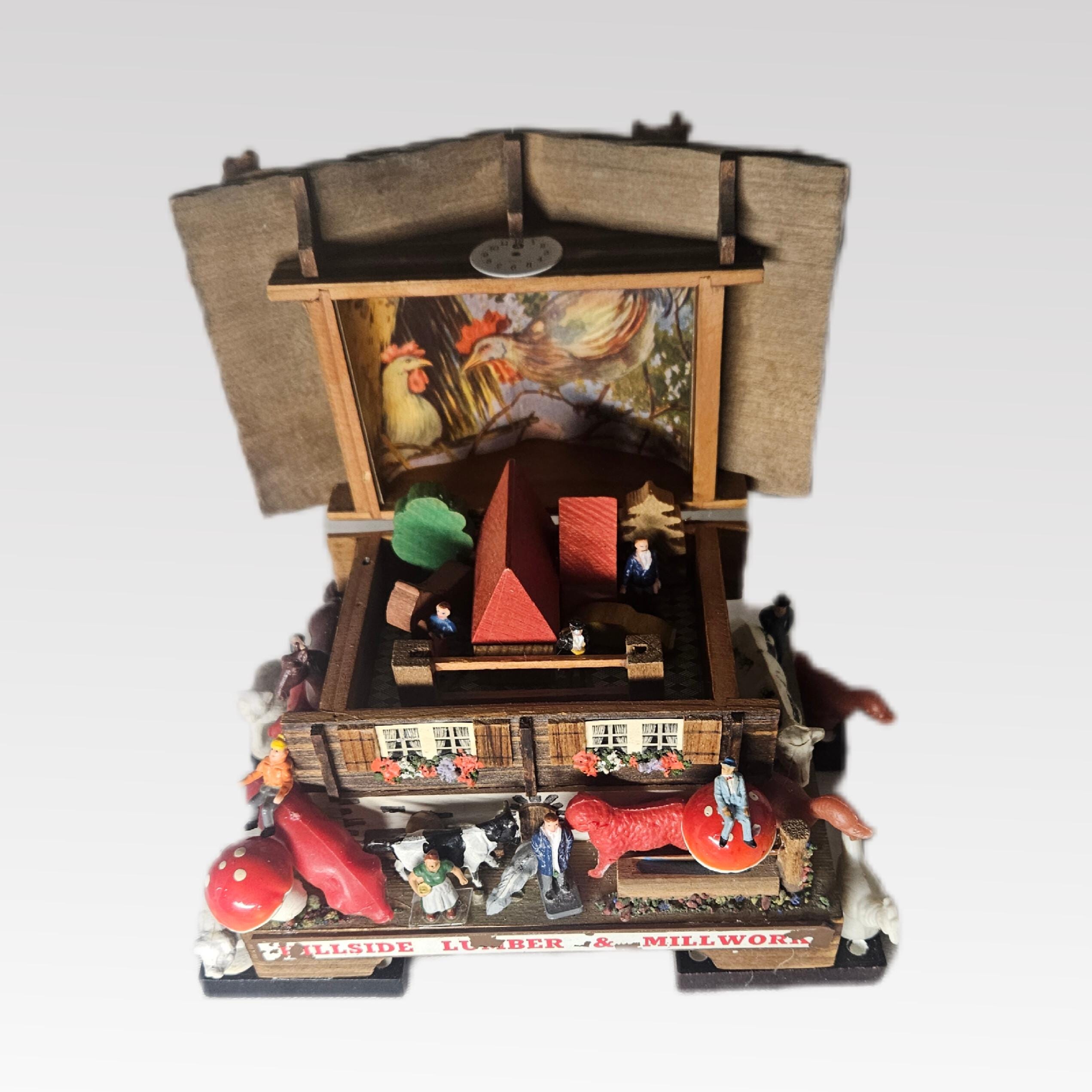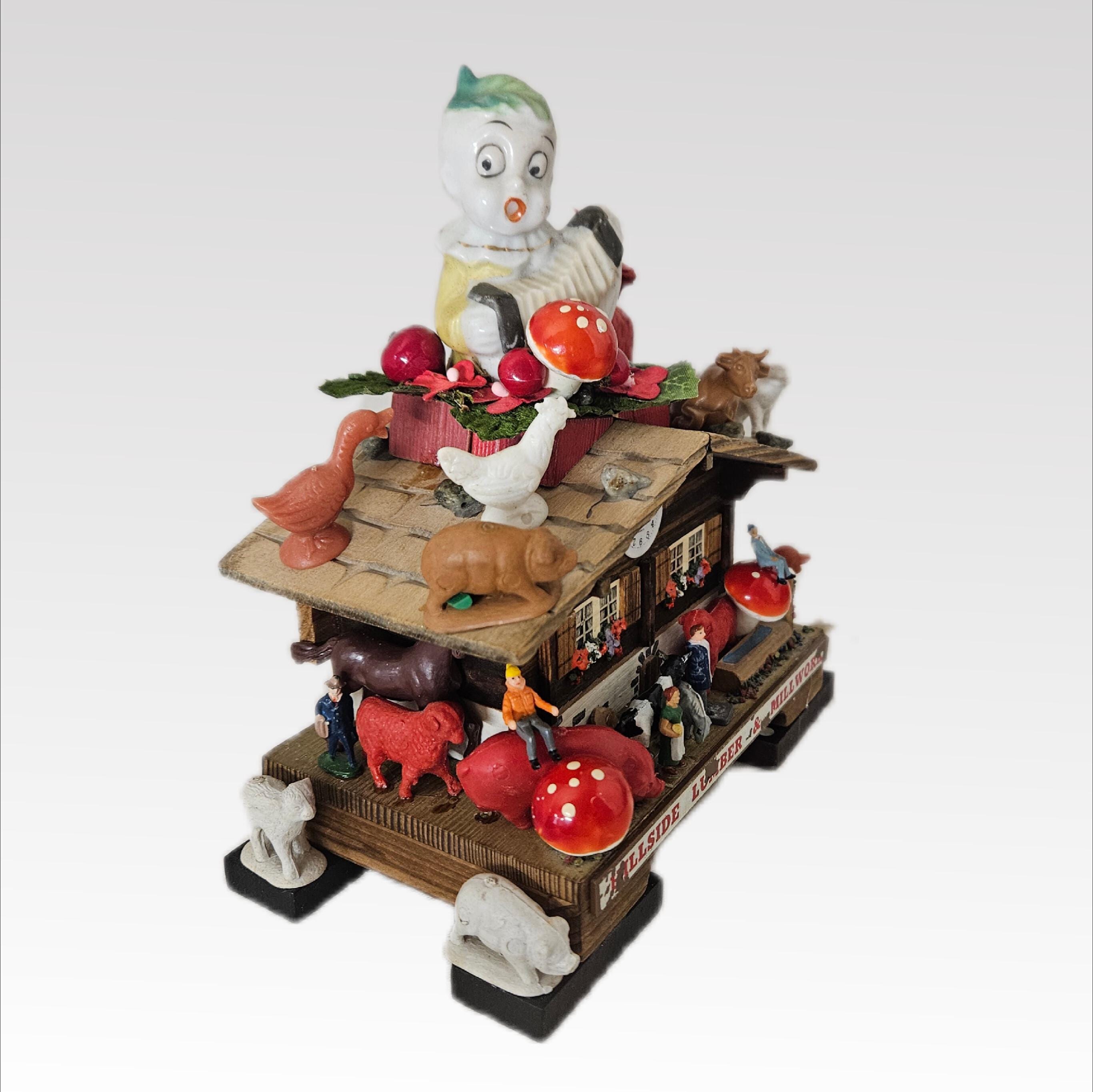Check out this charming, whimsical assemblage made from a repurposed vintage German music box! Open up the roof and you'll find a surprise little farm inside! It's got old train layout miniatures, toy animals, spun cotton mushrooms, and the sweetest vintage ceramic pixie.