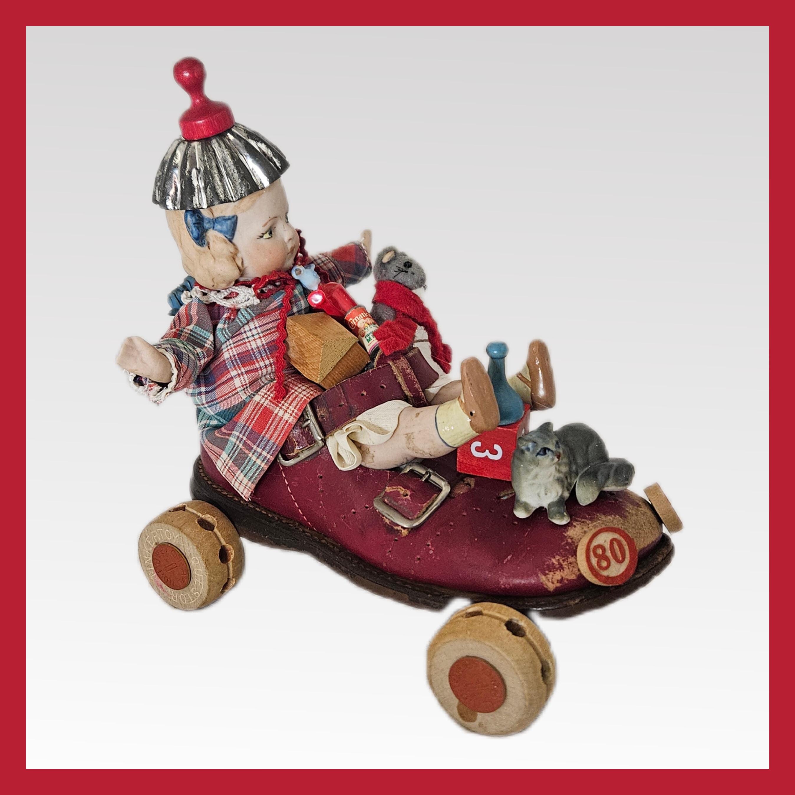 Discover this charming vintage shoe sculpture—a whimsical road trip decor piece that combines playful doll art with inventive repurposing. Crafted from a vintage child's red leather shoe, this unique one-of-a-kind assemblage transforms a classic item into a humorous kitschy car travel scene that’s sure to spark joy and conversation.