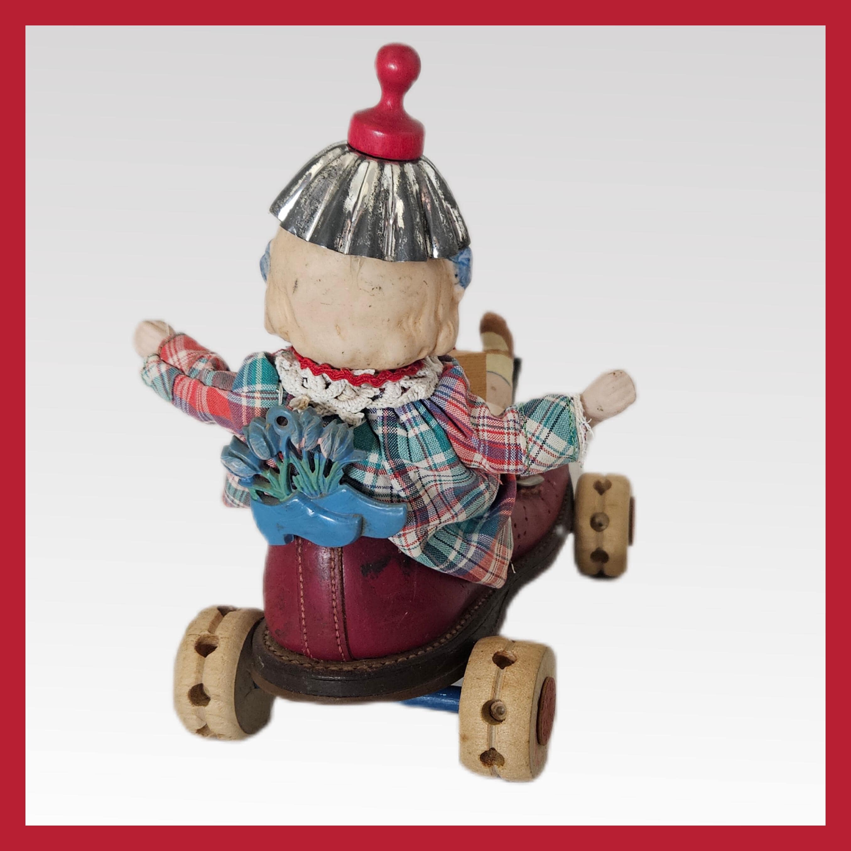 Imagine a sweet bisque doll nestled inside the shoe, with her legs up in the air, ready for adventure. Adding to the fun, a playful cat is riding along as a passenger, while a tiny felt mouse is tucked in her arm for an extra touch of whimsy. The shoe has been creatively fitted with Tinker Toy wheels, turning it into a delightful miniature automobile that captures the spirit of carefree road trips.