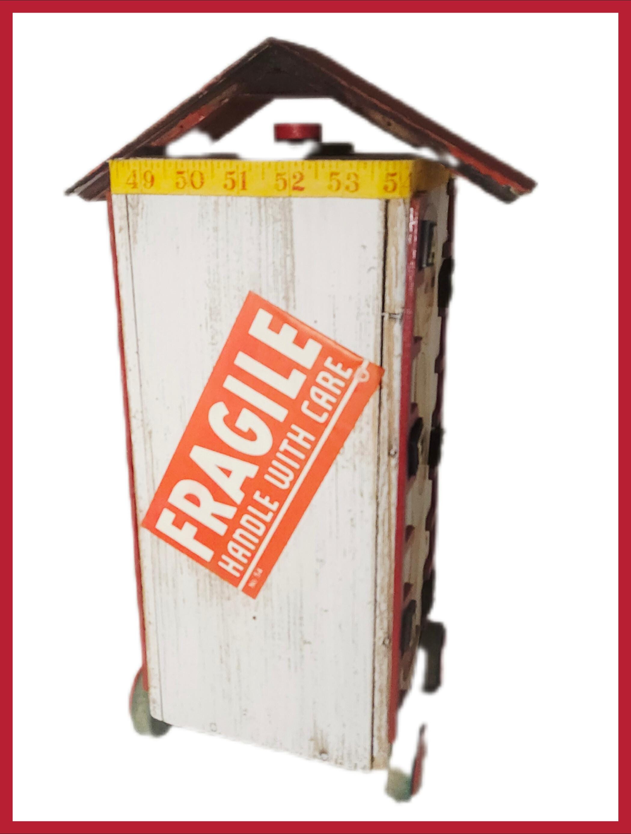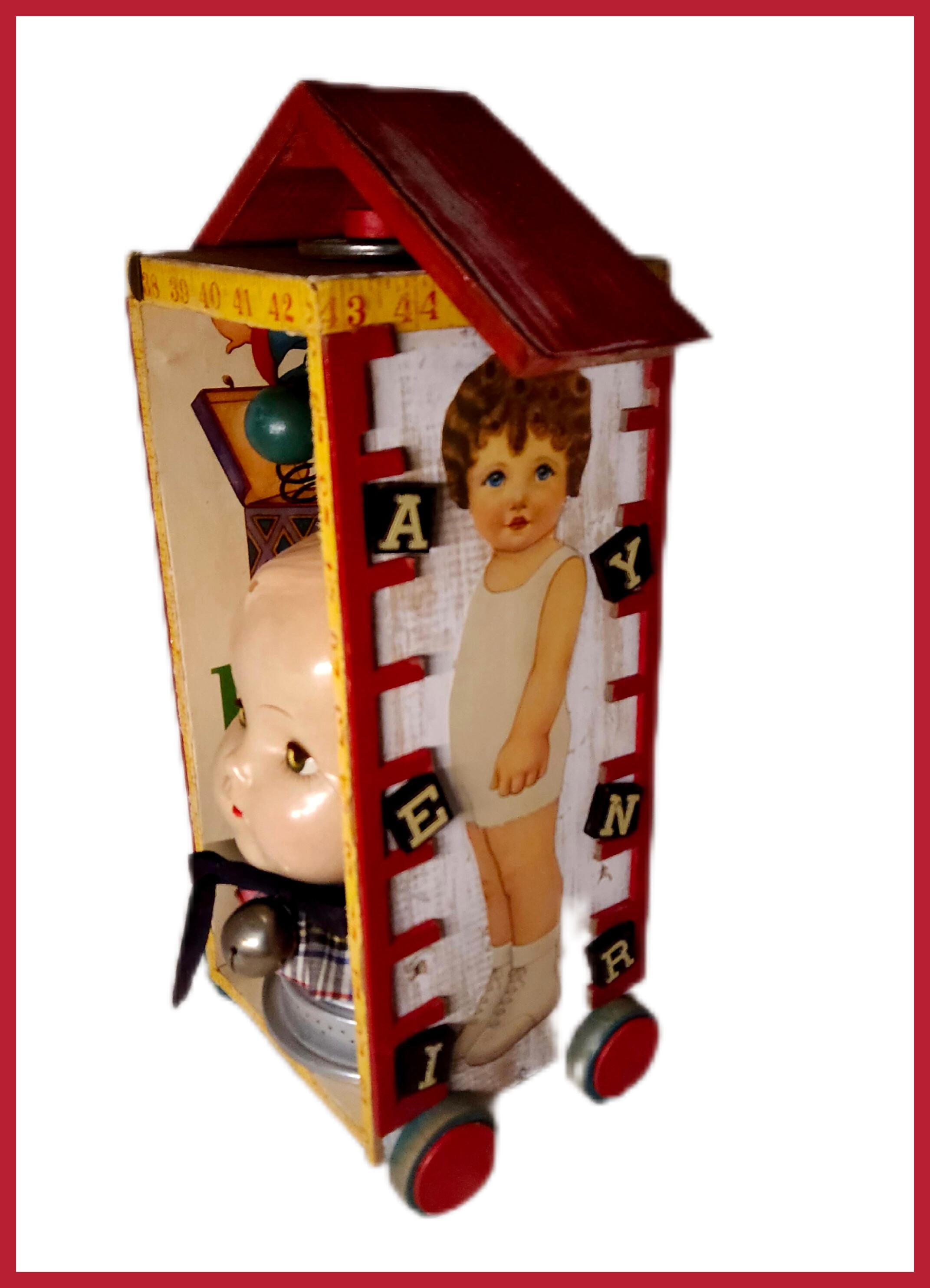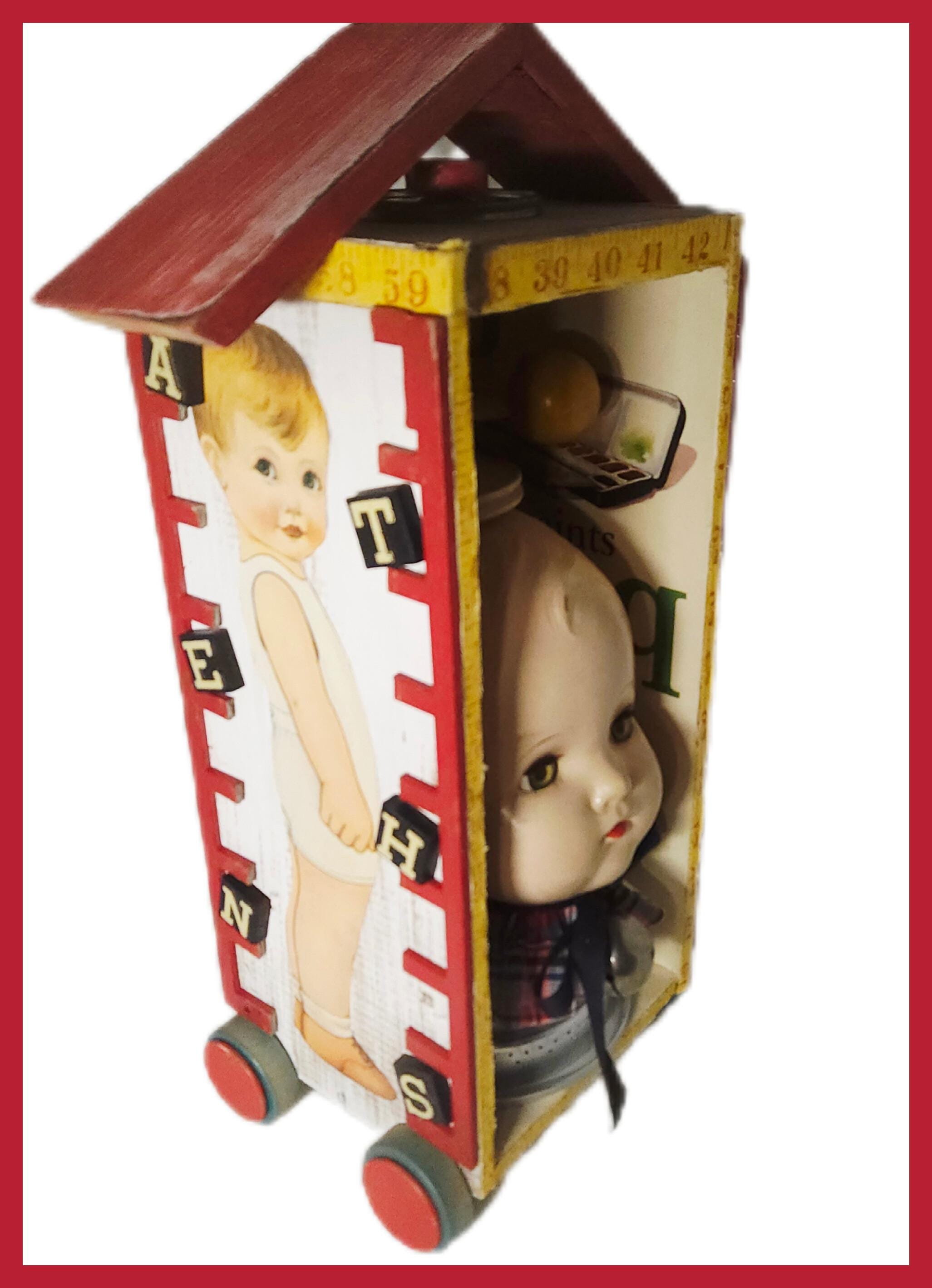 Crafted with an eye for detail, this assemblage features a vintage doll's head nestled inside a vibrant, transformed wooden box . The box is decorated with colorful geometric patterns, a playful measuring tape border, and a charming roof, transforming it into a whimsical art box that invites curiosity and wonder. The doll's expressive face, with bright eyes and a subtle smile, adds a nostalgic touch, while the mixed media elements, including wooden beads and fabric accents, bring a lively, tactile quality to the piece.