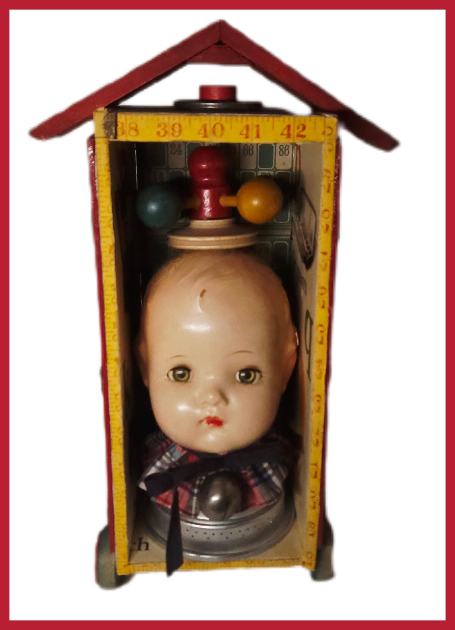 Discover a whimsical doll head assemblage that sparks childhood nostalgia and colorful imagination. This unique mixed media toy is a playful art piece that combines vintage charm with artistic creativity, perfect for ABC decor or eclectic display.