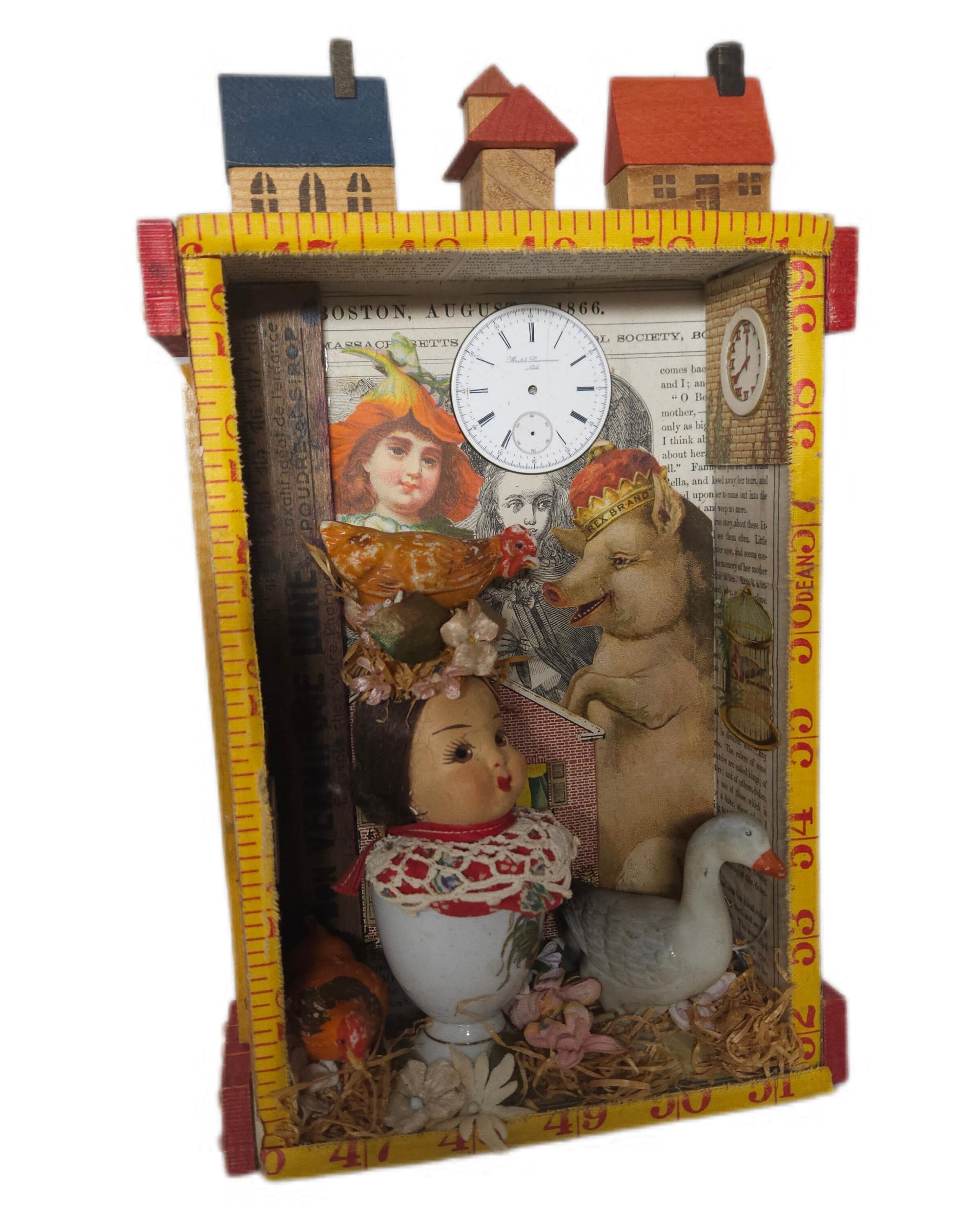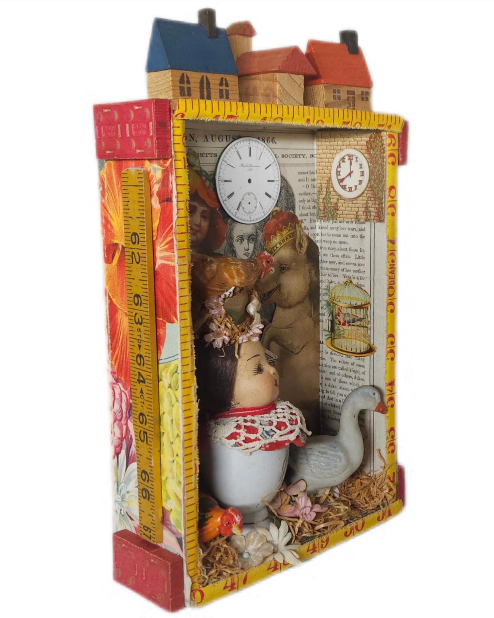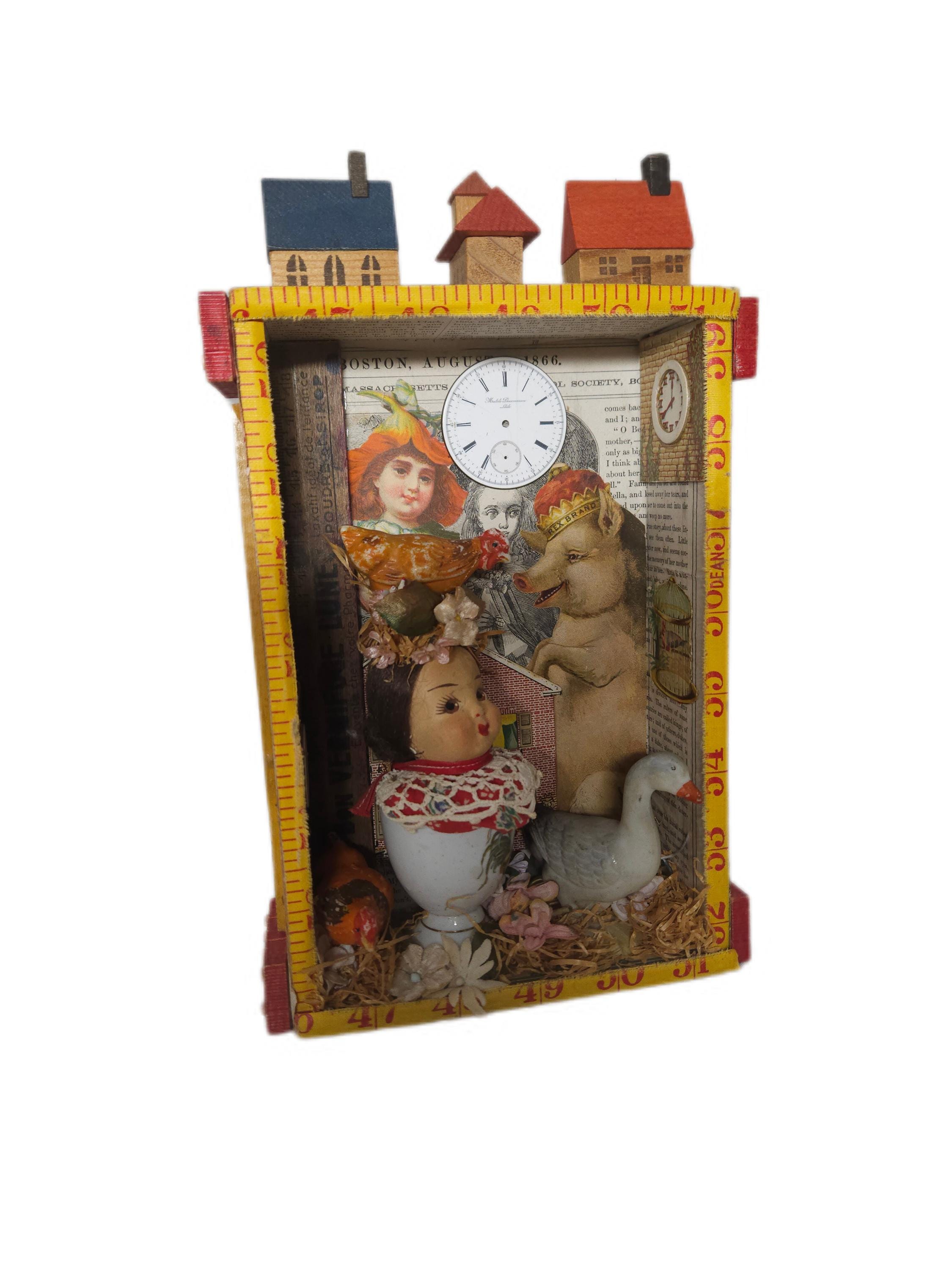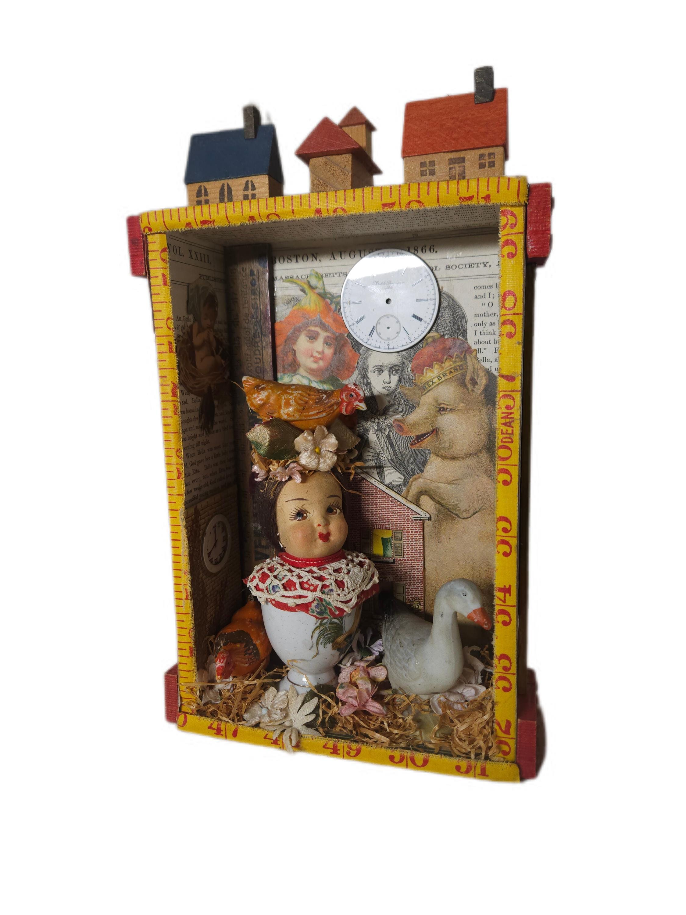 This shadow box is a delightful creation. The foundation of this piece is an antique wooden cigar box, adorned with vintage illustrations from seed catalogs on its exterior Inside I used a page from an 1866 newsprint,diecut girl, a fabulous pig and a cardboard section from a house. . The vintage doll head sits atop a vintage rooster egg cup . The doll has a bisque chicken in a nest of straw and millinery flowers on her head for a quirky hat. Another bisque chicken and goose add to the farmhouse theme. Atop the box are 3 vintage wooden putz houses.