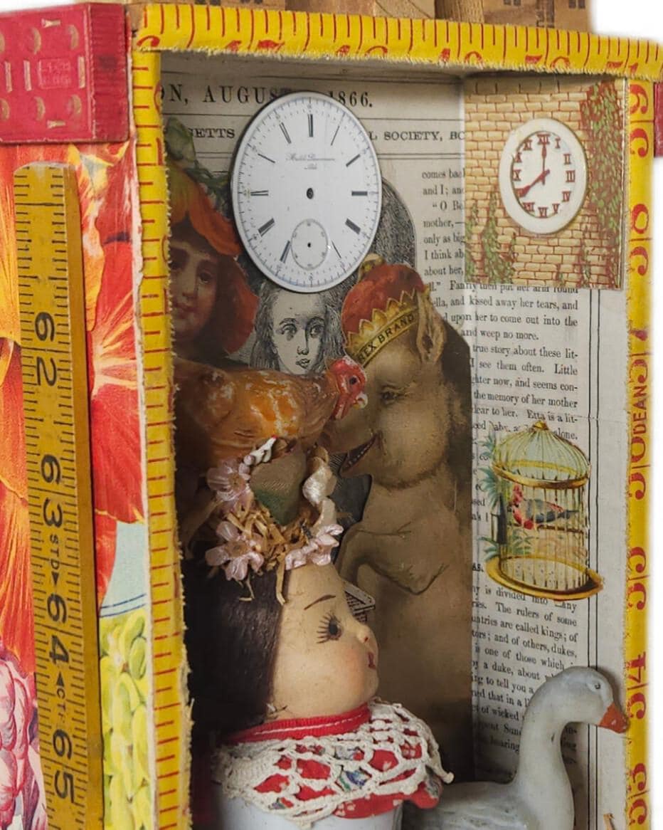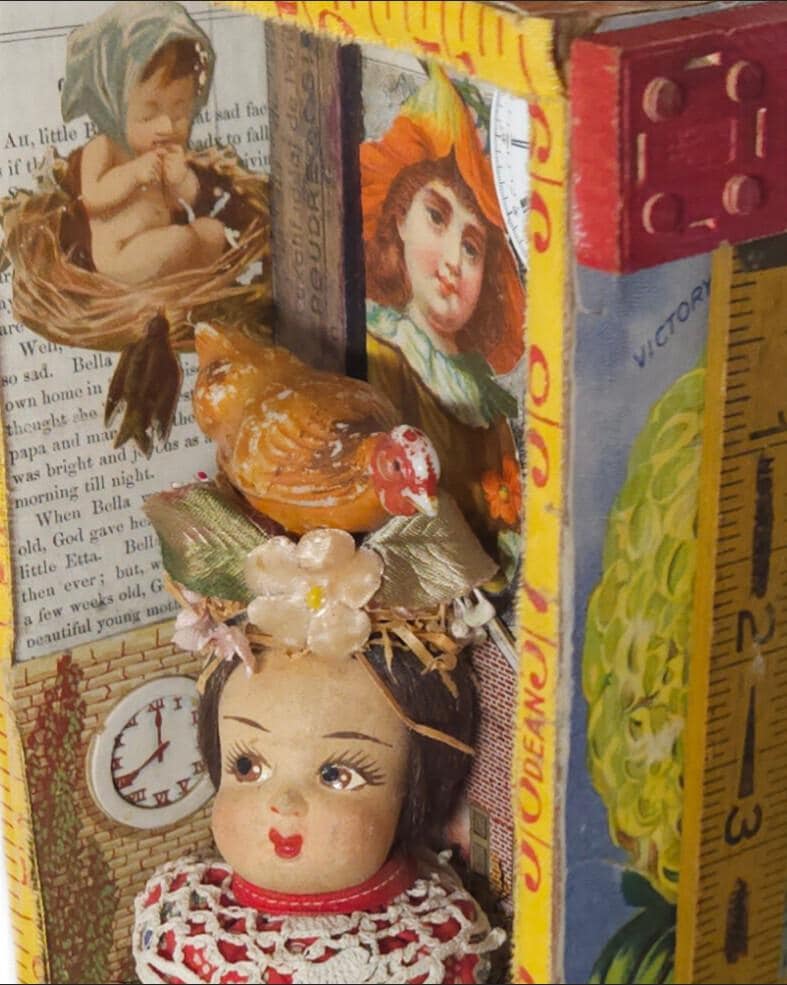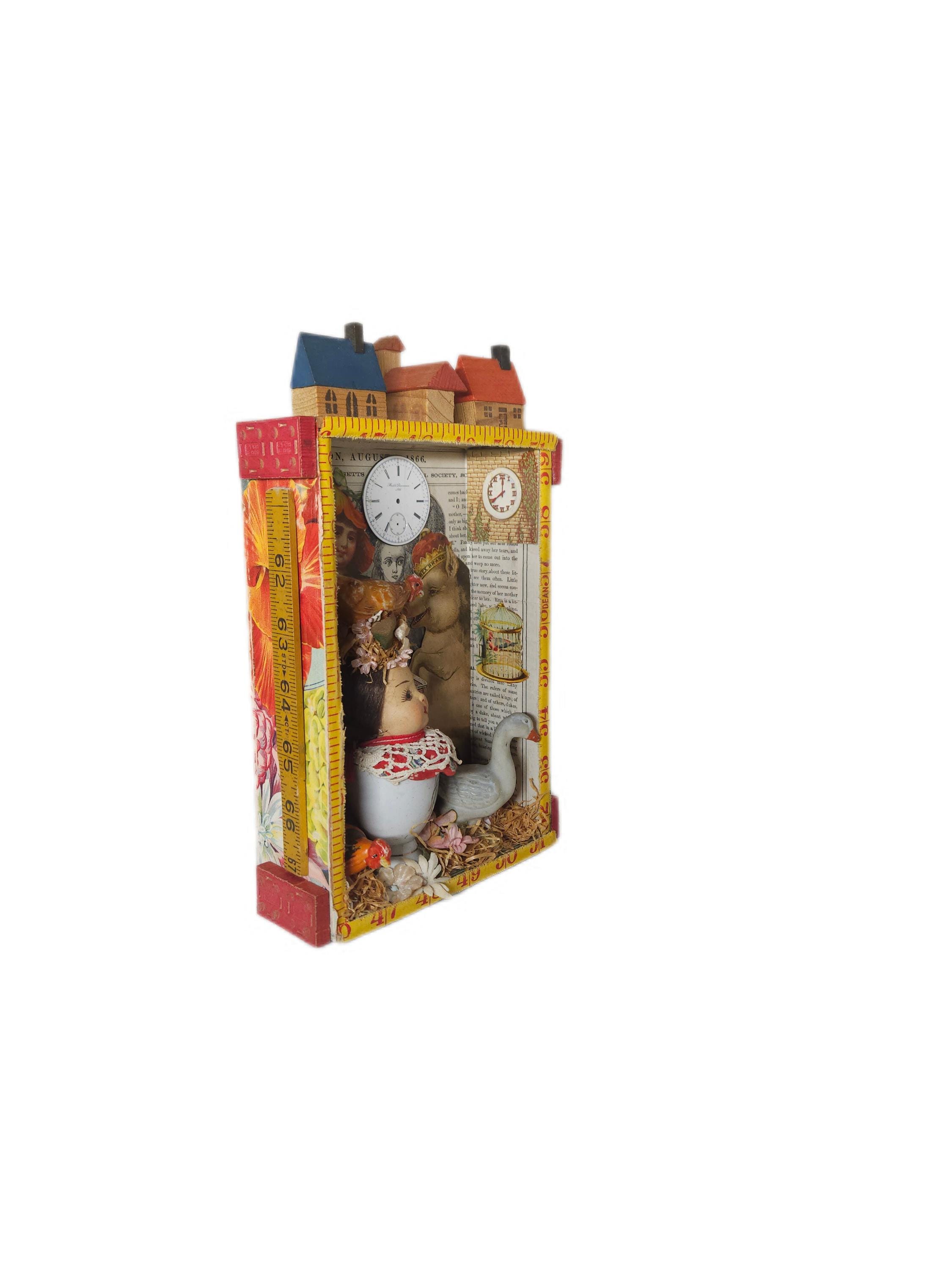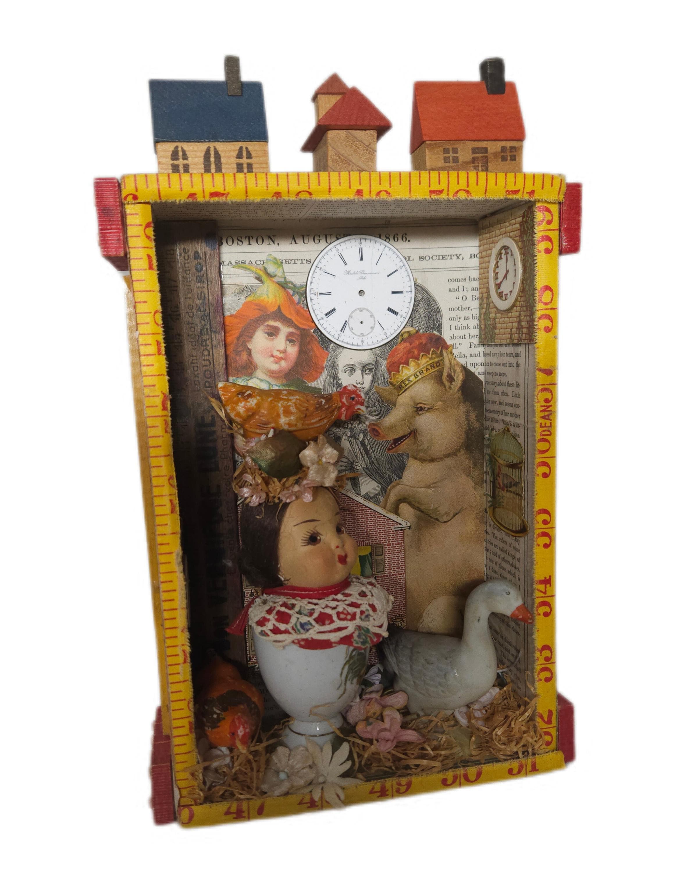 This shadow box is a delightful creation. The foundation of this piece is an antique wooden cigar box, adorned with vintage illustrations from seed catalogs on its exterior Inside I used a page from an 1866 newsprint,diecut girl, a fabulous pig and a cardboard section from a house. . The vintage doll head sits atop a vintage rooster egg cup . The doll has a bisque chicken in a nest of straw and millinery flowers on her head for a quirky hat. Another bisque chicken and goose add to the farmhouse theme. Atop the box are 3 vintage wooden putz houses.
