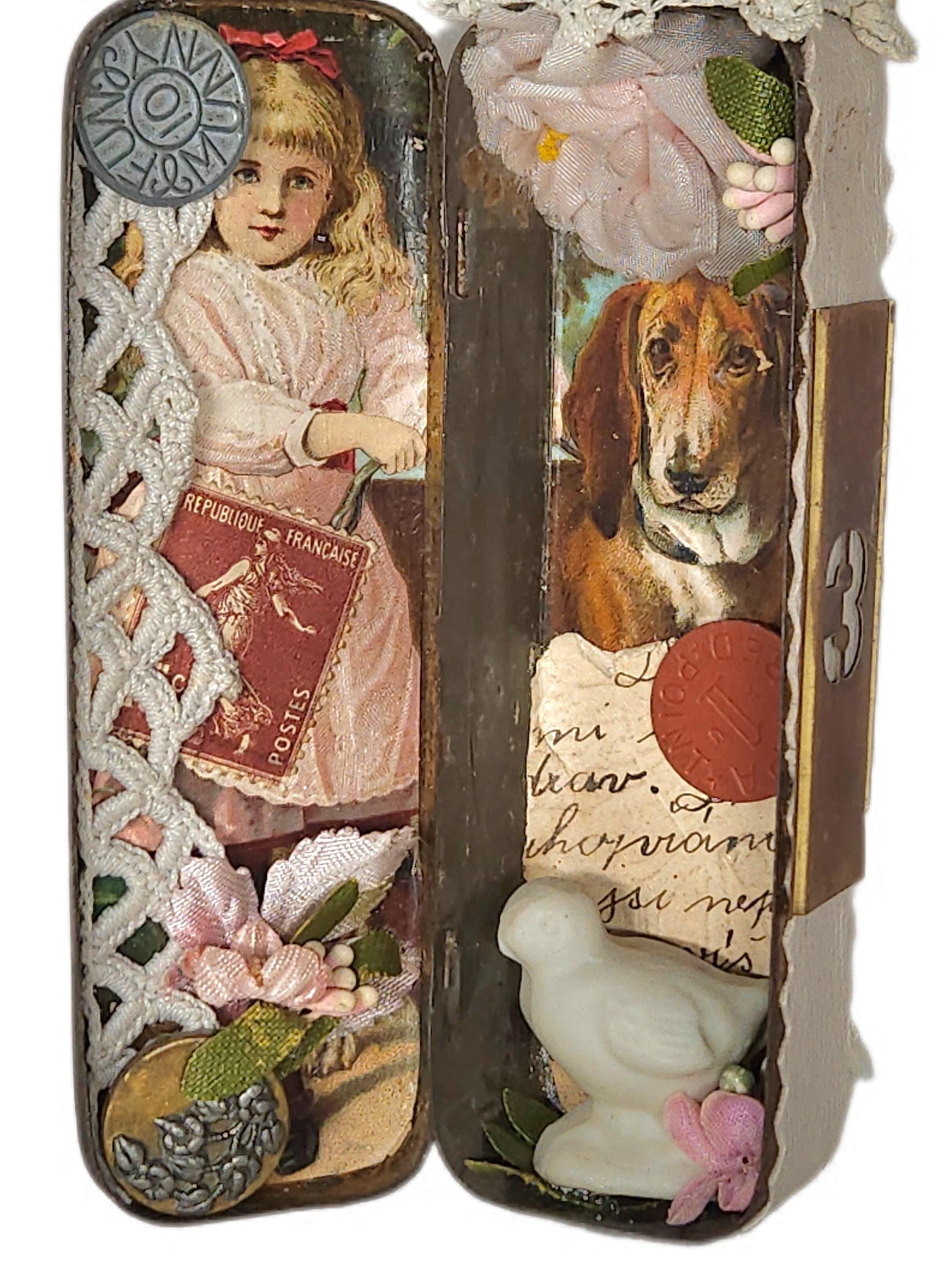 * Materials: Vintage paper, lace, miniature figurines, mixed media elements, tin container