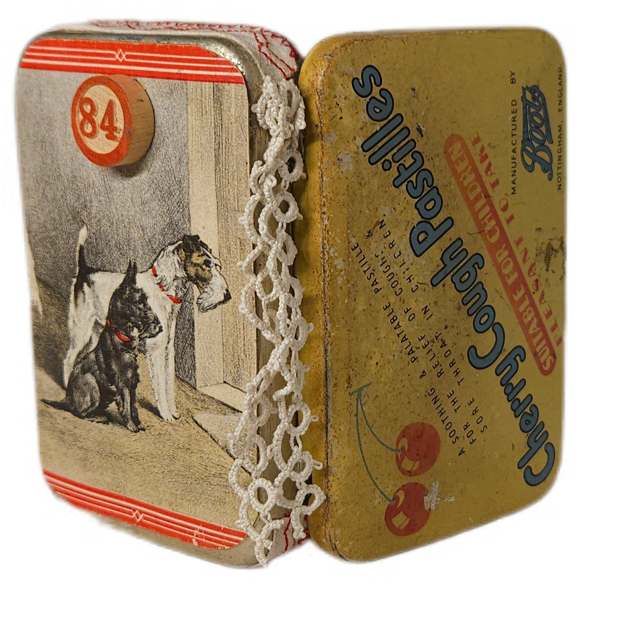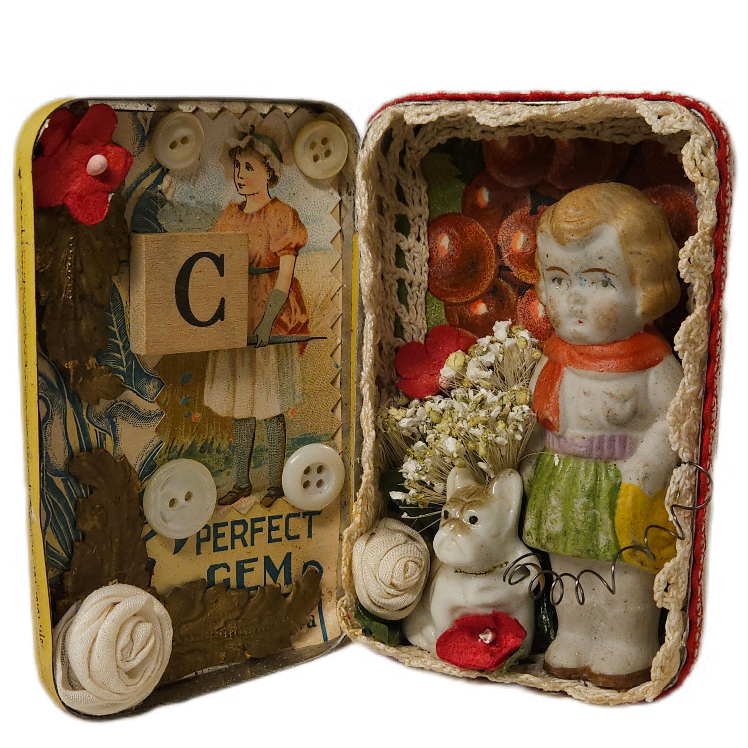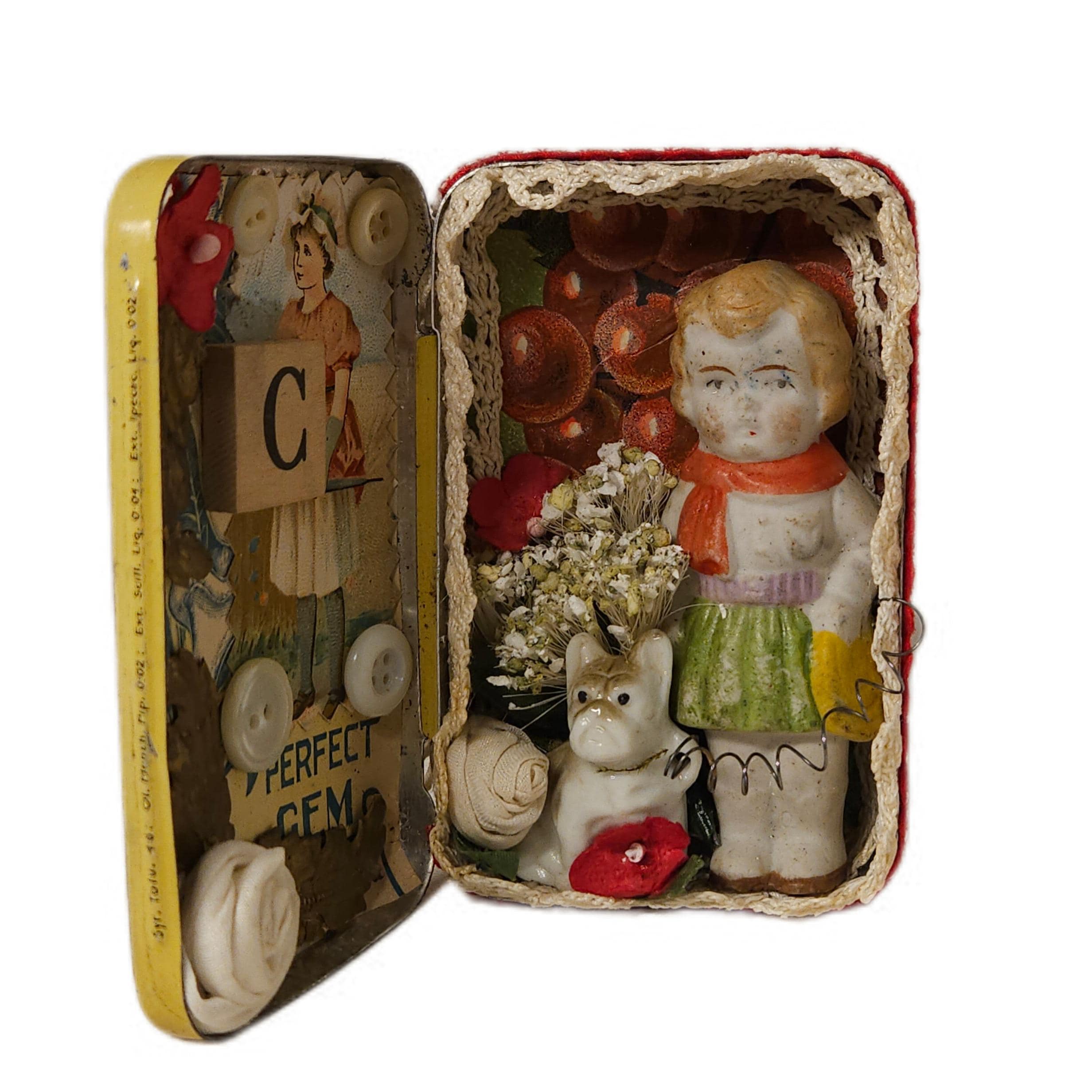 This is CHERRY , and her pet dog. Created in a vintage cherry medicine tin.