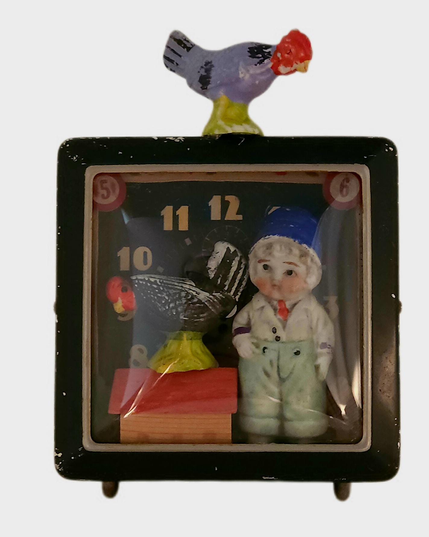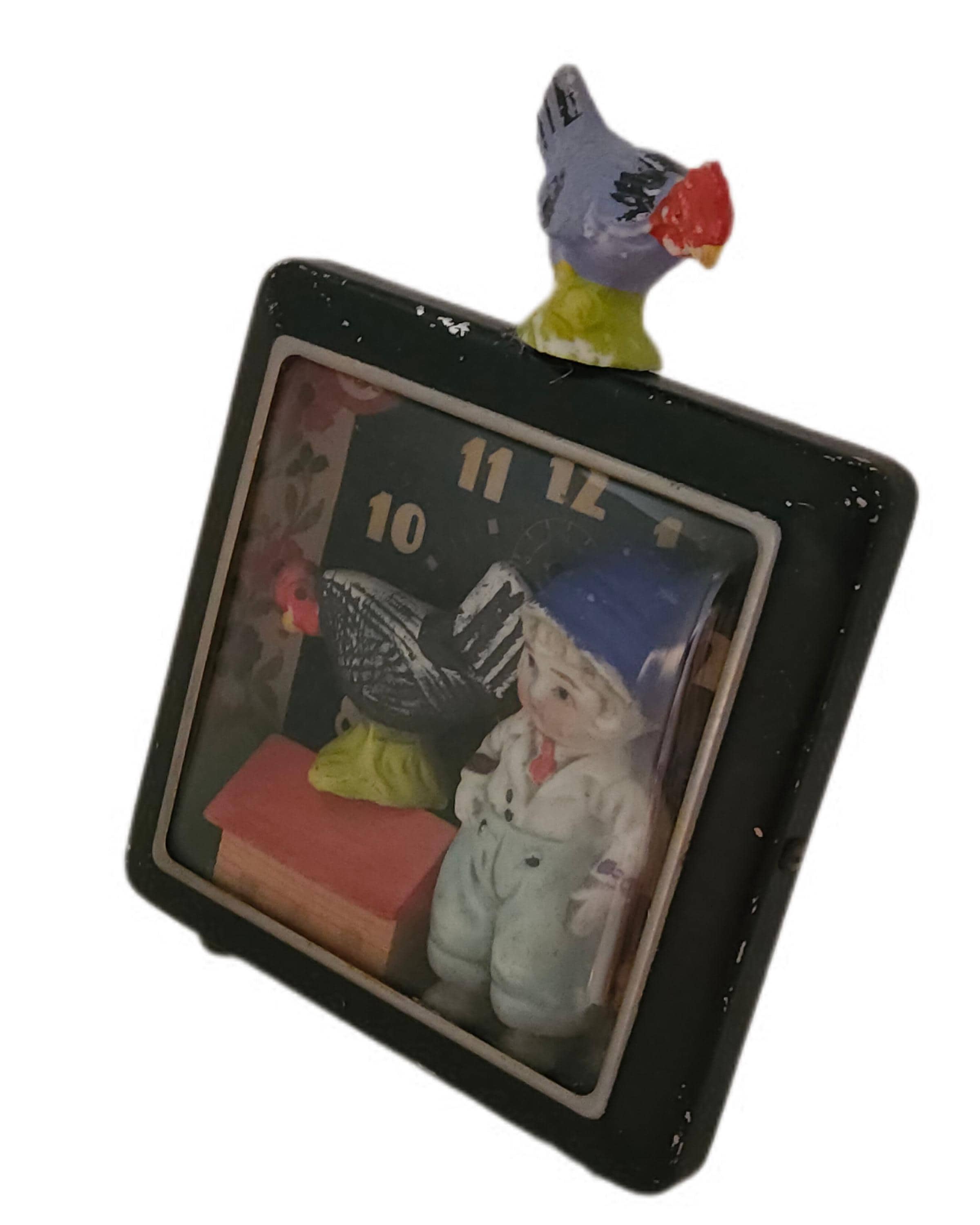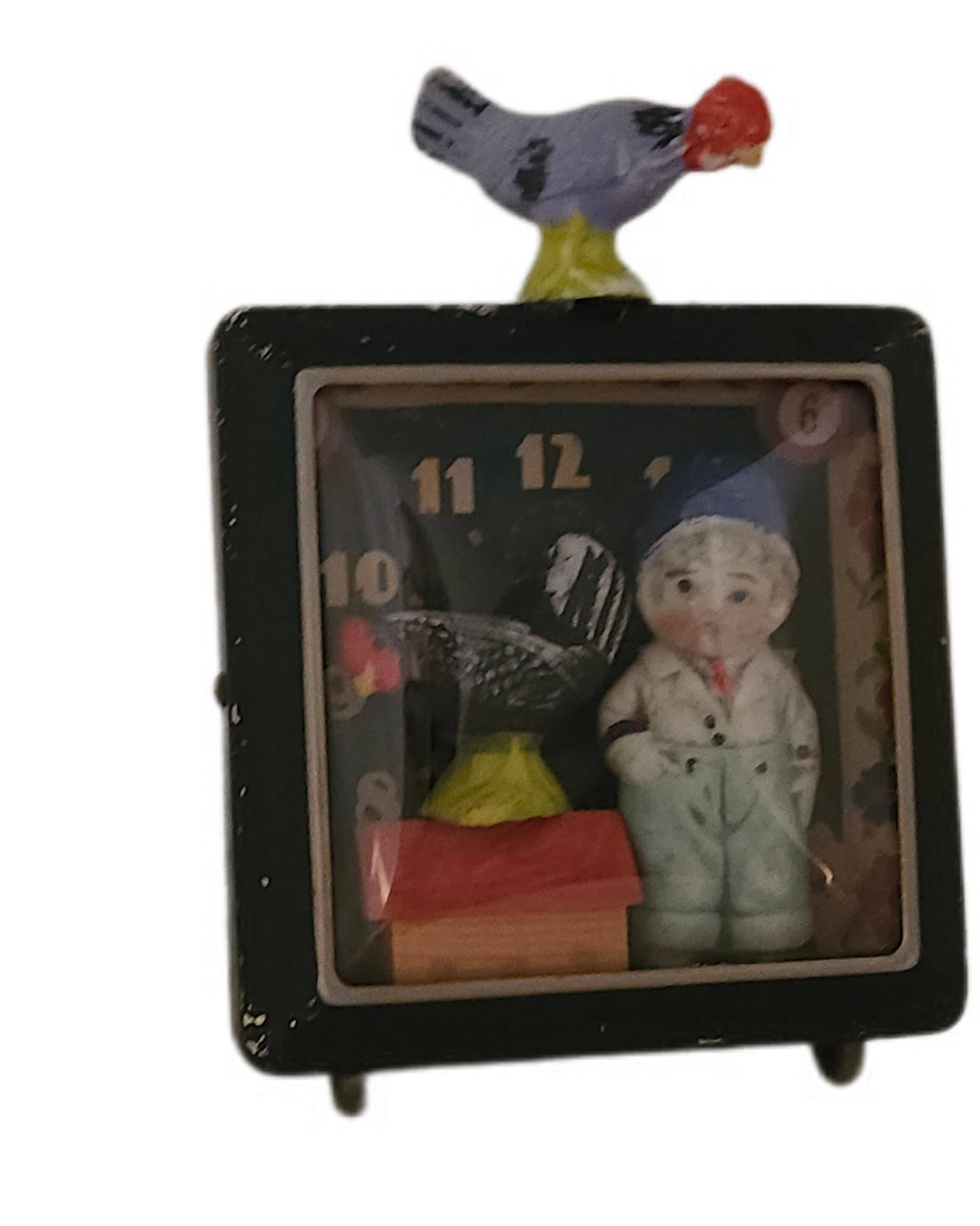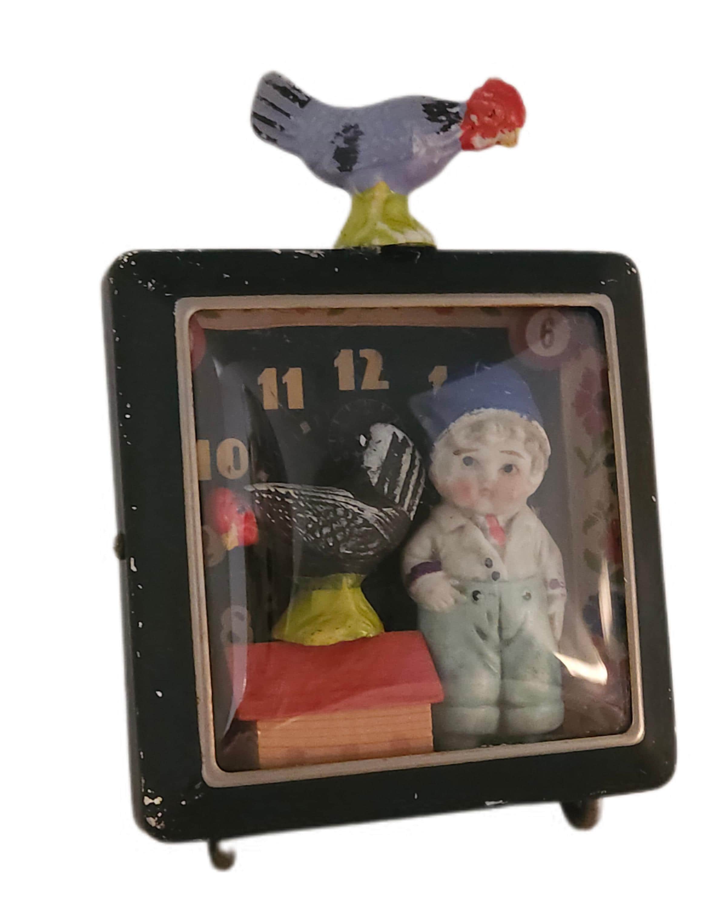 *Original mixed-media assemblage. Approximately 5 x 7". Bisque figures, painted bisque roosters, wooden German putz house and trees, vintage alarm clock case.*
