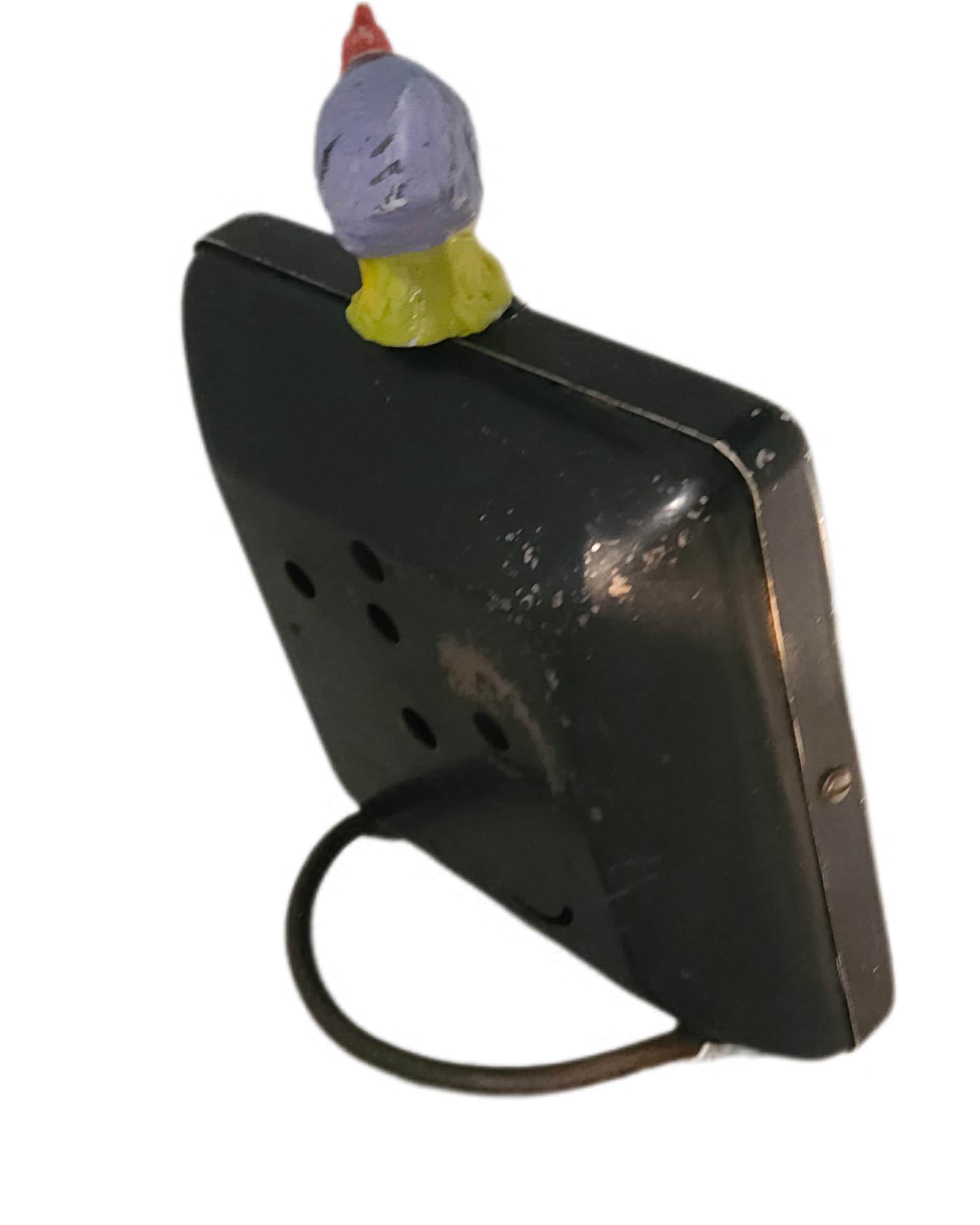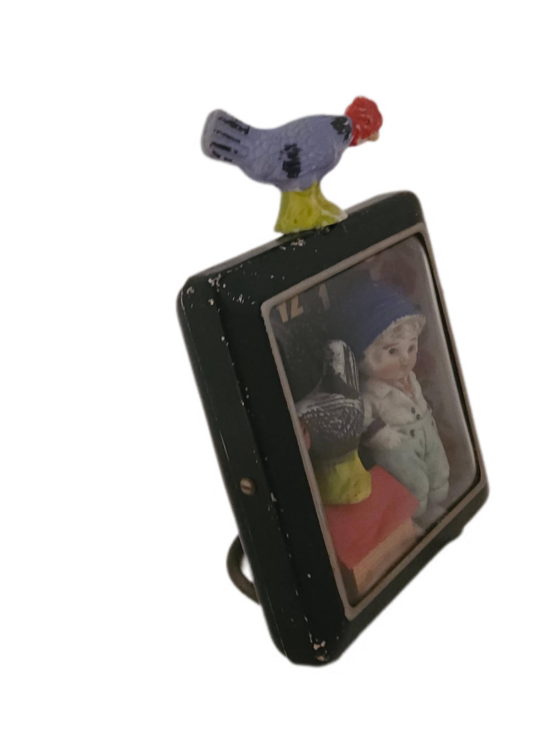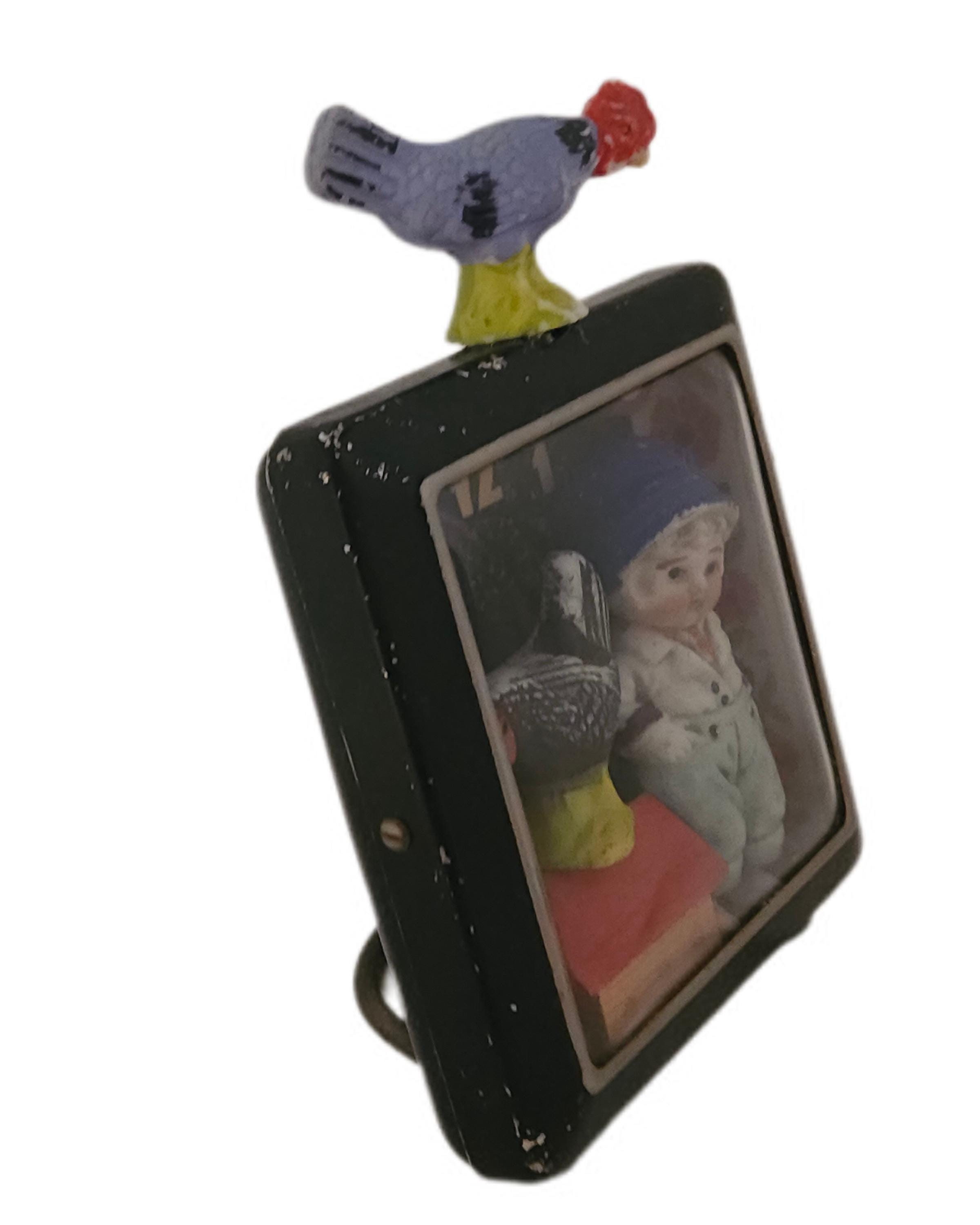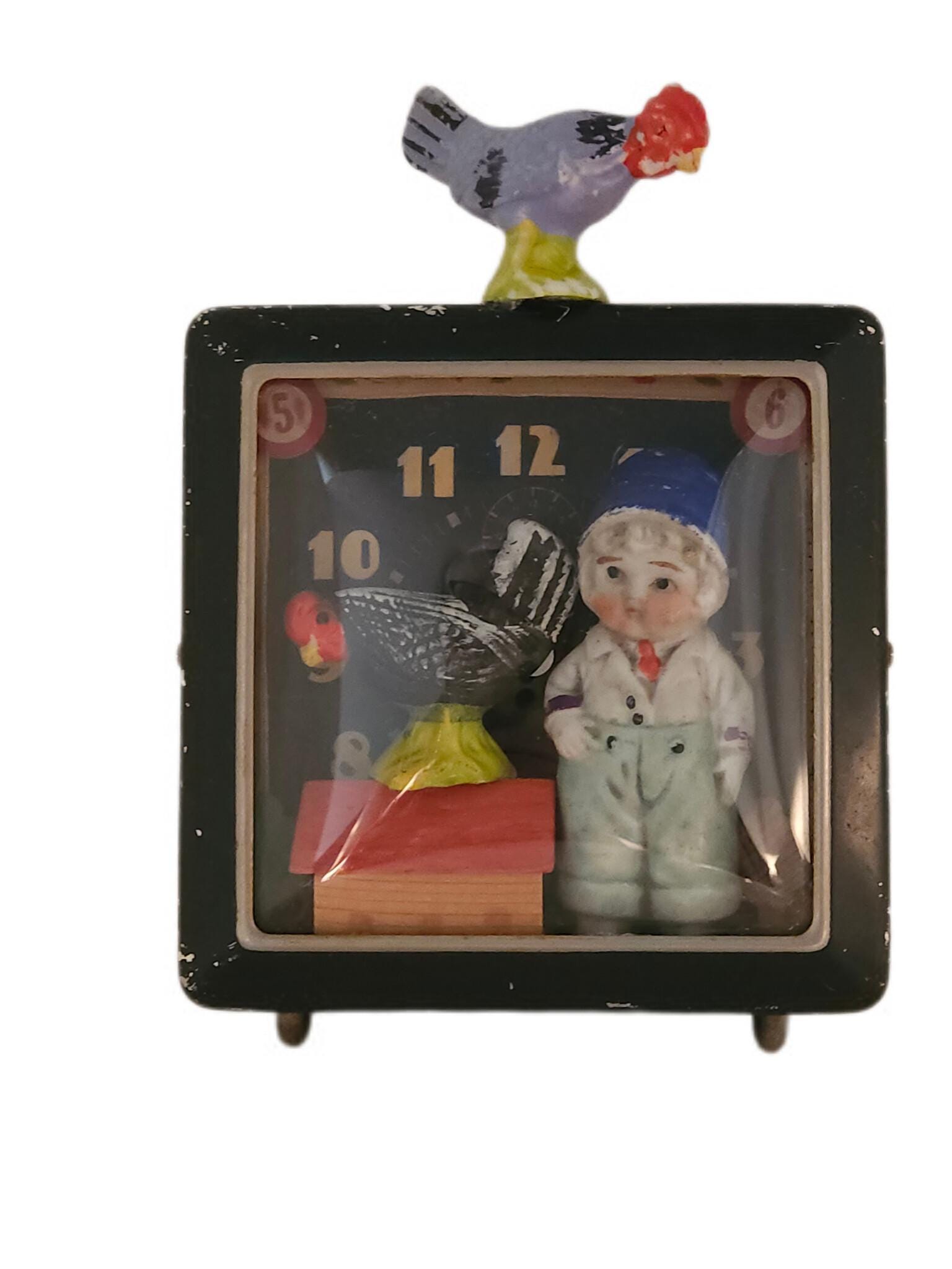 *Original mixed-media assemblage. Approximately 5 x 7". Bisque figures, painted bisque roosters, wooden German putz house and trees, vintage alarm clock case.*