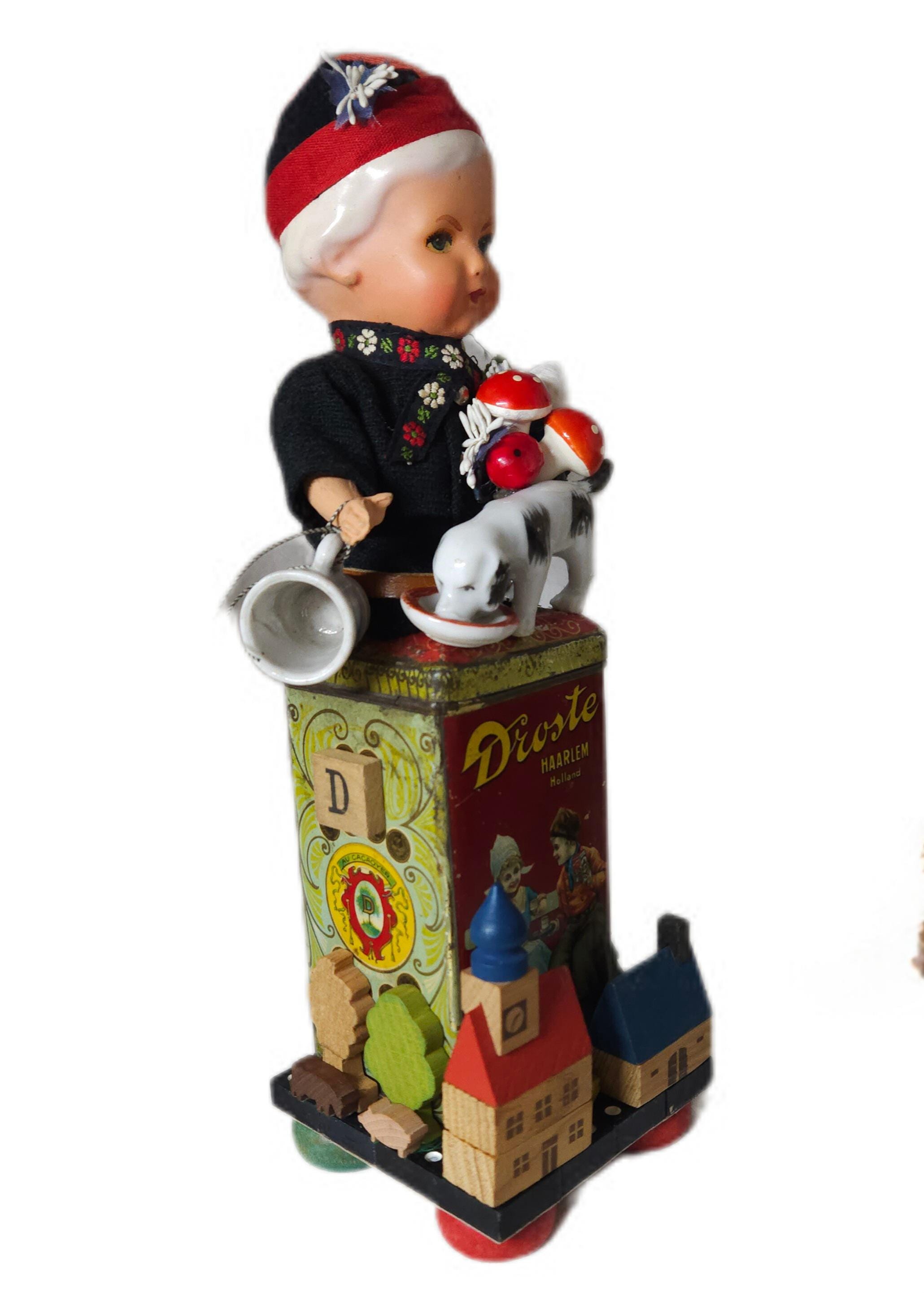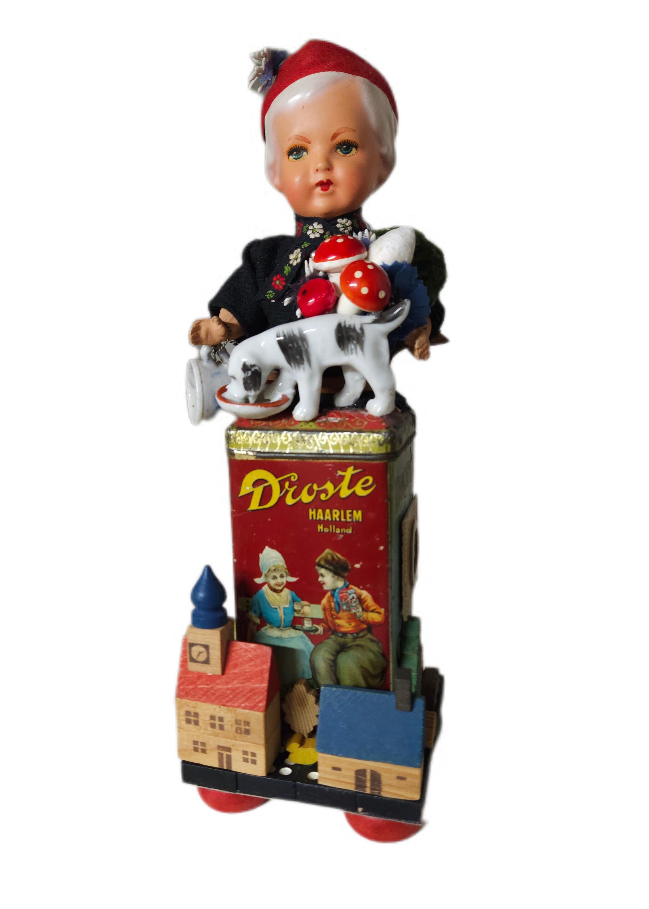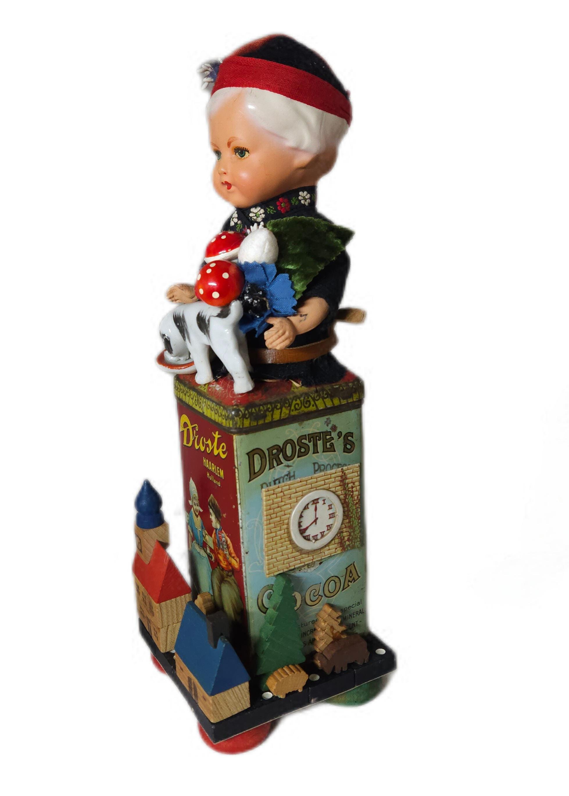 This whimsical assemblage is titled COCOA ANYONE. A vintage Dutch boy doll paired up perfectly with a Droste Cocoa tin. The base is vintage dominos with German wooden putz houses and trees around the edge.He holds a mushroom and velvet leaf bunch in his arm. A sweet vintage ceramic dog sits in front .