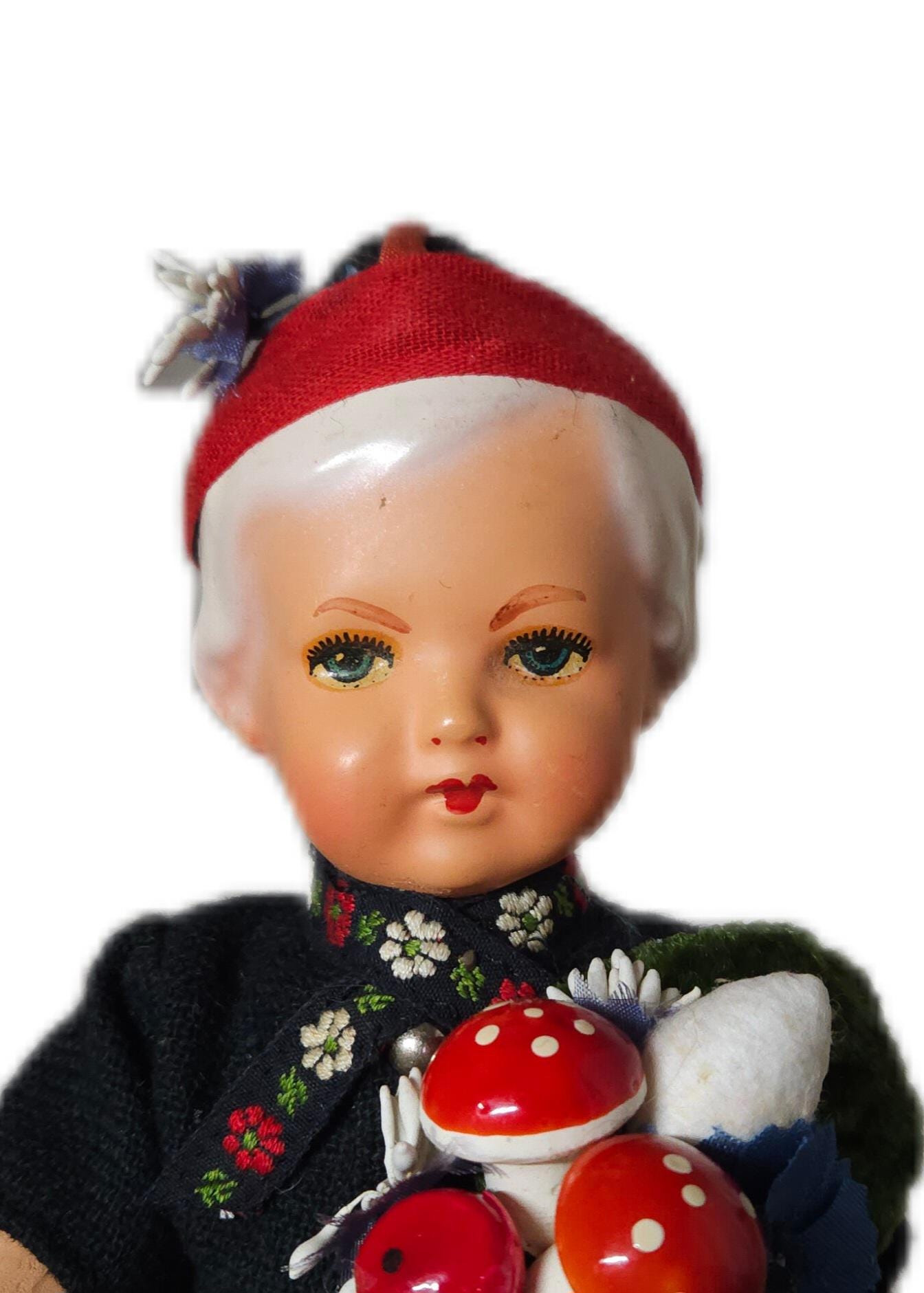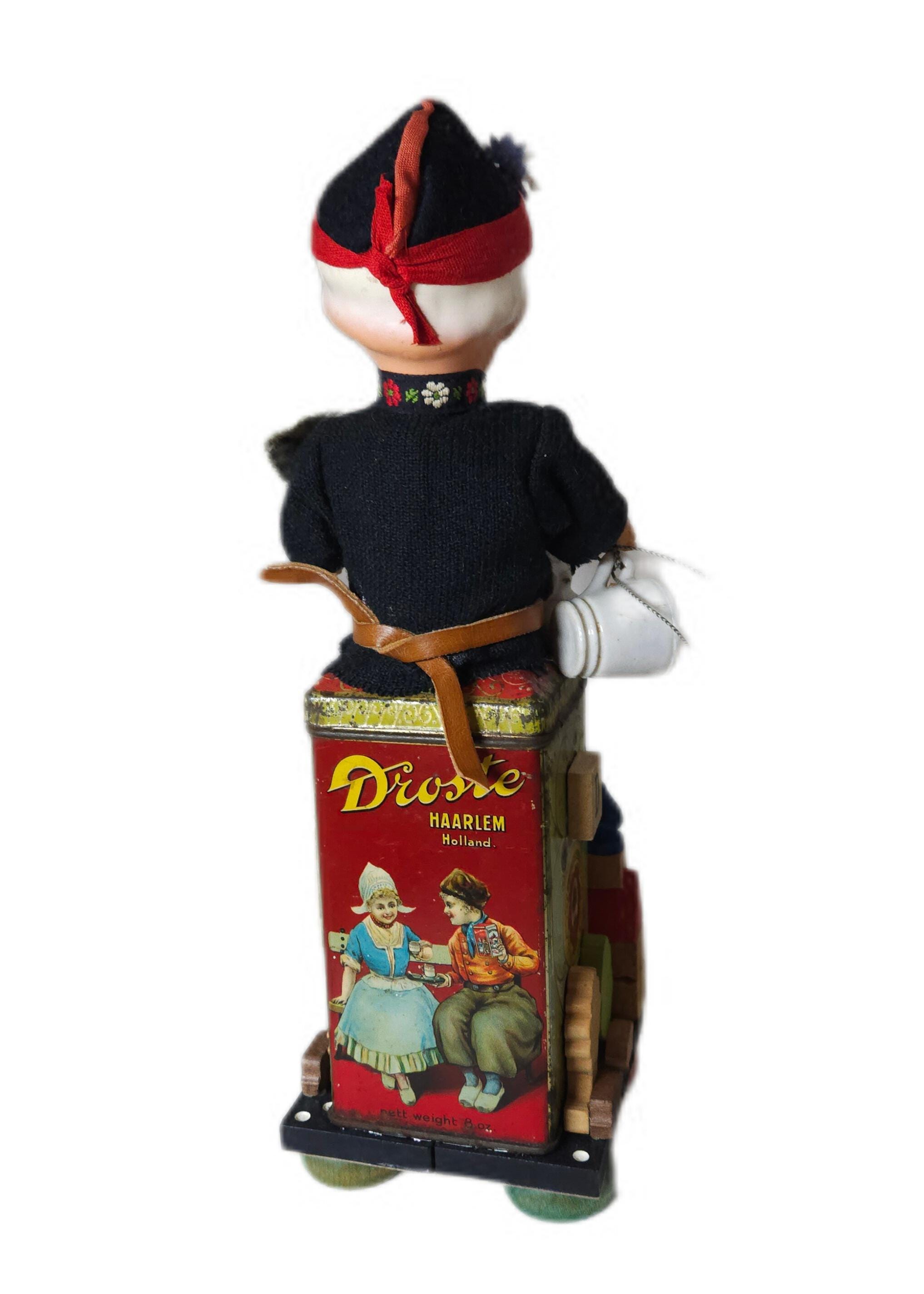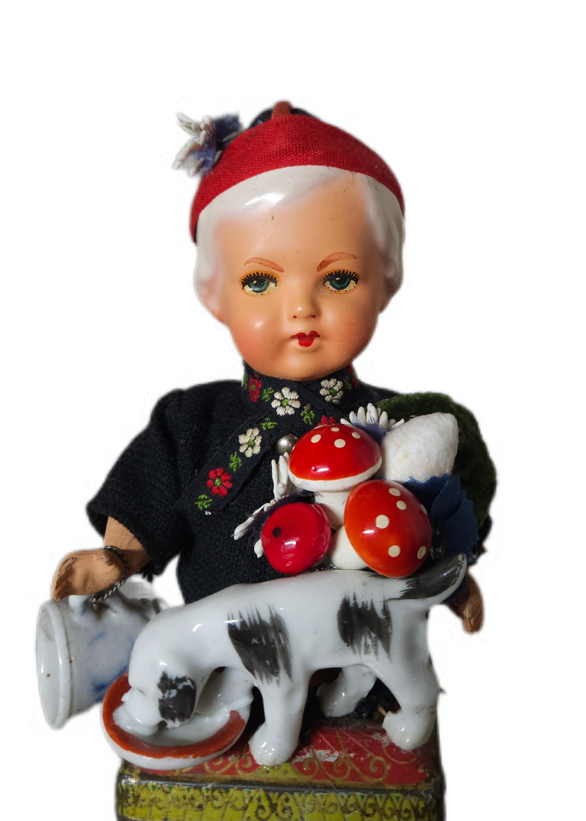 This whimsical assemblage is titled COCOA ANYONE. A vintage Dutch boy doll paired up perfectly with a Droste Cocoa tin. The base is vintage dominos with German wooden putz houses and trees around the edge.He holds a mushroom and velvet leaf bunch in his arm. A sweet vintage ceramic dog sits in front .