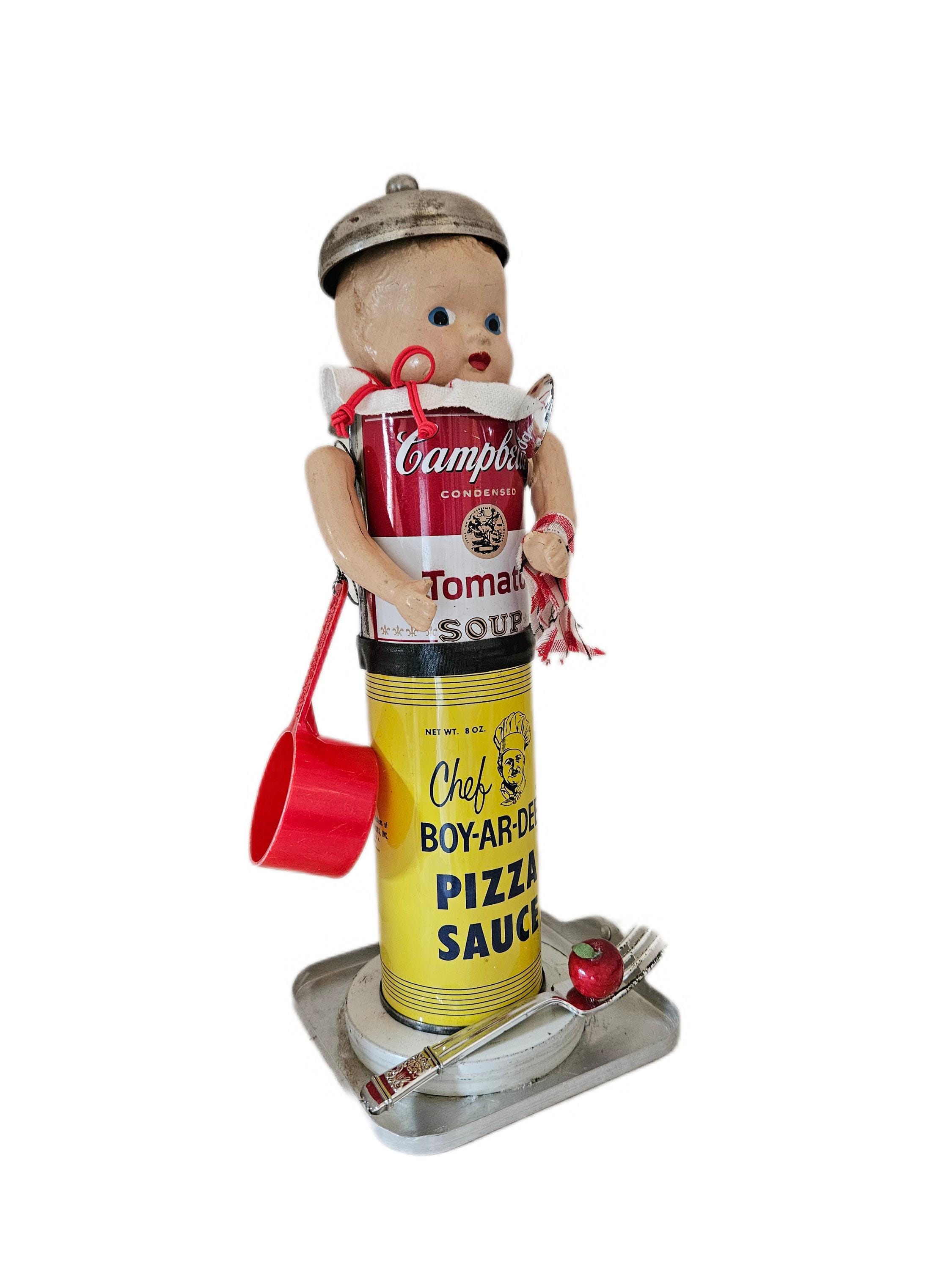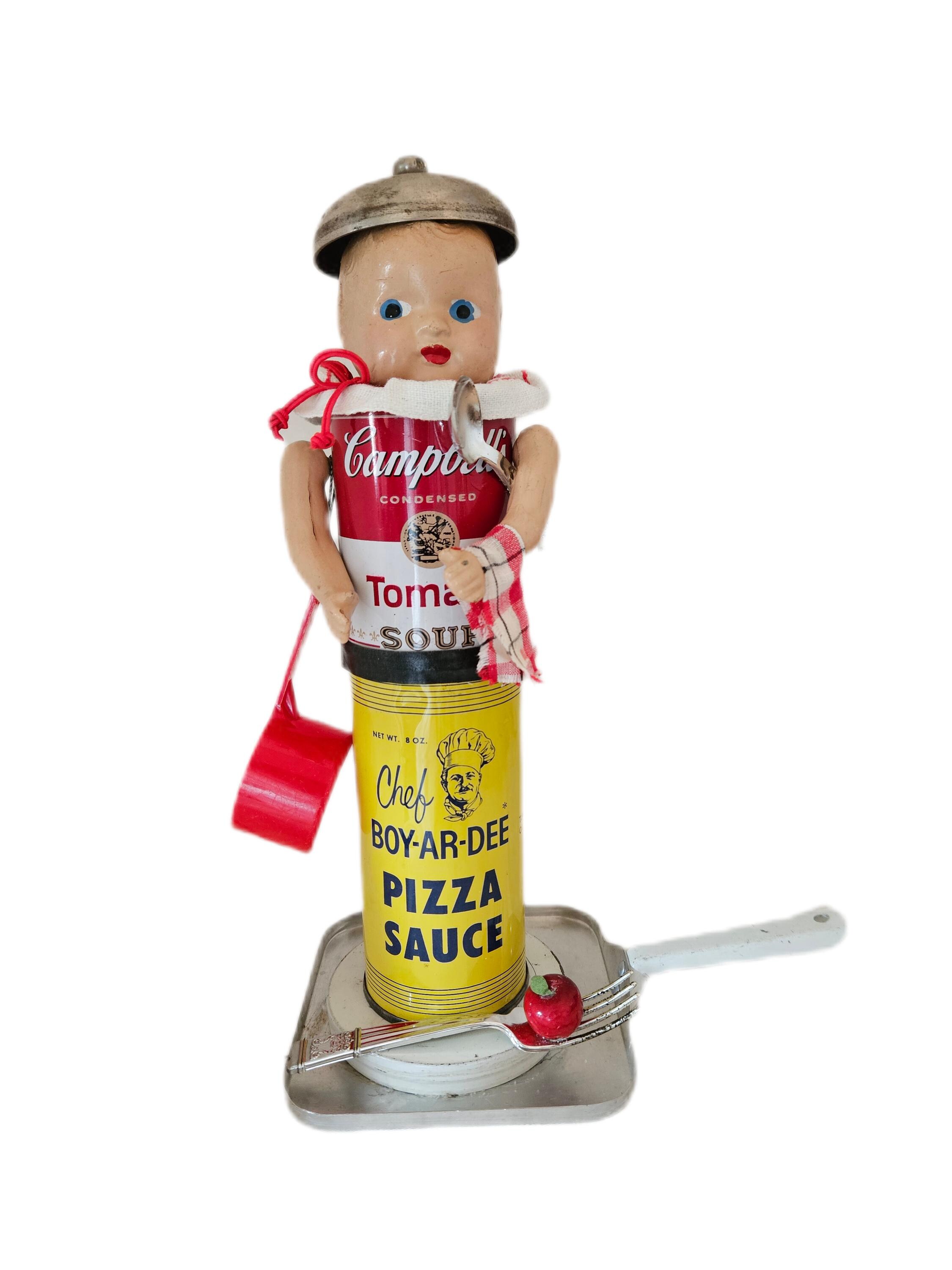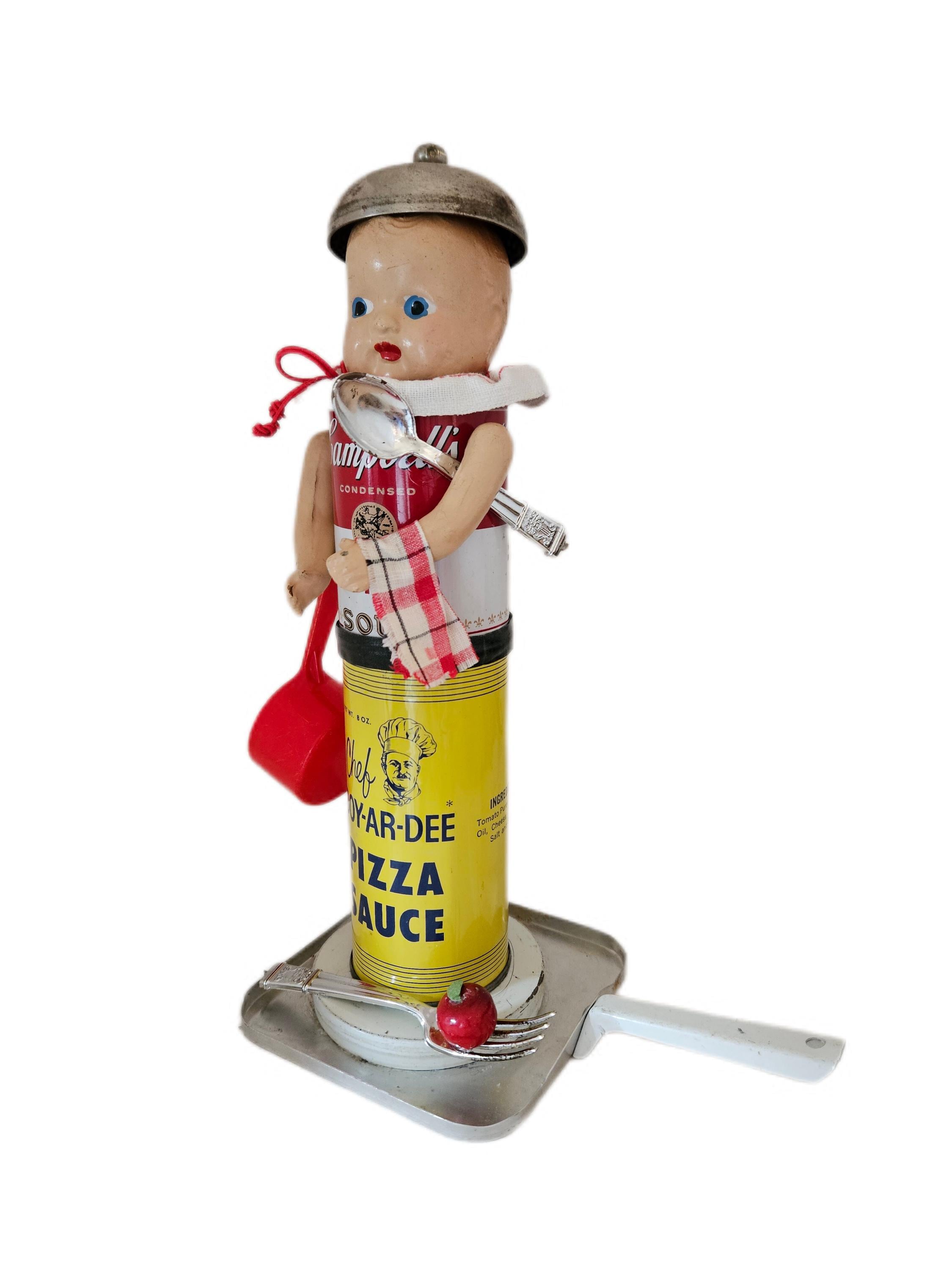 Vintage doll head with 2 food tins for the body. The base is a kids play frying pan. The hat is a clock part.