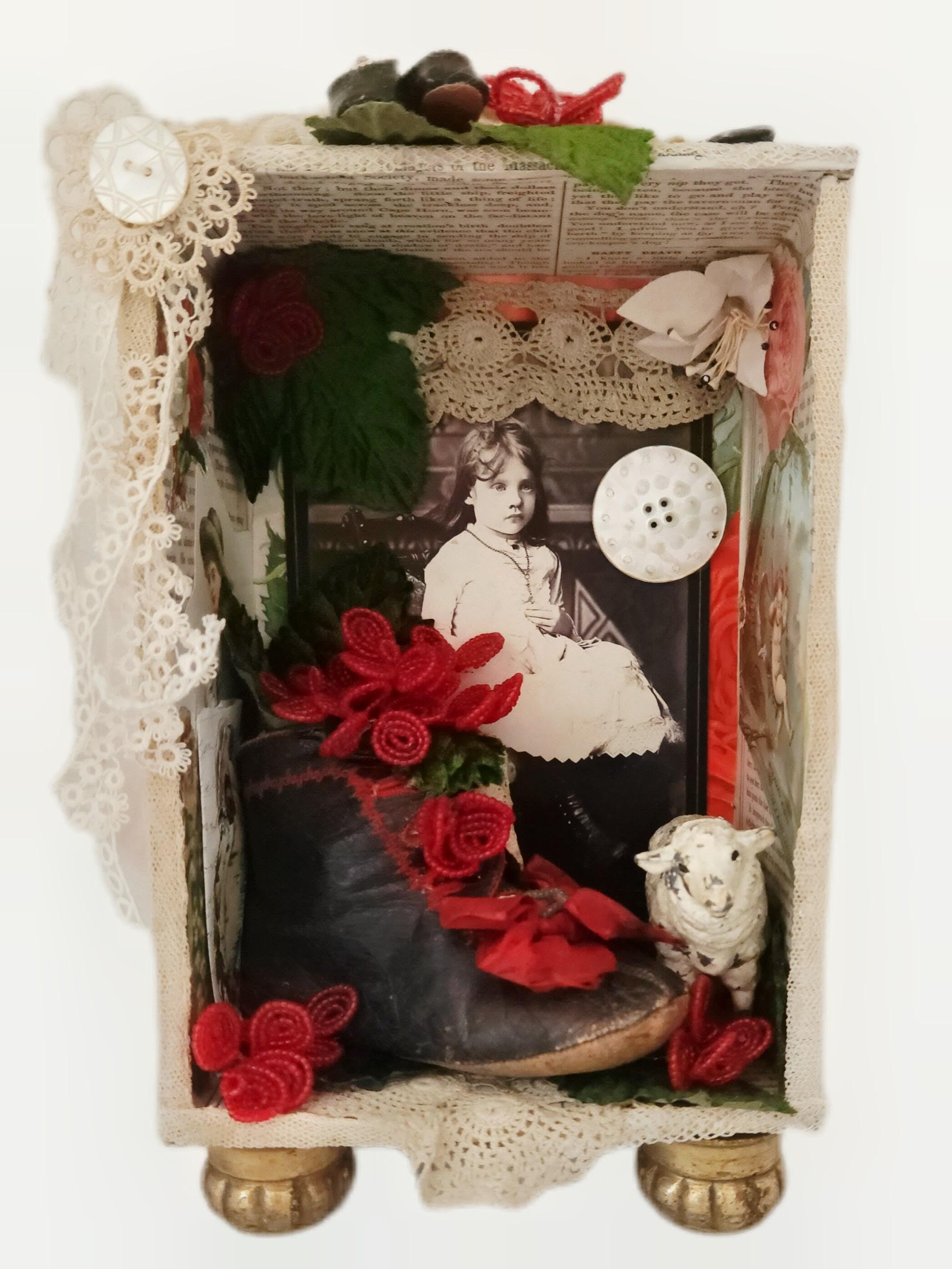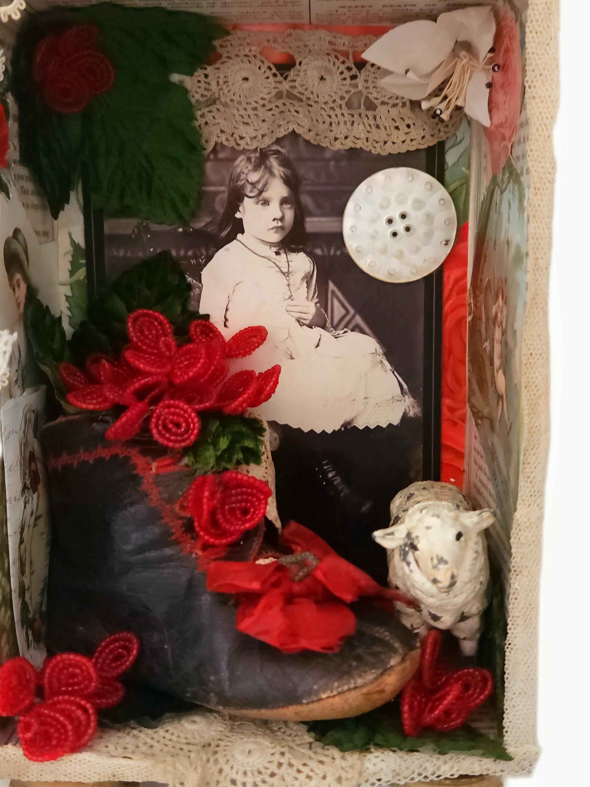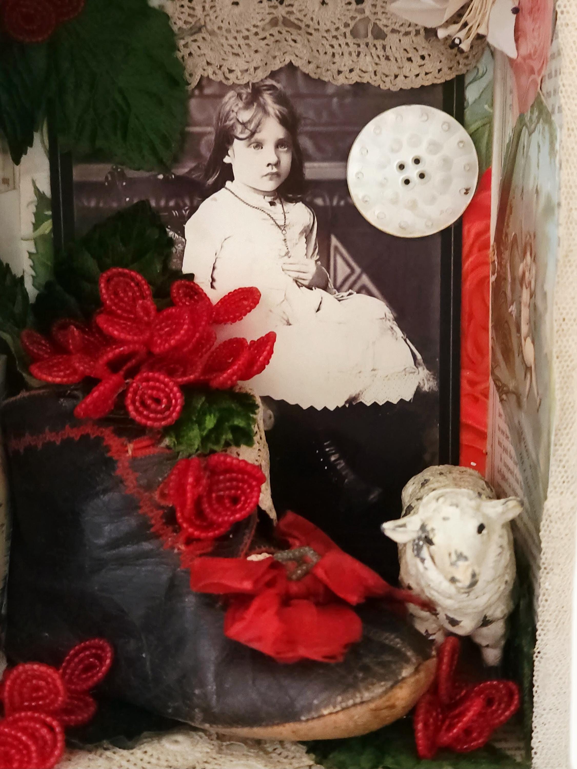 Inside: a Victorian-era original photograph of a solemn little girl, a genuine antique baby shoe blooming with French beaded flowers and velvet millinery leaves, a small antique metal lamb, mother-of-pearl buttons, delicate antique lace, 19th-century book pages, and a pair of tiny doll shoes presiding over the whole affair from above. The background layers antique ephemera and the soft wreckage of old text.
