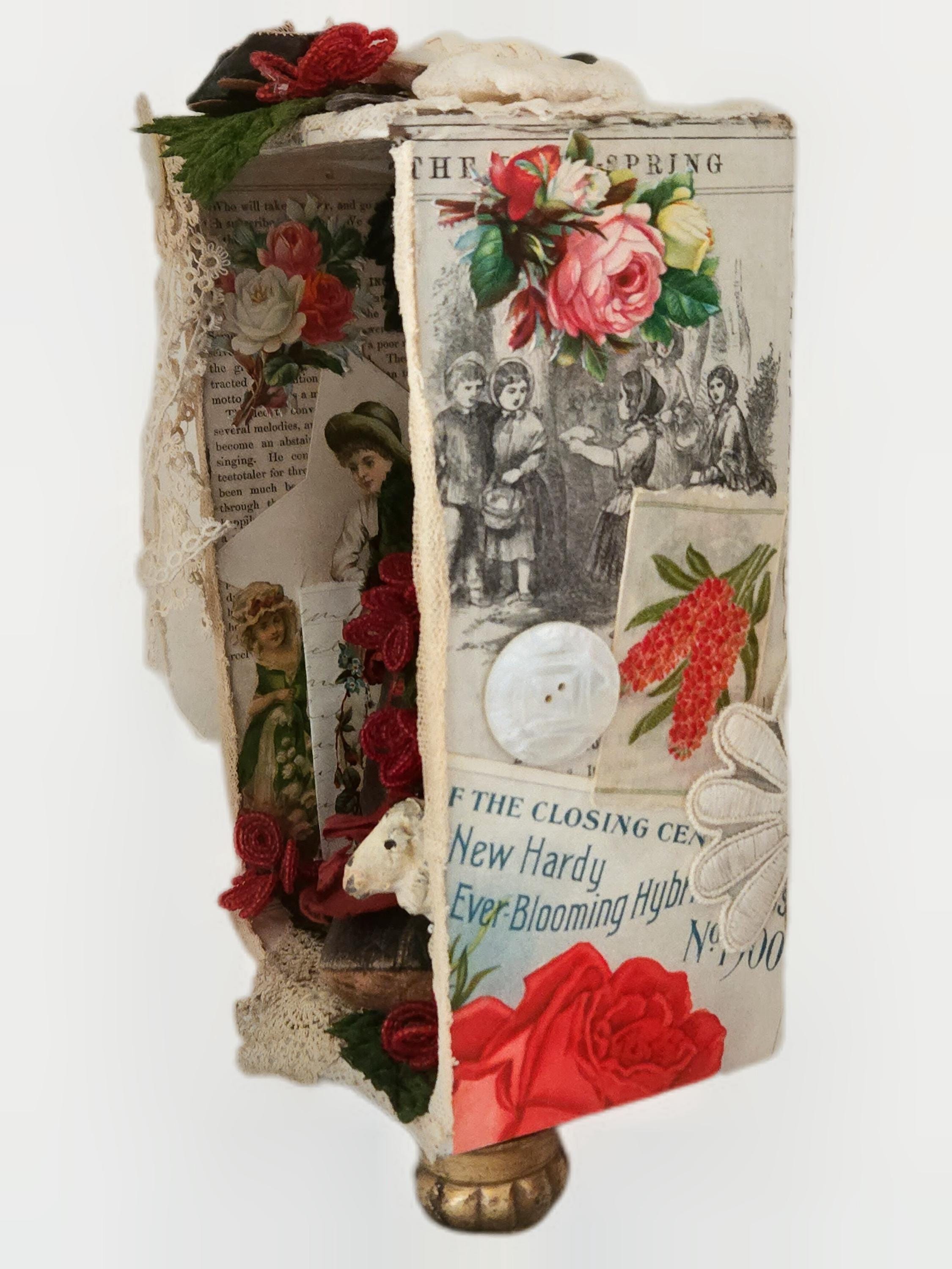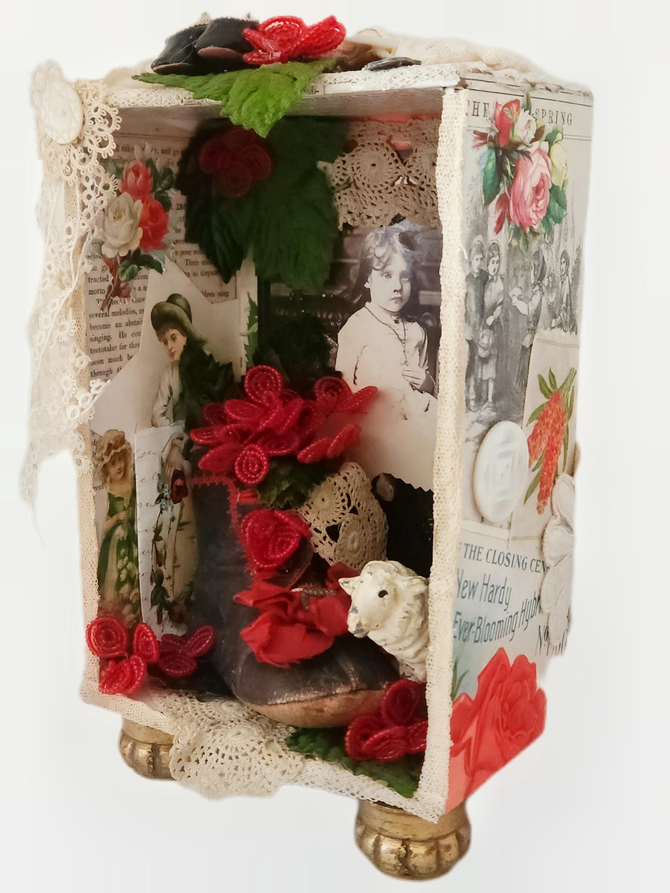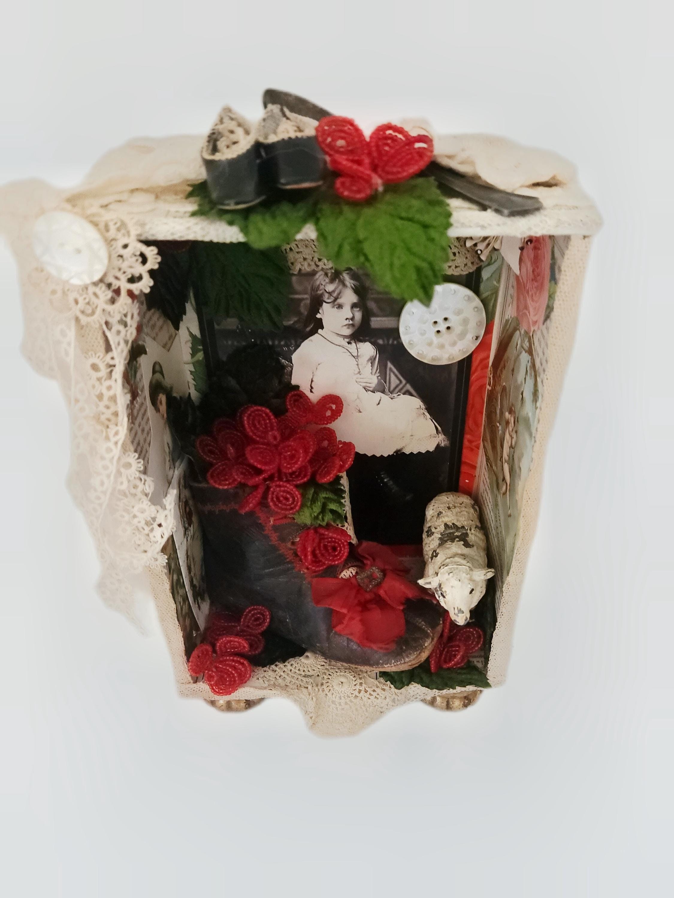 Inside: a Victorian-era original photograph of a solemn little girl, a genuine antique baby shoe blooming with French beaded flowers and velvet millinery leaves, a small antique metal lamb, mother-of-pearl buttons, delicate antique lace, 19th-century book pages, and a pair of tiny doll shoes presiding over the whole affair from above. The background layers antique ephemera and the soft wreckage of old text.