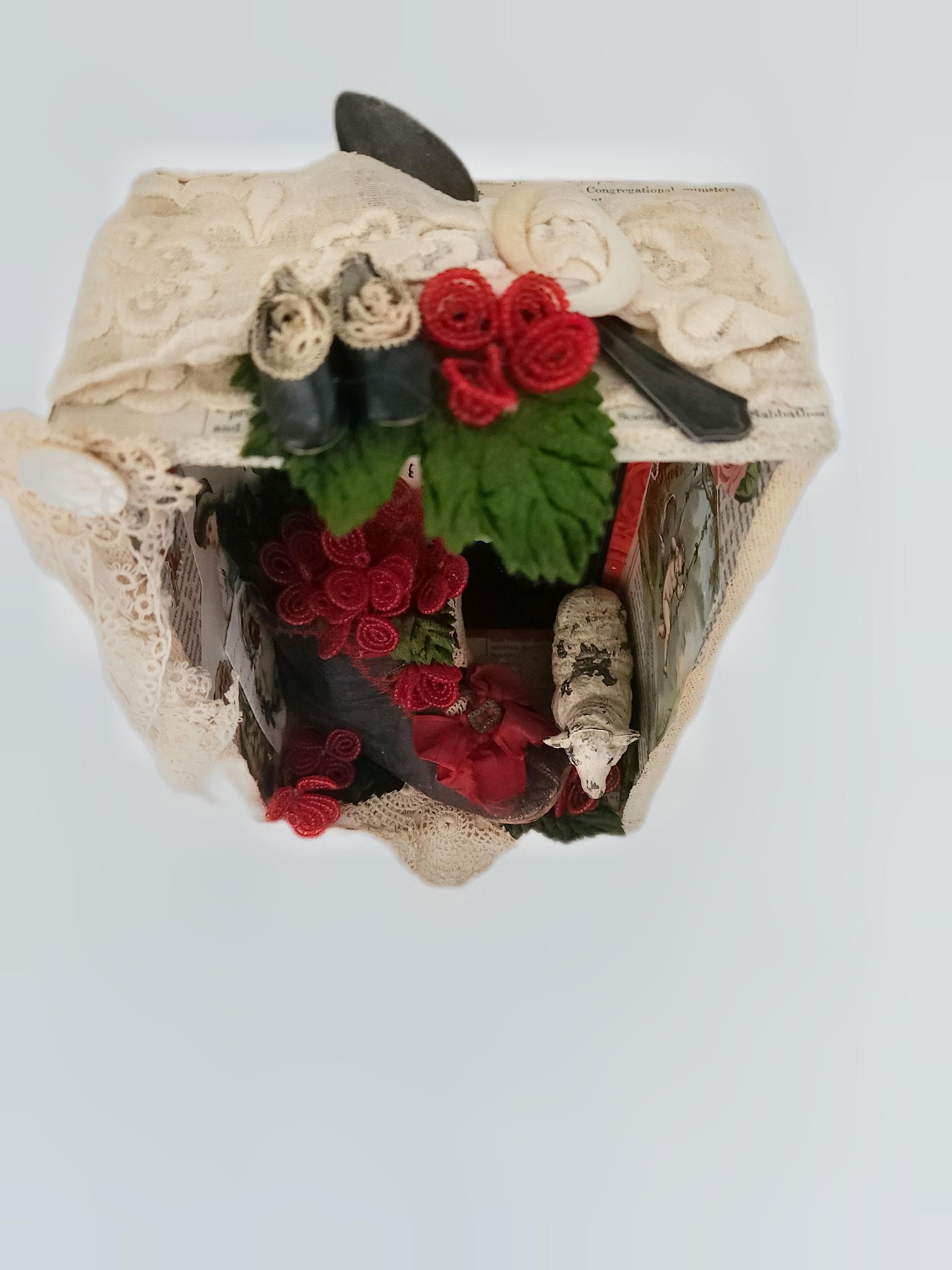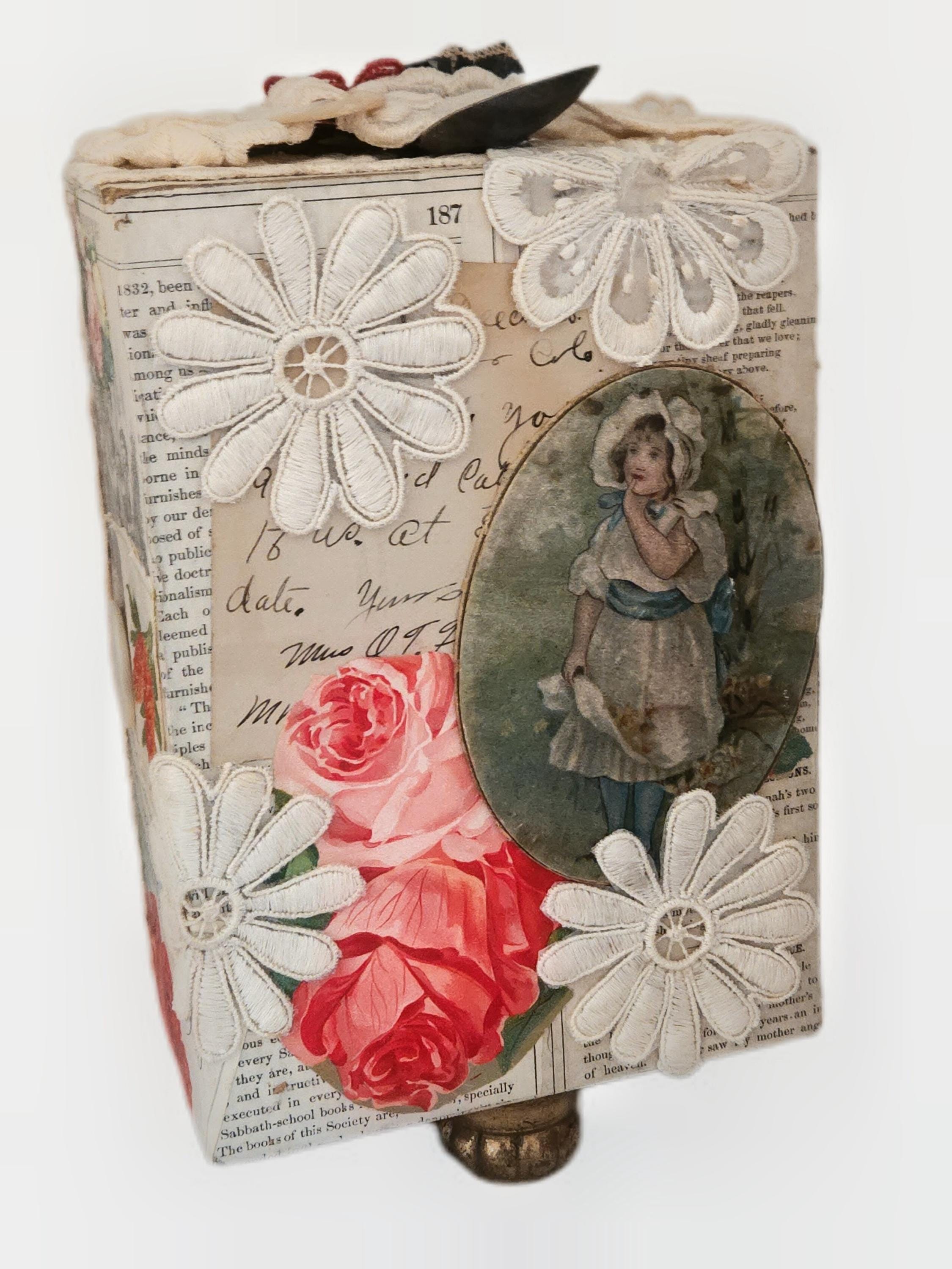 *Portrait of a Girl Who Kept Secrets* is an original assemblage artwork housed in a wood cigar box fitted with antique metal hardware feet — the kind of piece that looks like it was discovered in a very particular grandmother's attic and should probably not be disturbed. Standing 10" tall and 8" wide, it holds its contents with the quiet authority of something that has been keeping its own counsel for a very long time.